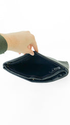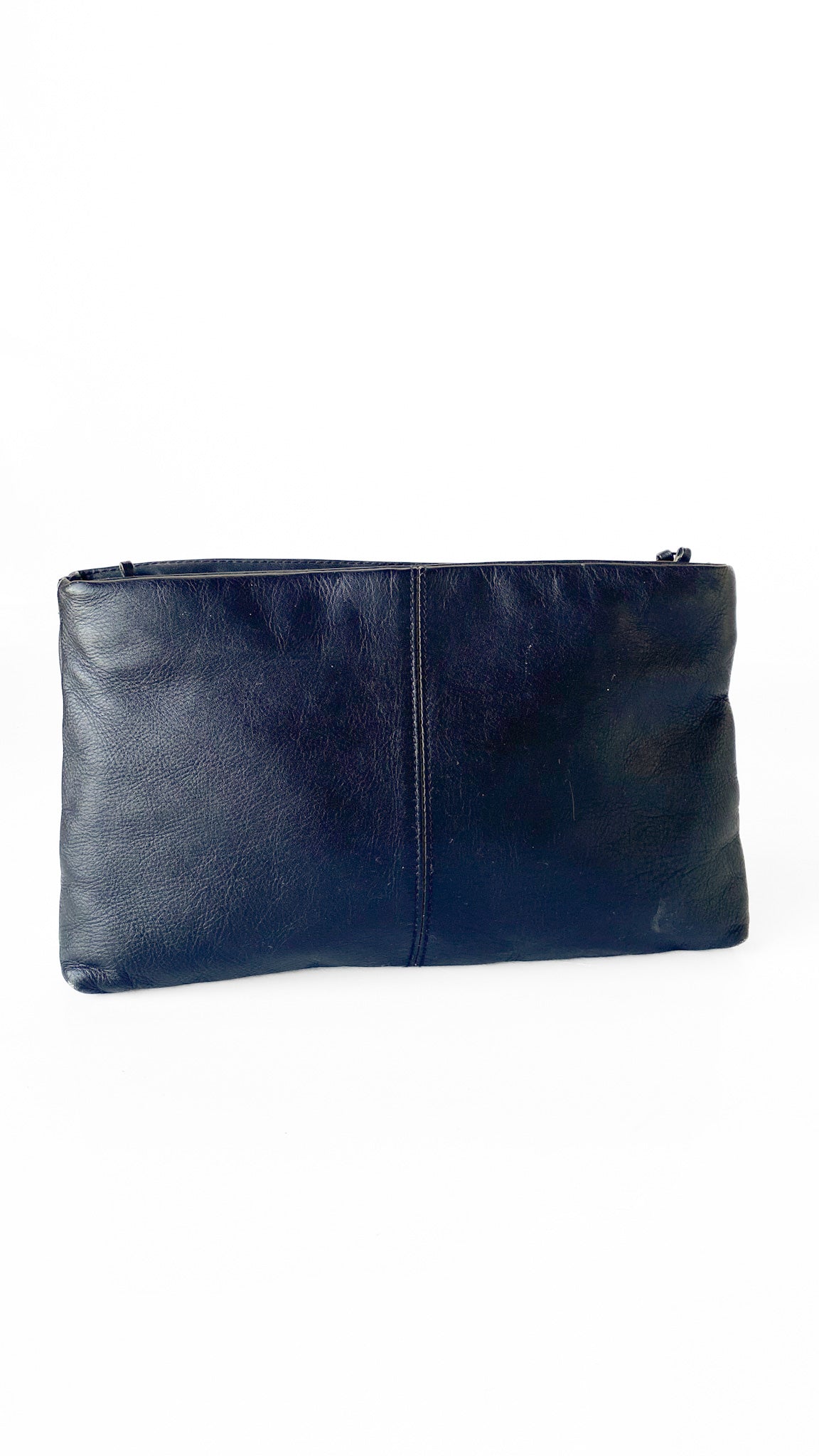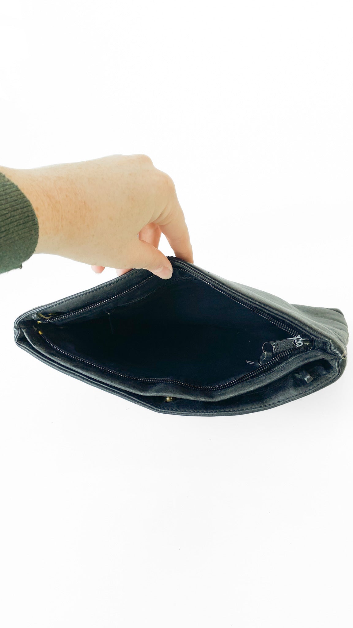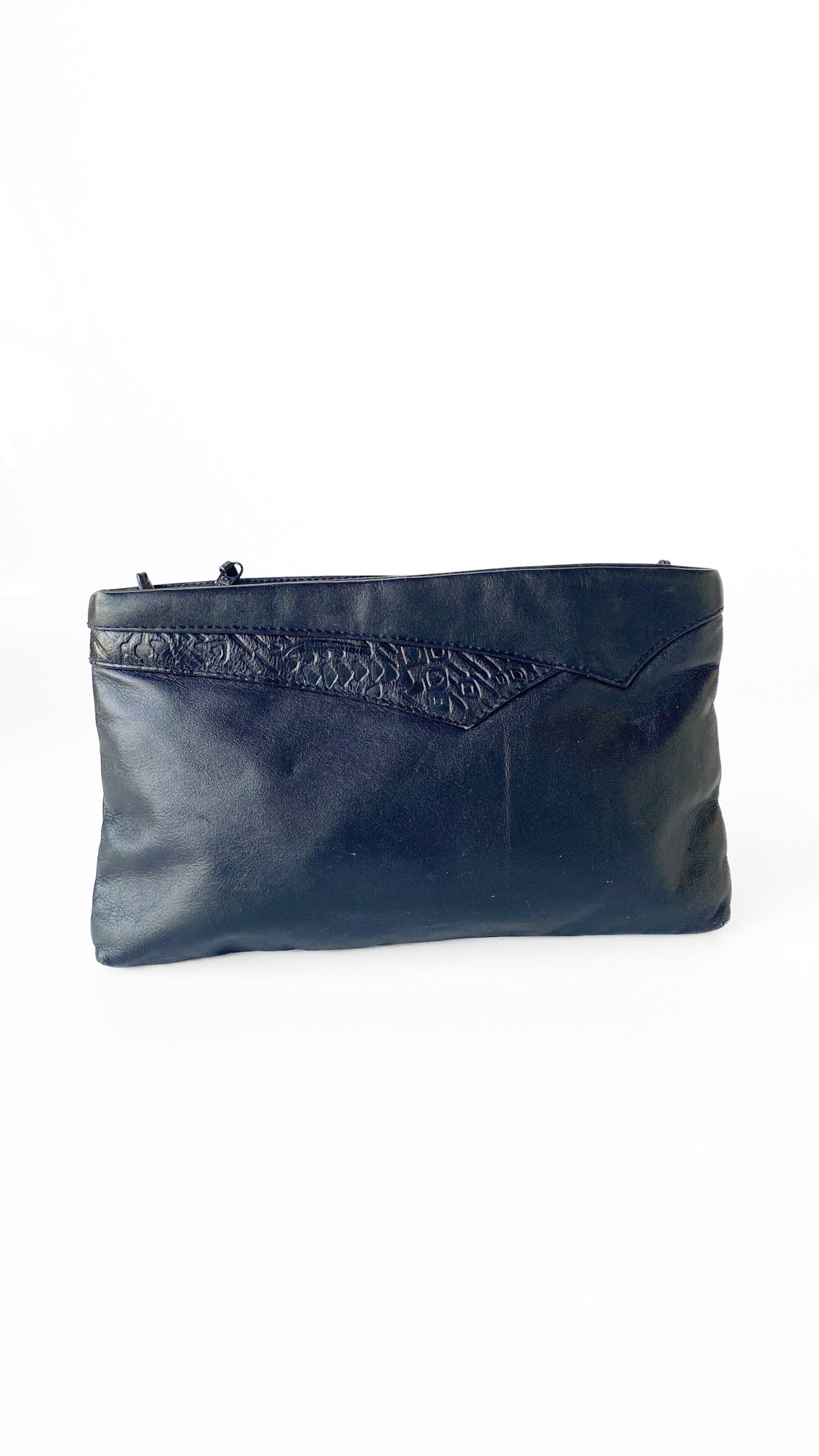 Description: Black leather clutch with textured leather border at top. Purse has two main compartments, one with a zipper closure & one with a snap clasp. Fully lined.