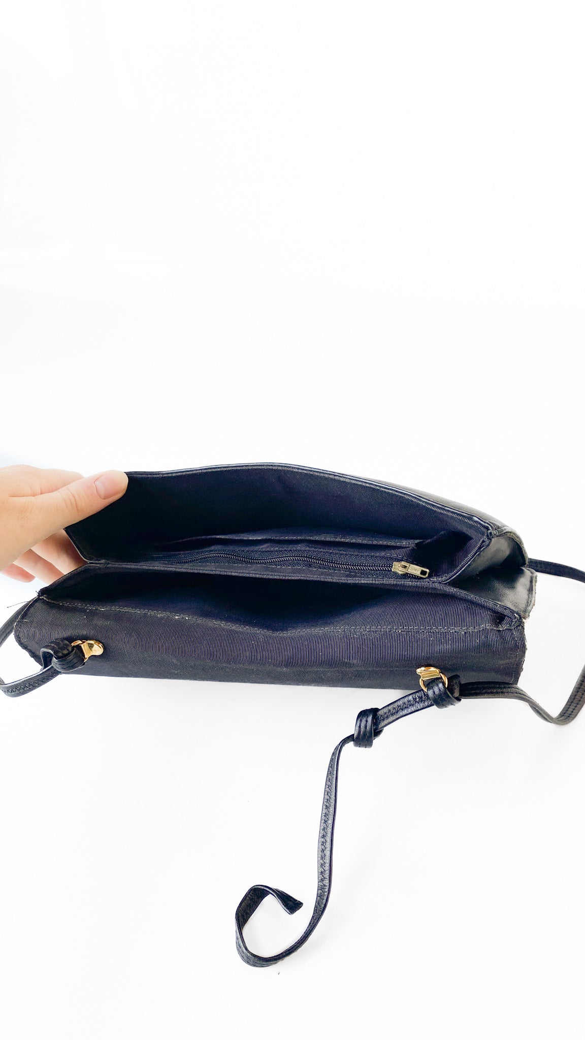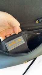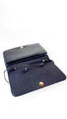 Description: Black & ivory patchwork leather bag with flap closure & magnetic snap clasp. Interior has two main compartments, and is fully lined.