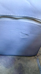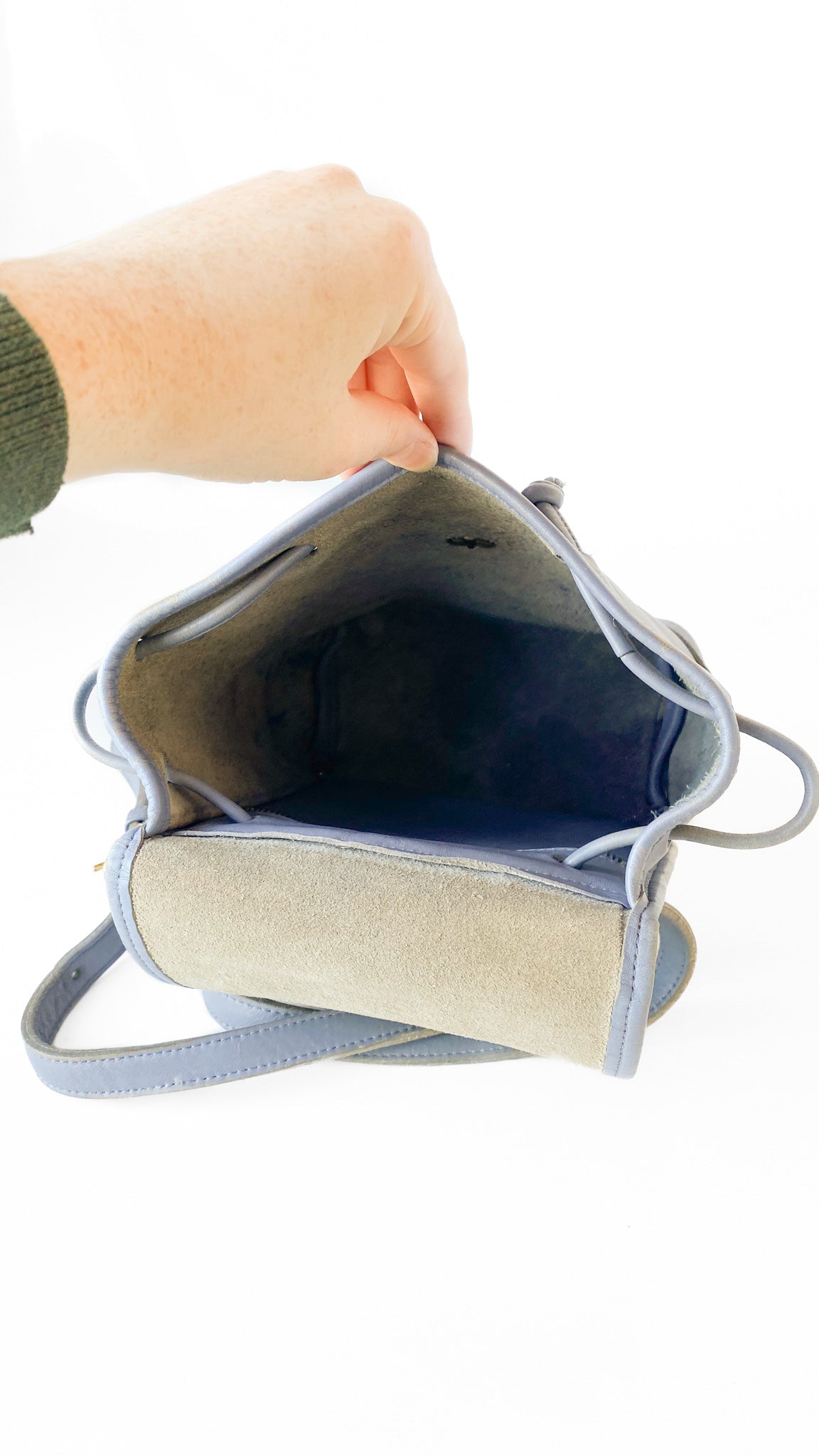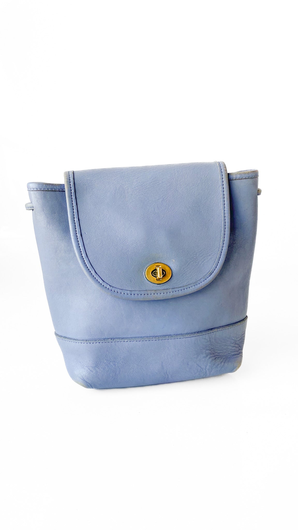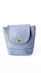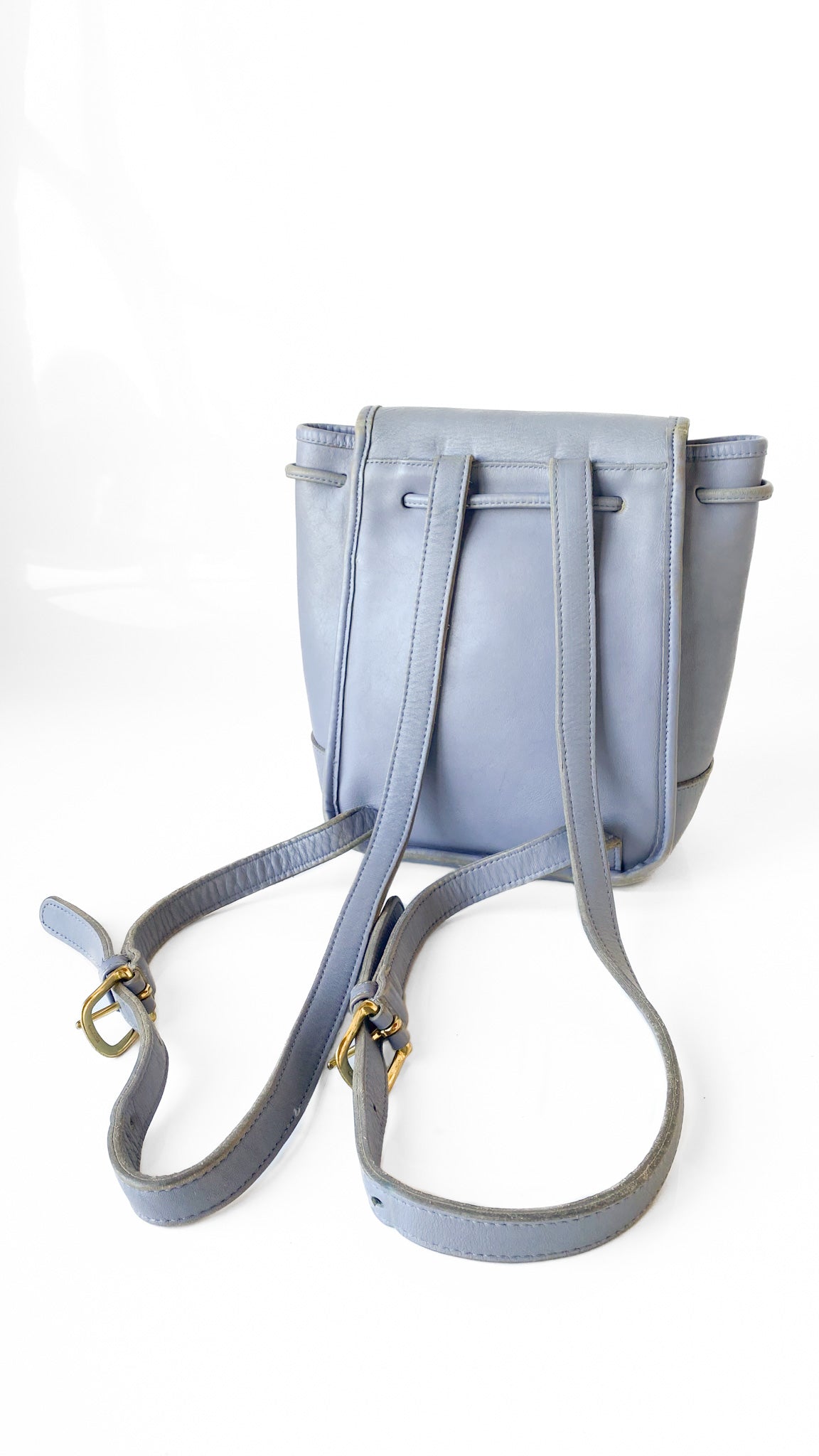 Description: Mini backpack in gorgeous powder blue leather. Has fold-over flap with turn-lock clasp, and drawstring at opening. Backpack straps are adjustable in length. Unlined, with interior zippered pocket.