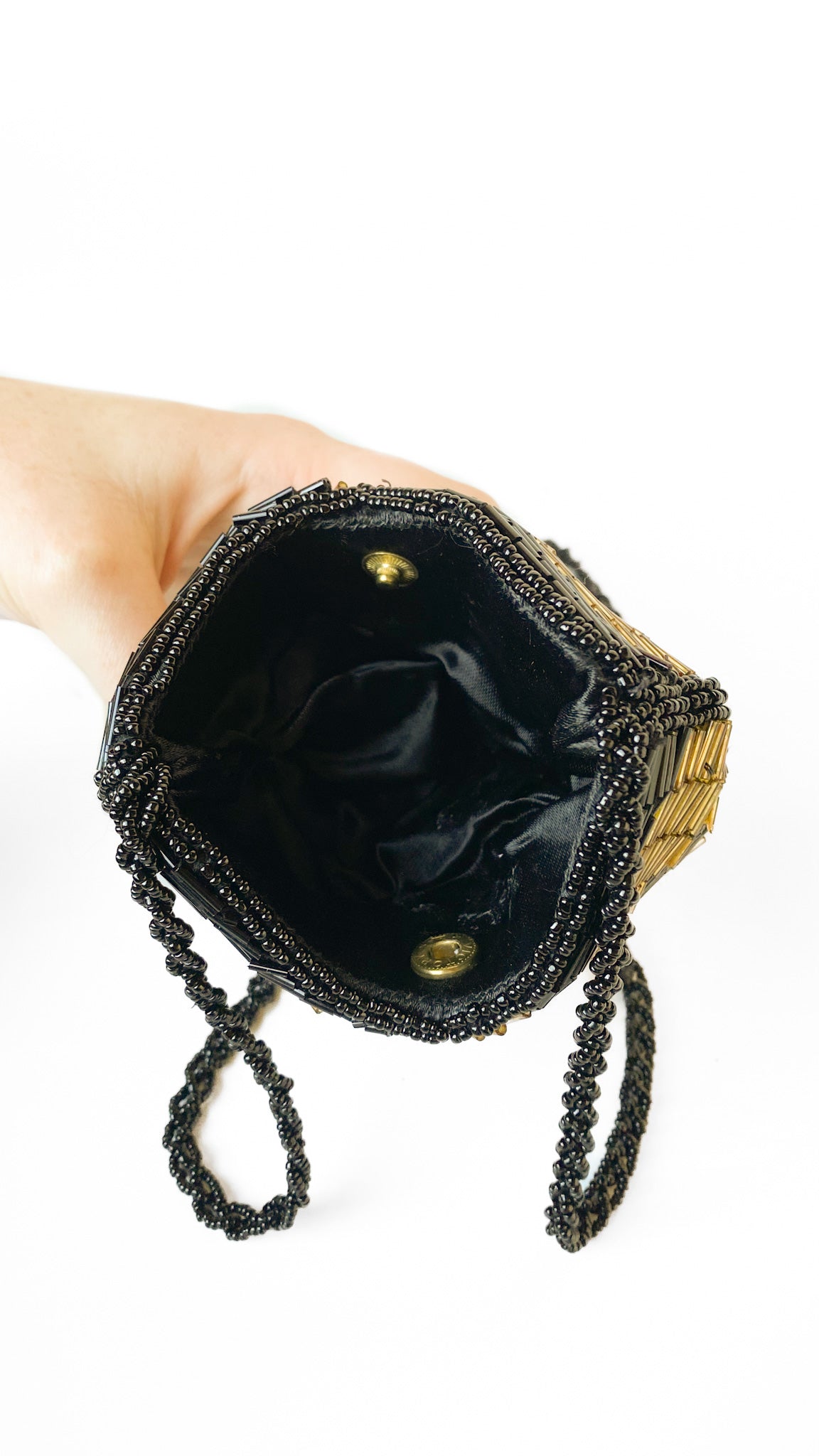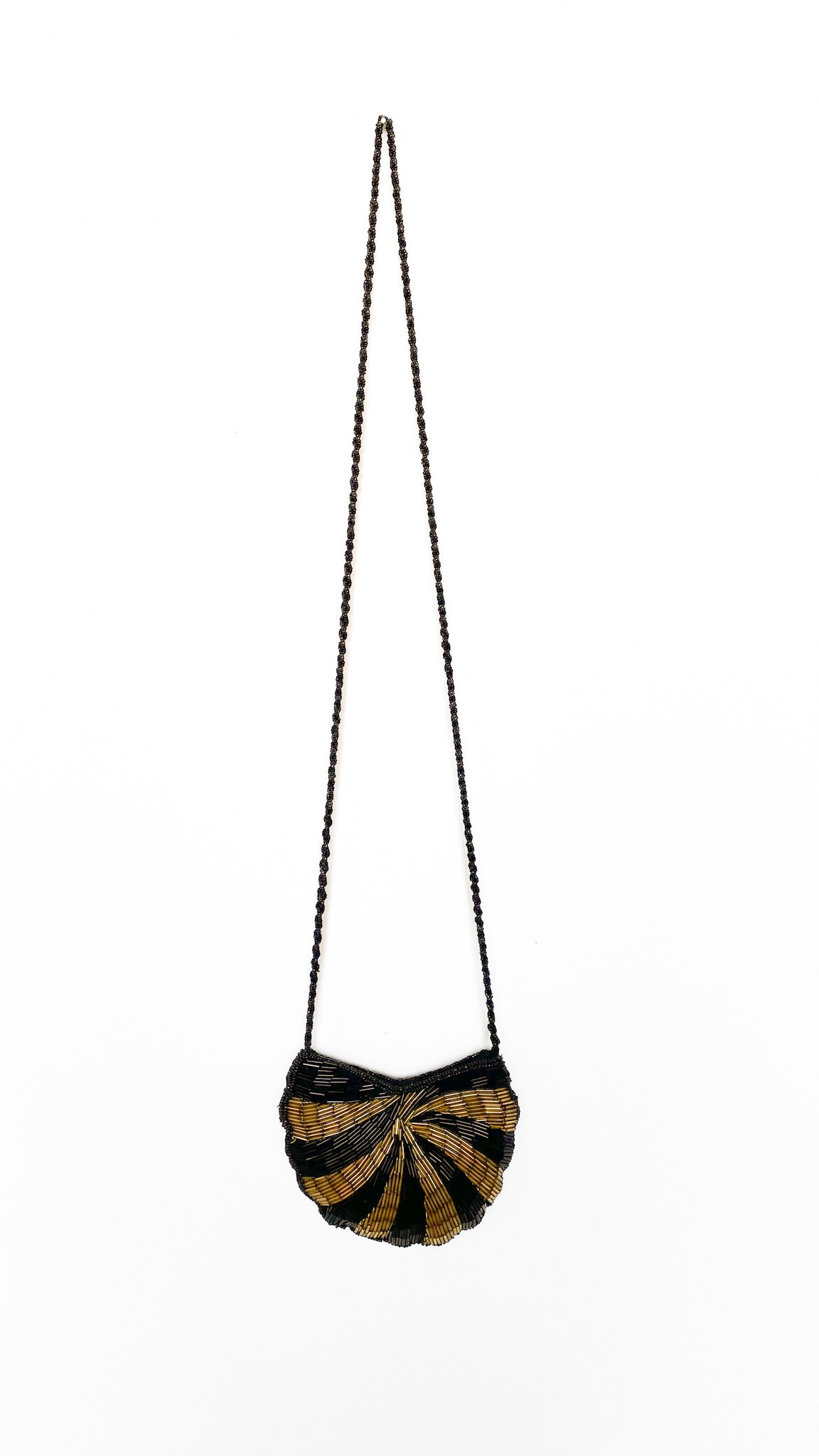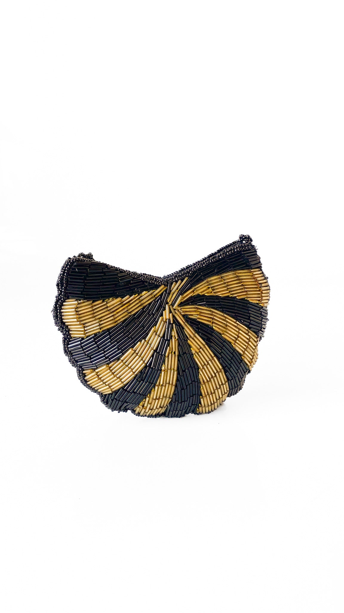 Description: Black & gold beaded bag in shape of shell. Has snap closure & beaded shoulder strap. Interior is fully lined.