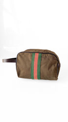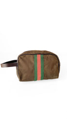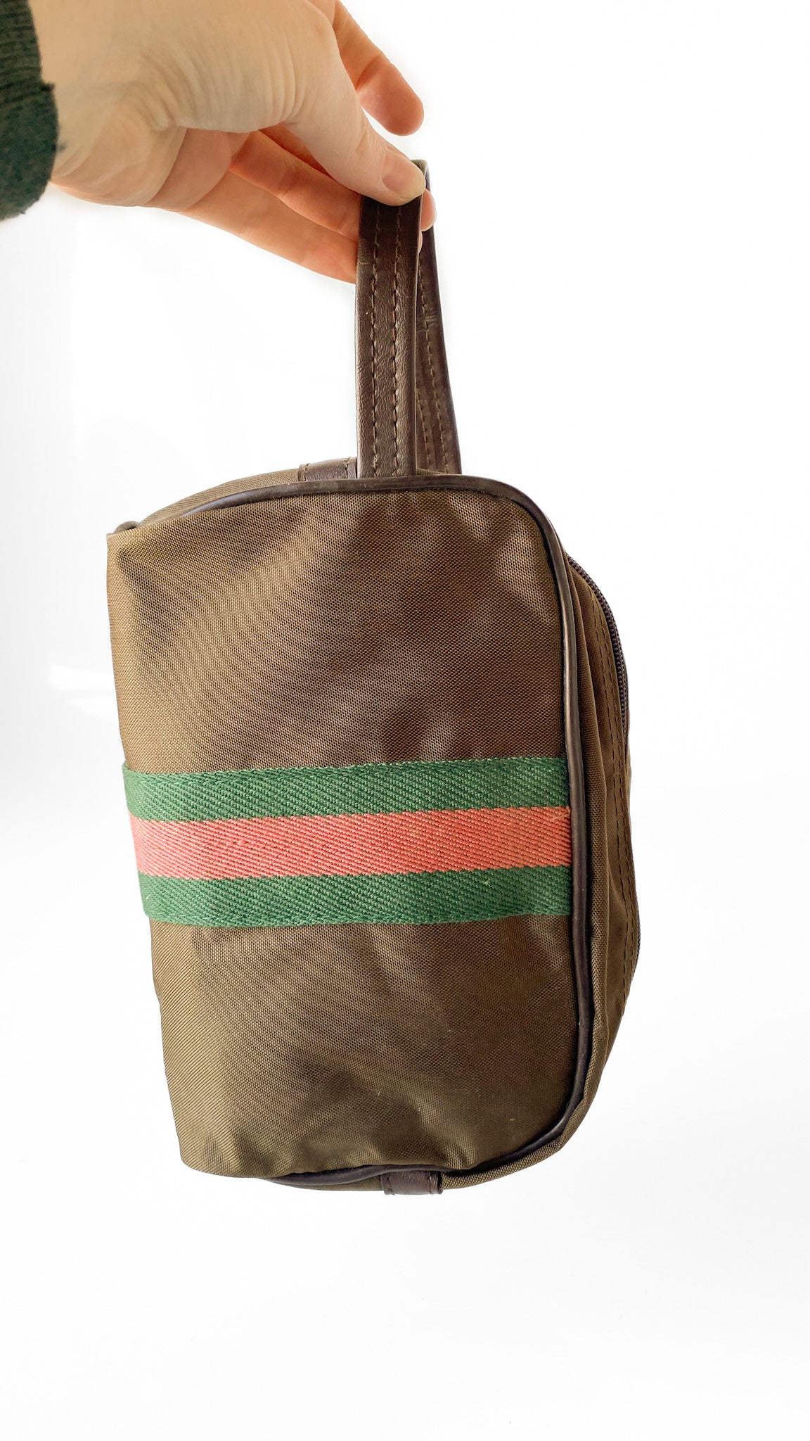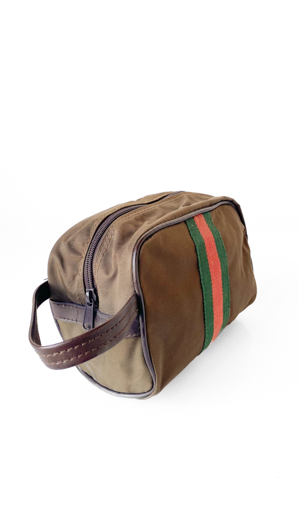 Description: Olive nylon toiletry bag with orange & green stripe down center. Edges bound in vinyl, with faux leather handle. Main compartment has zipper closure, and is unlined.