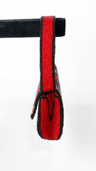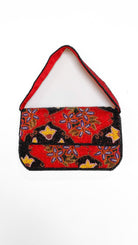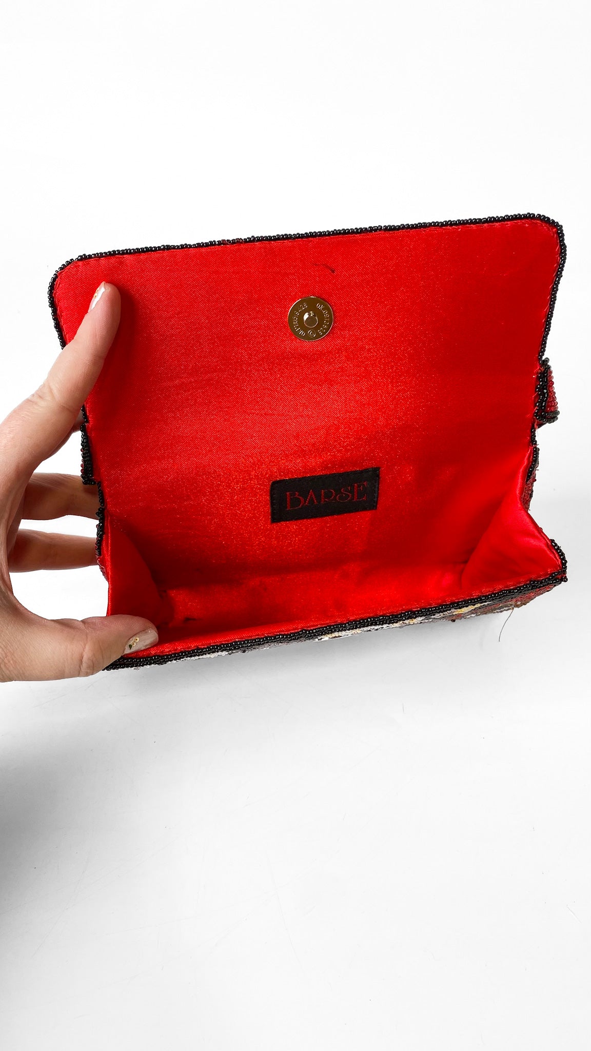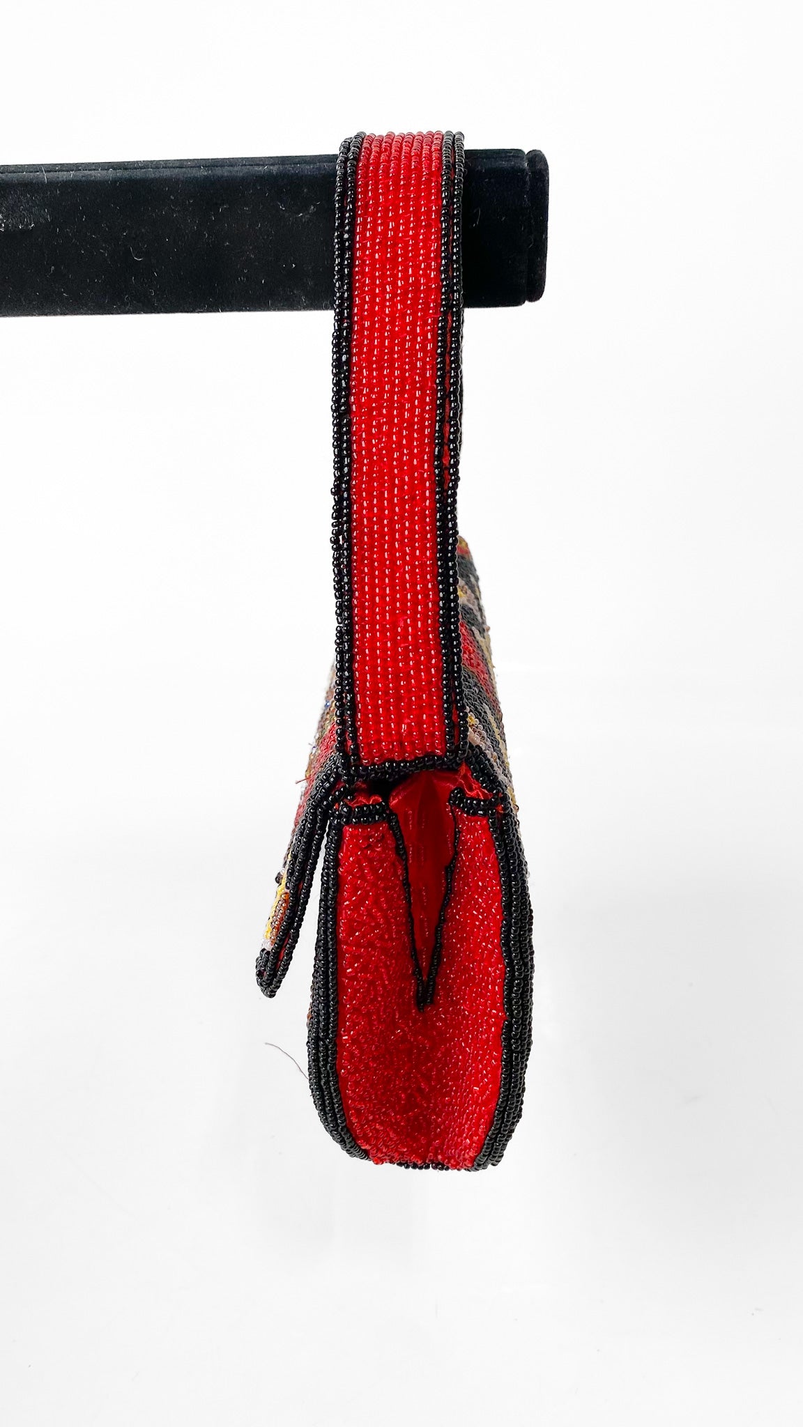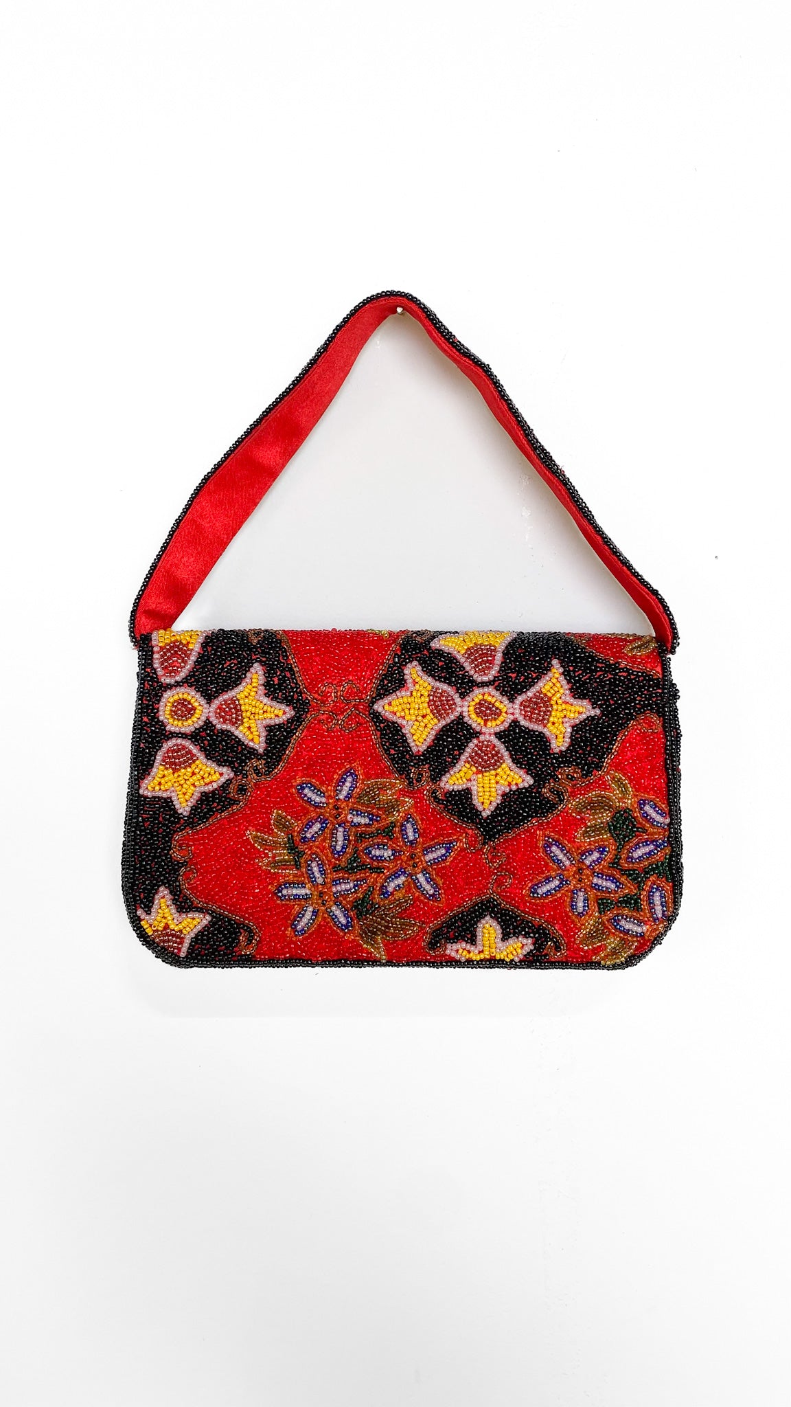 Red, black, yellow, and blue floral beaded hand bag with magnetic snap. Interior lined in red satin fabric.