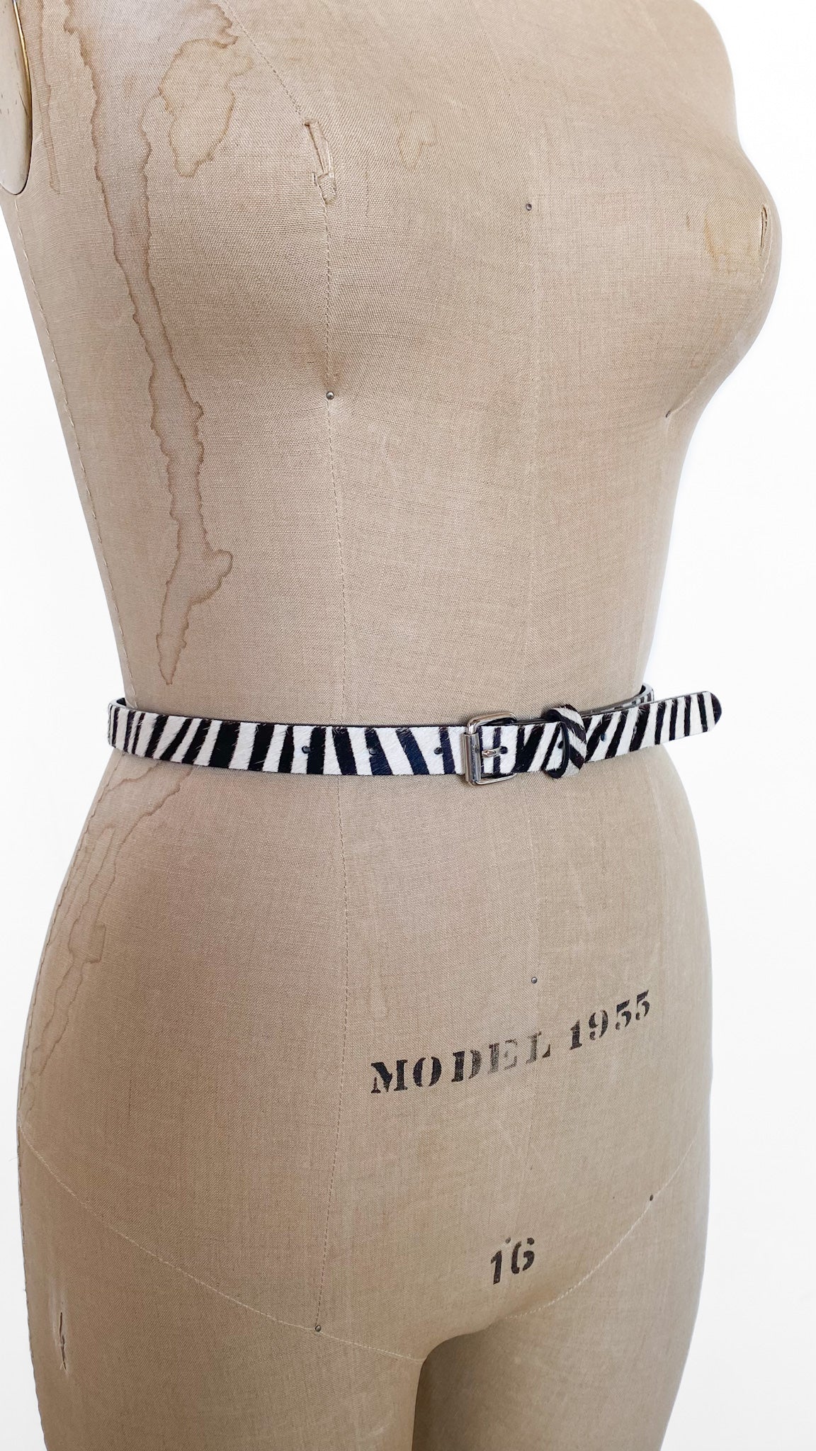 Description: Skinny zebra printed mohair belt with silver hardware.