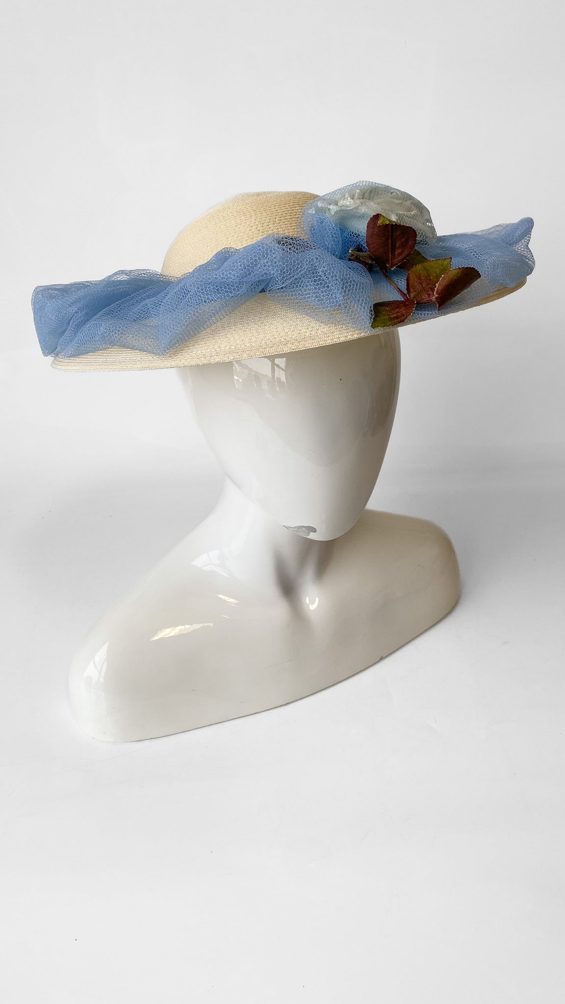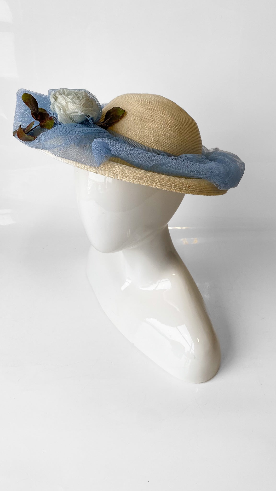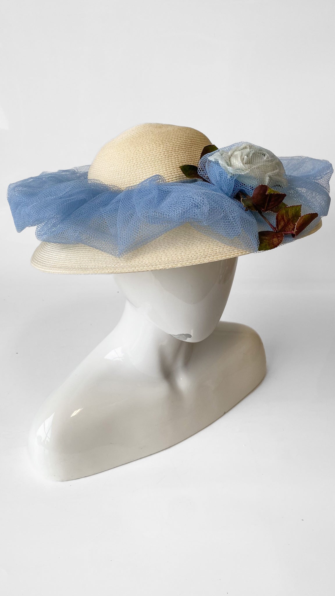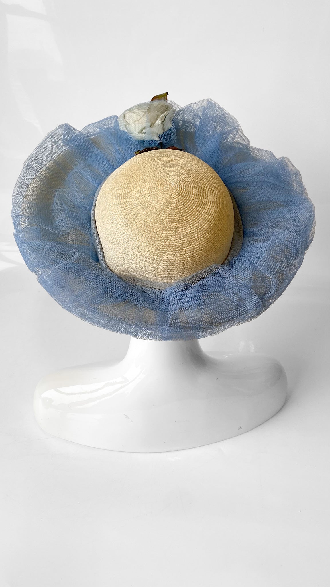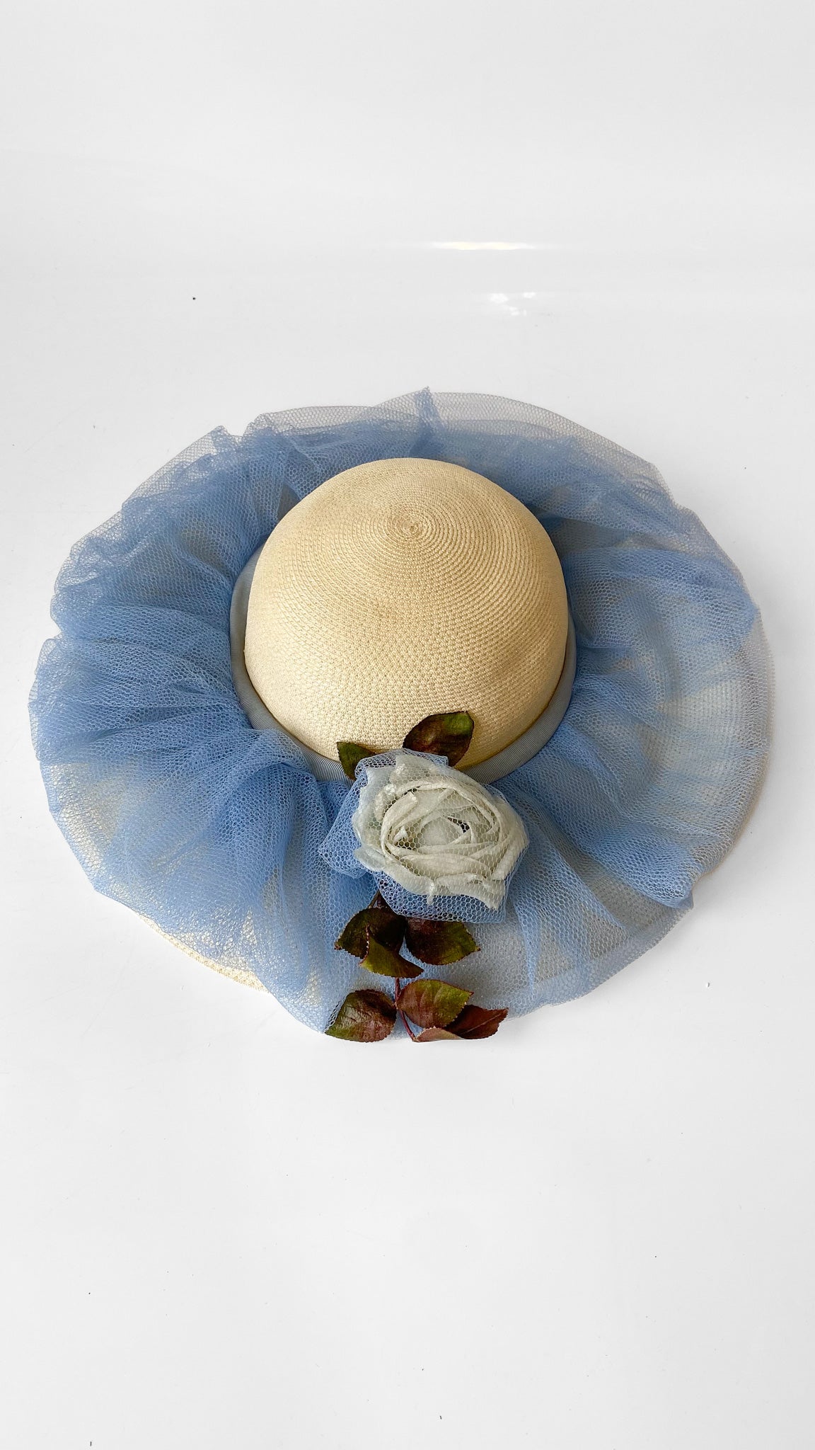 Straw cartwheel style sun hat with cornflower blue tulle netting around the circumference of the hat. White faux carnation encased in blue tulle at the center.