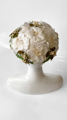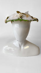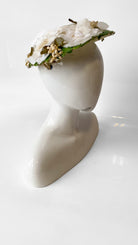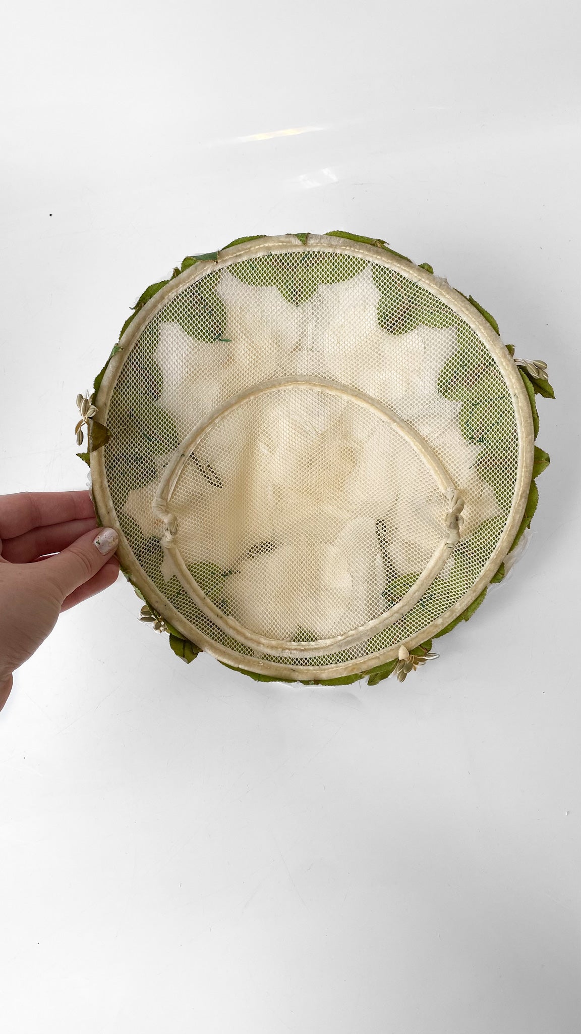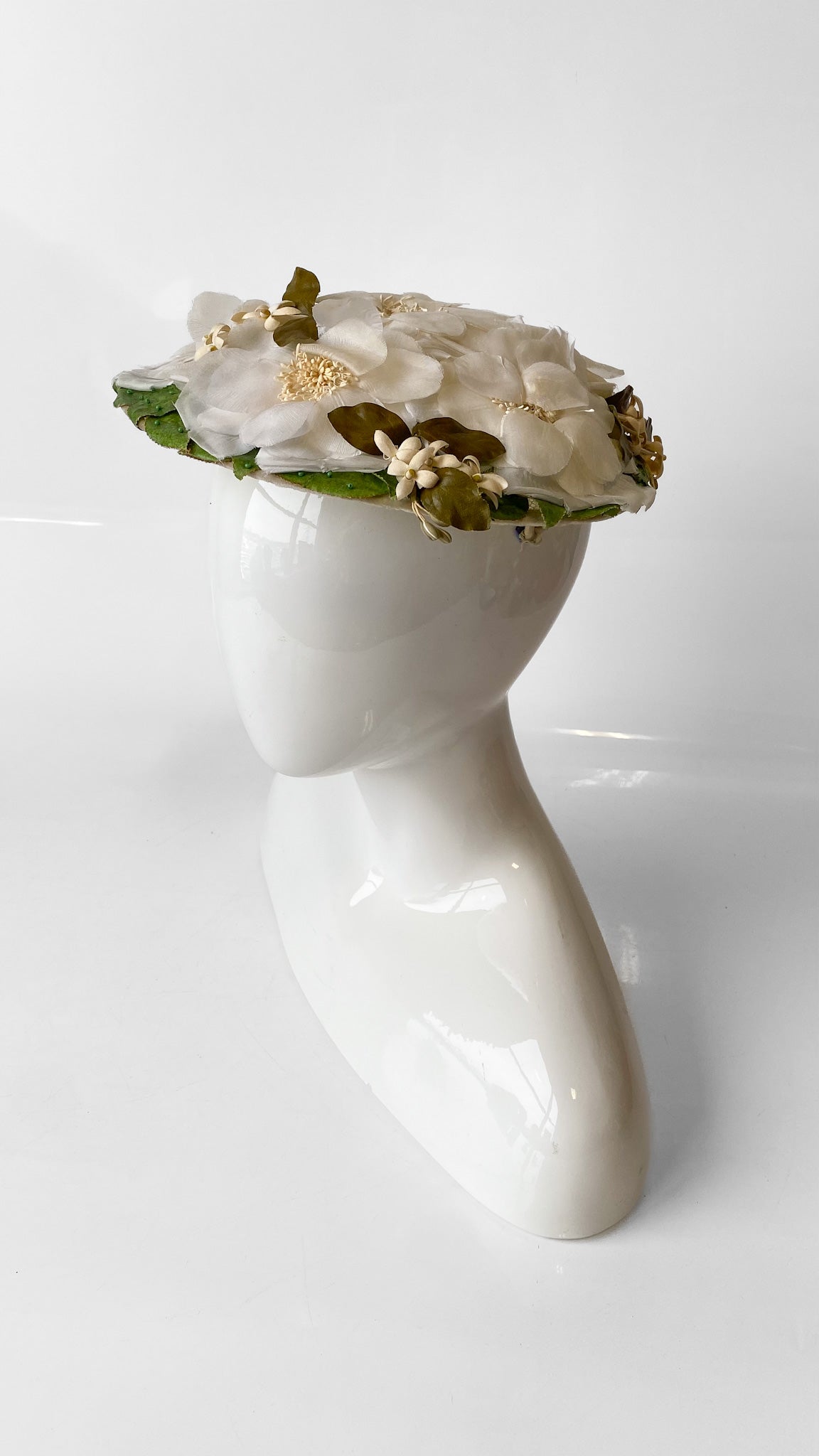 White faux flower cartwheel style hat with additional bunches of faux flowers and leaves around edge, some subtle beading.