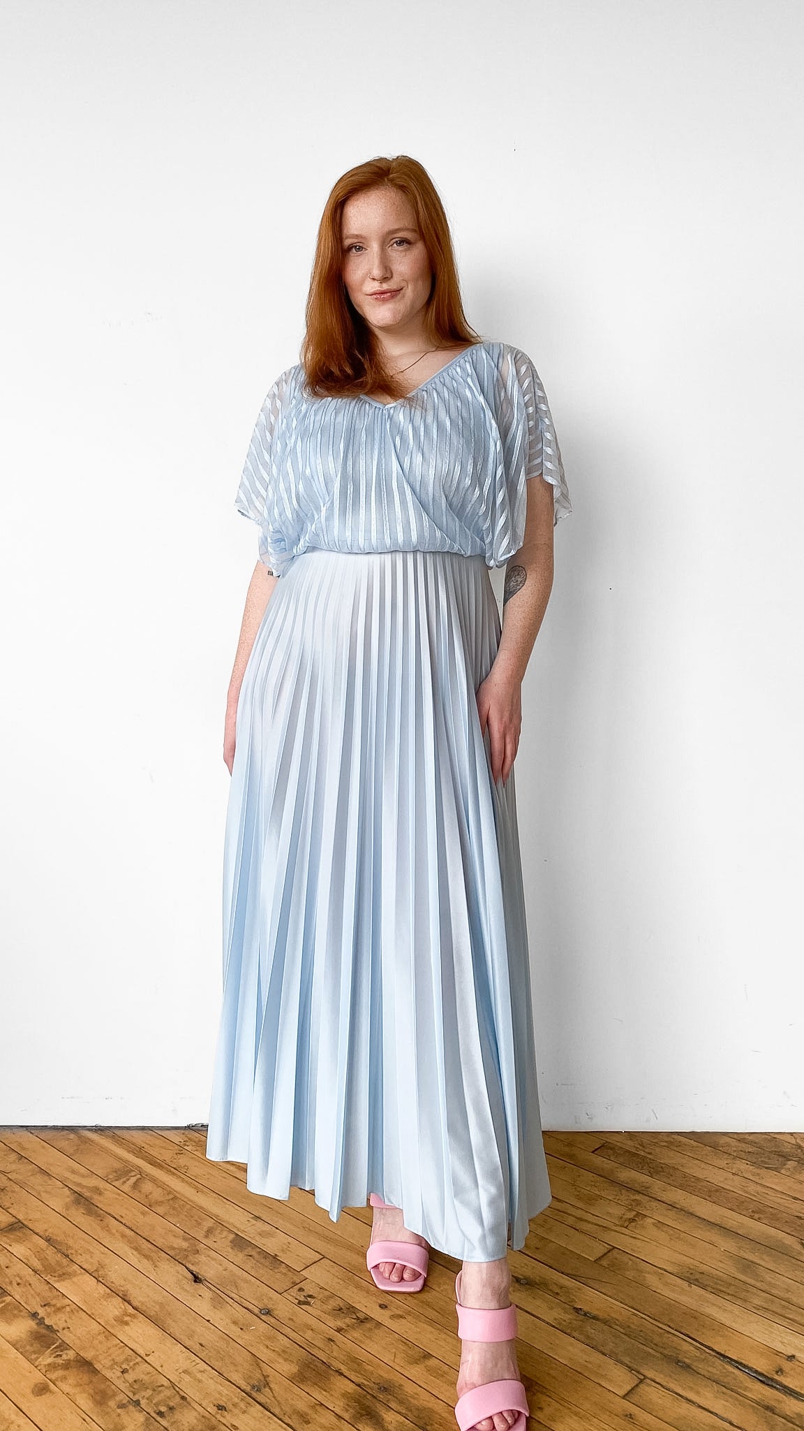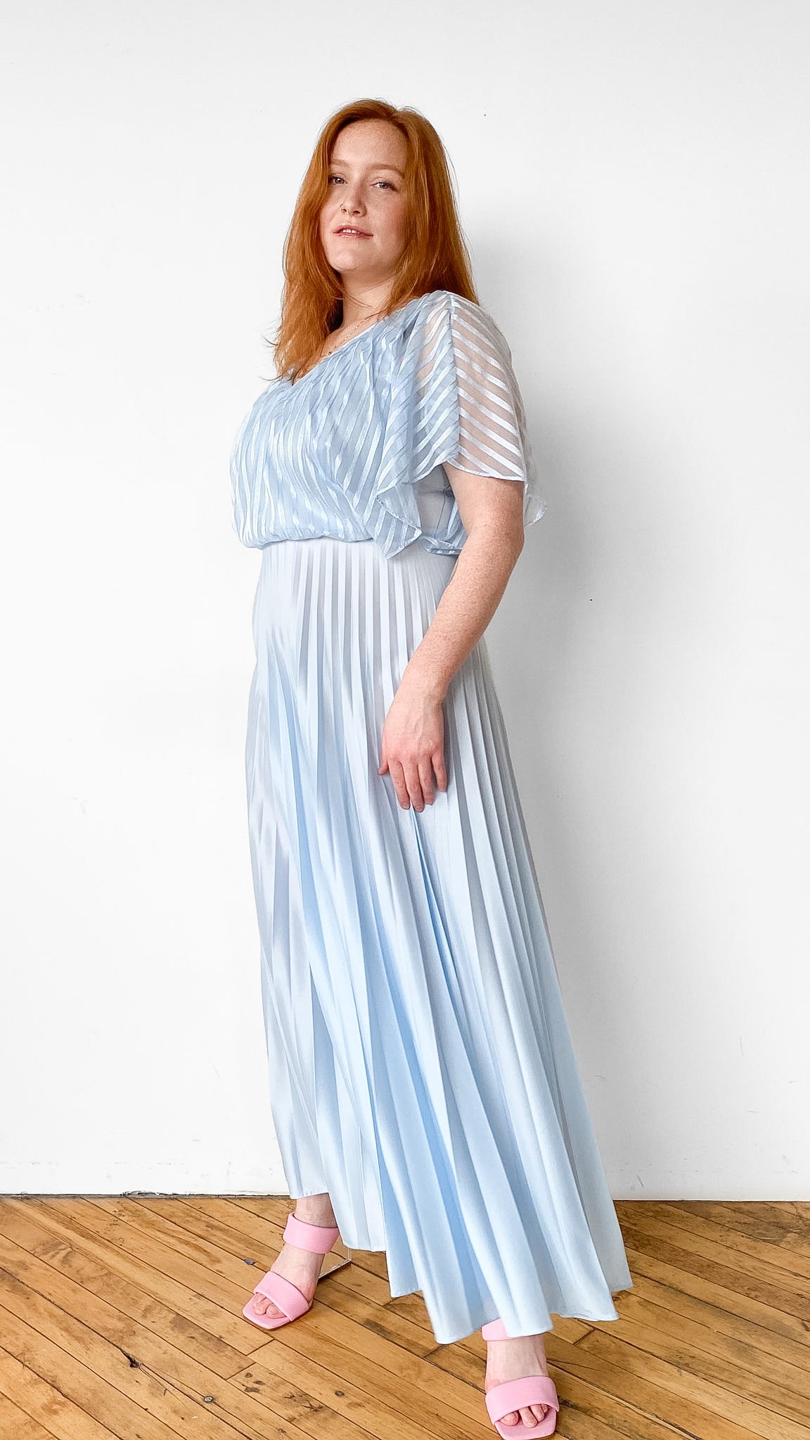 Baby blue full length gown with V-neck, vertical striped netted bodice overlay with batwing sleeves, and pleated skirt. Zipper down center back, elastic waistband.
