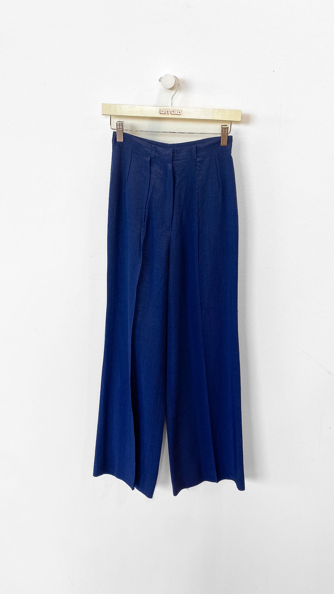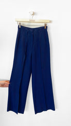 Dark blue wide leg pants with small pleats in front, zipper fly with hook and bar closure, no pockets, unlined.