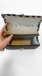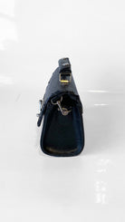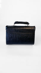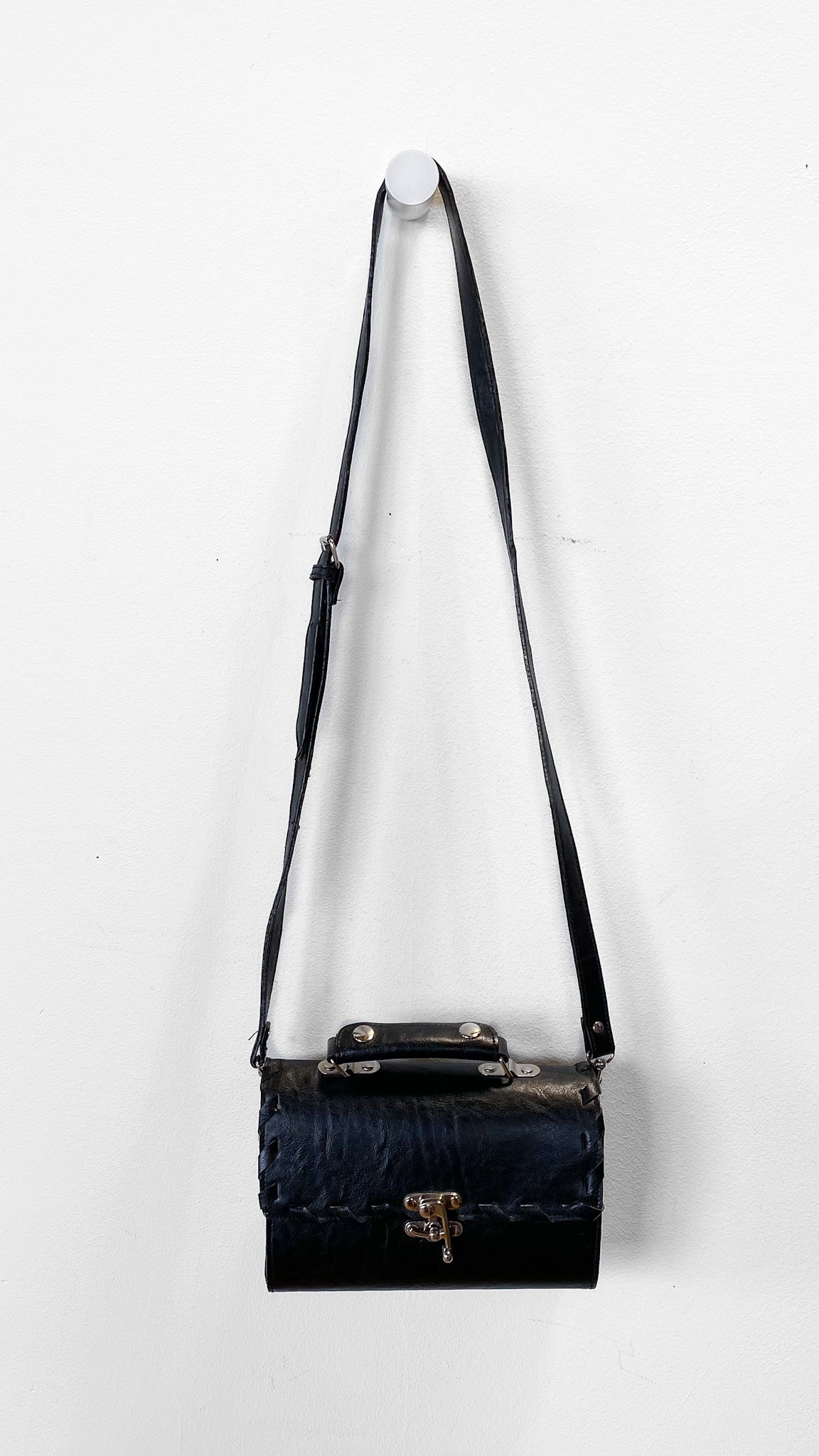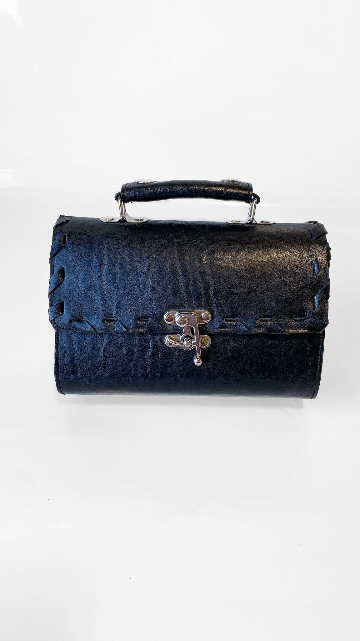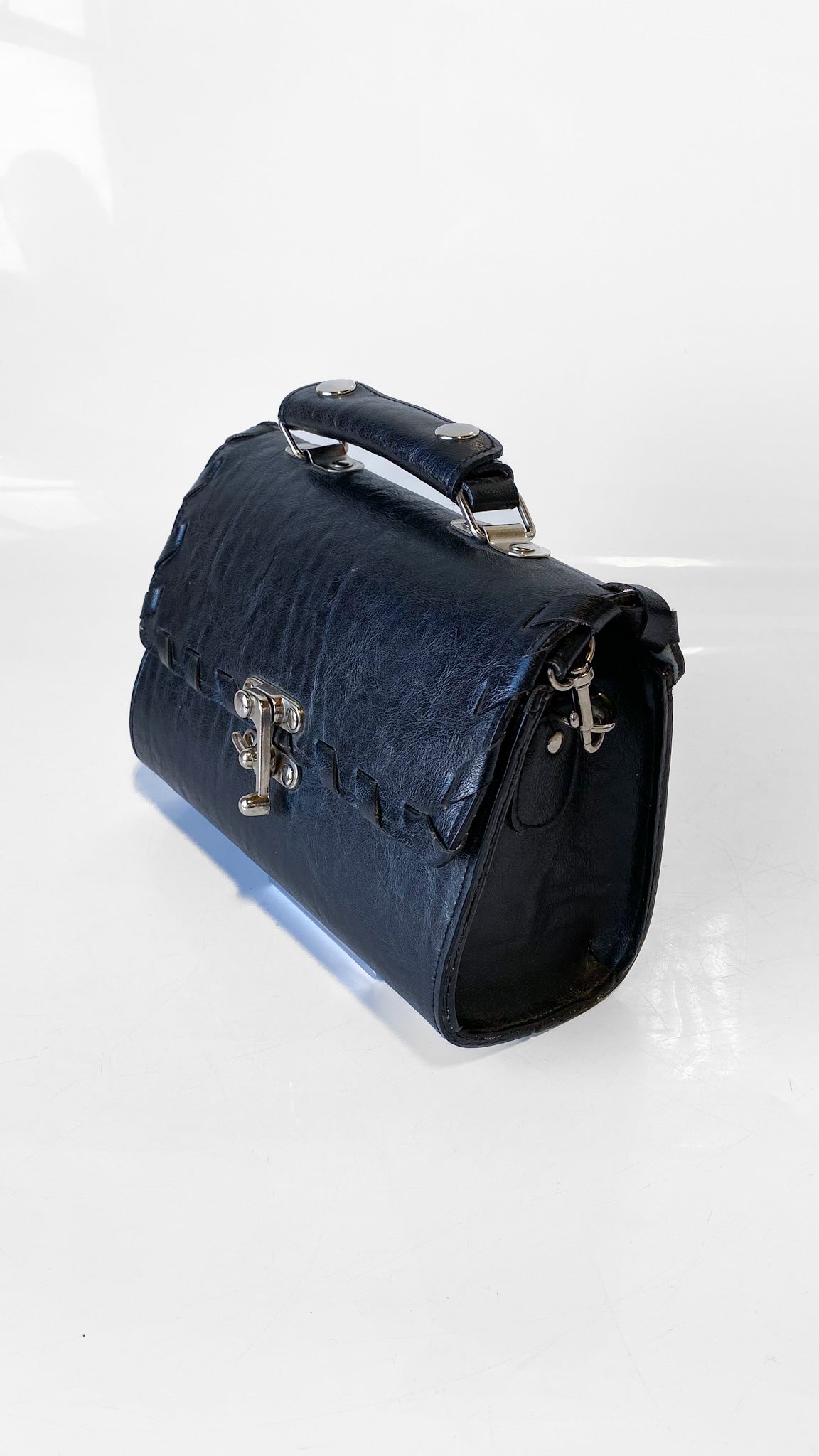 Black leather doctor style handbag with large silver metal clasp, suede interior, detachable adjustable strap.