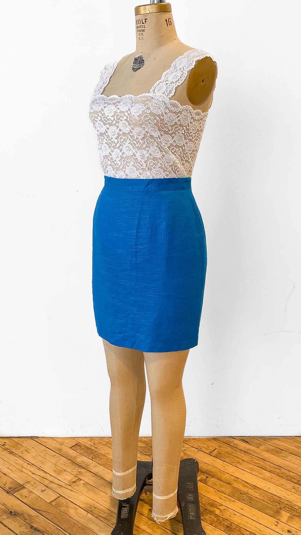 Bright cerulean blue pencil skirt with center back zipper and button at the waistband, lined in black fabric.
