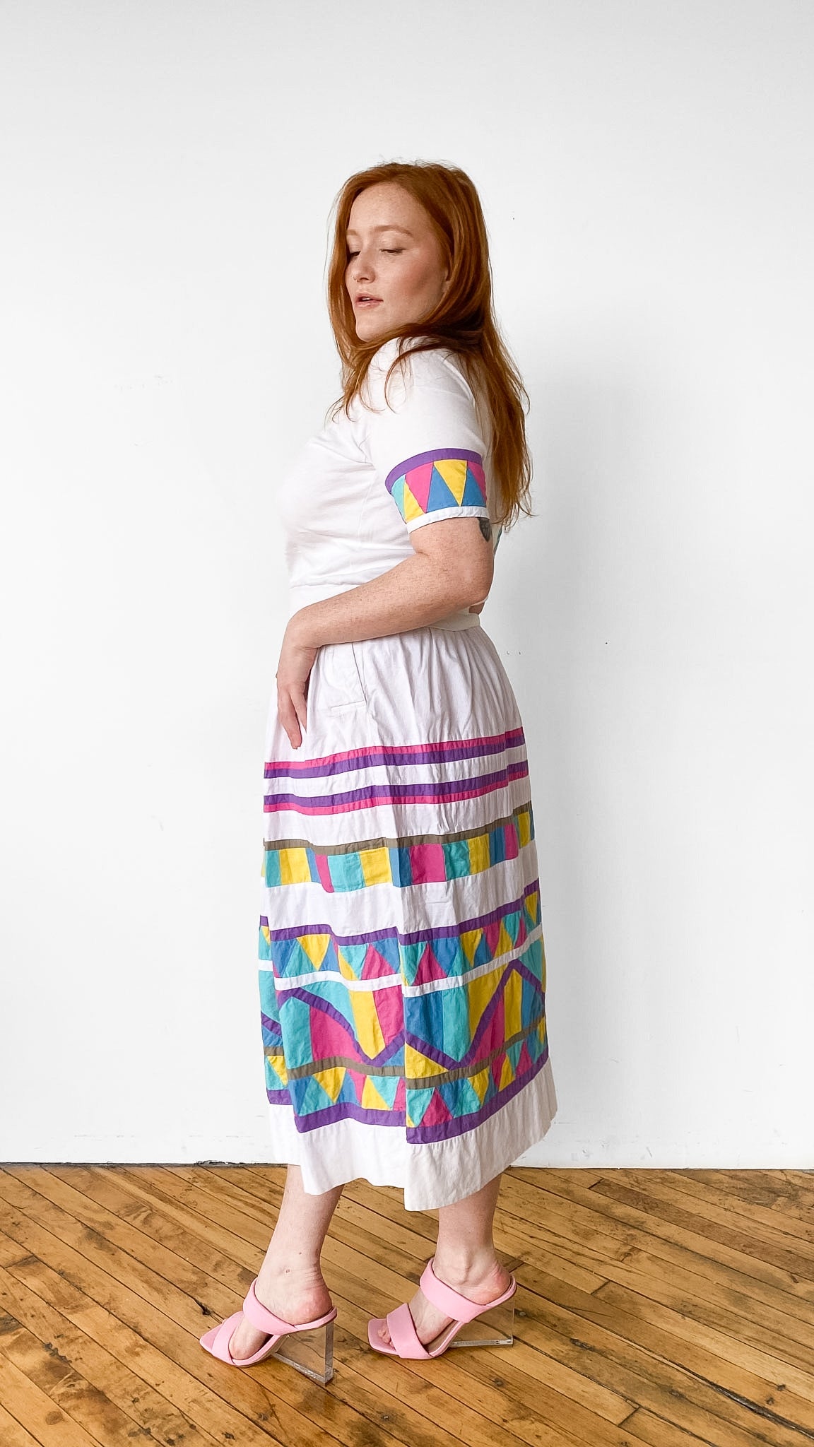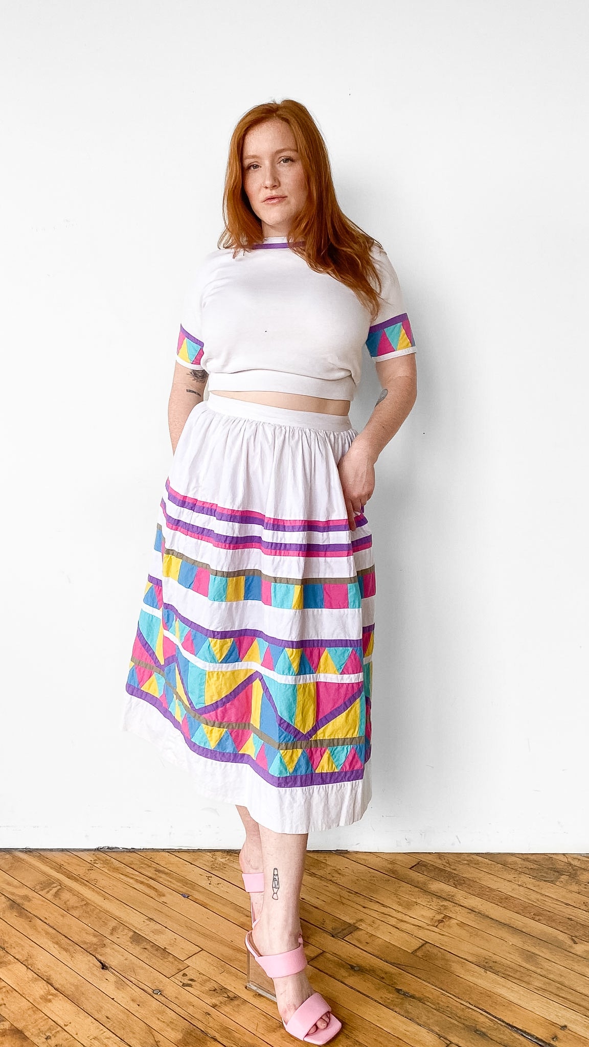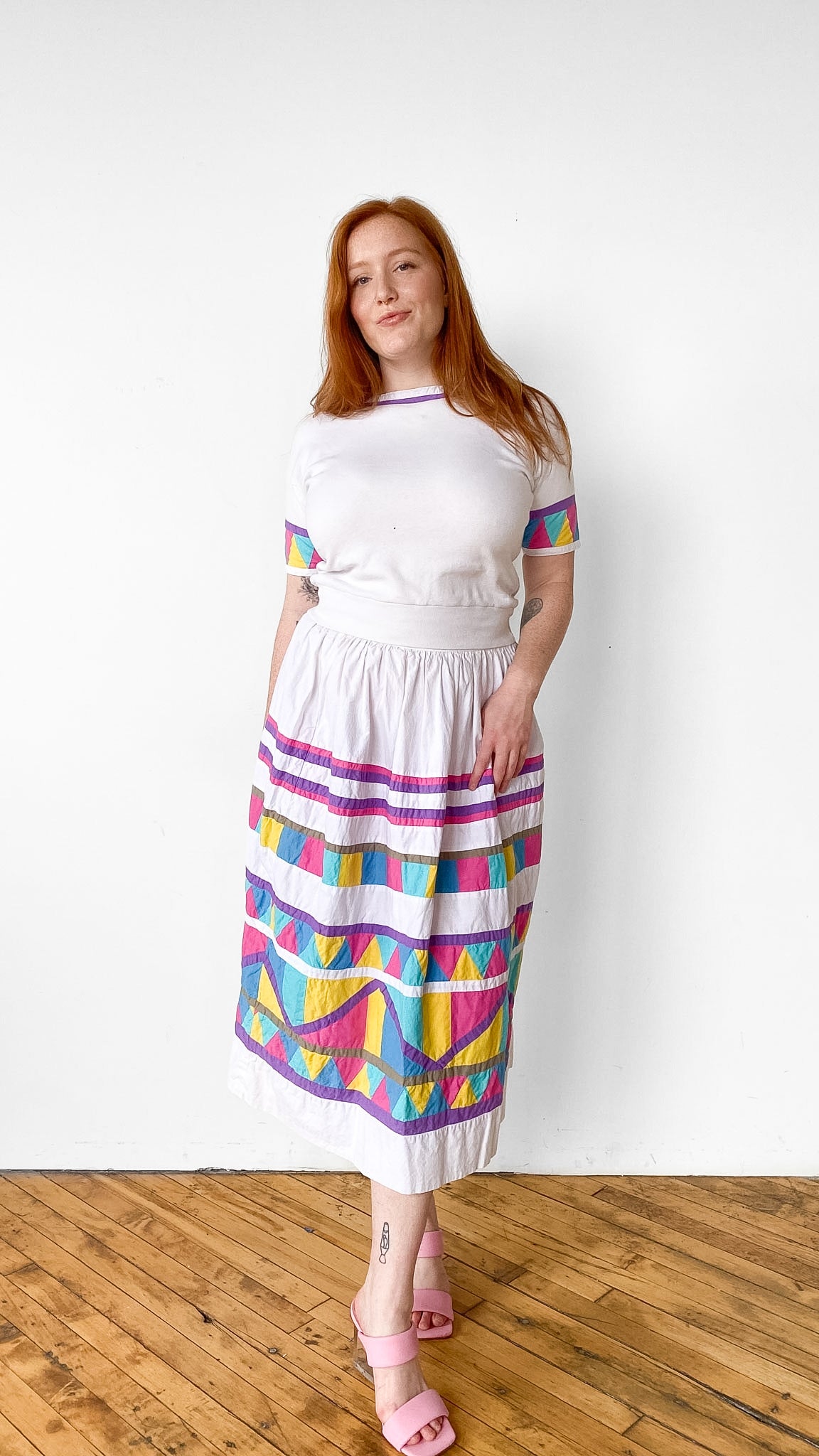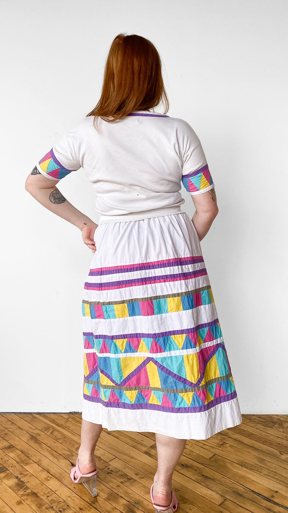 White shirt and skirt set with colorful quilted sleeves and skirt. Shirt has elastic waistband and slight batwing. Skirt has button fly. *Sold as a Set*
