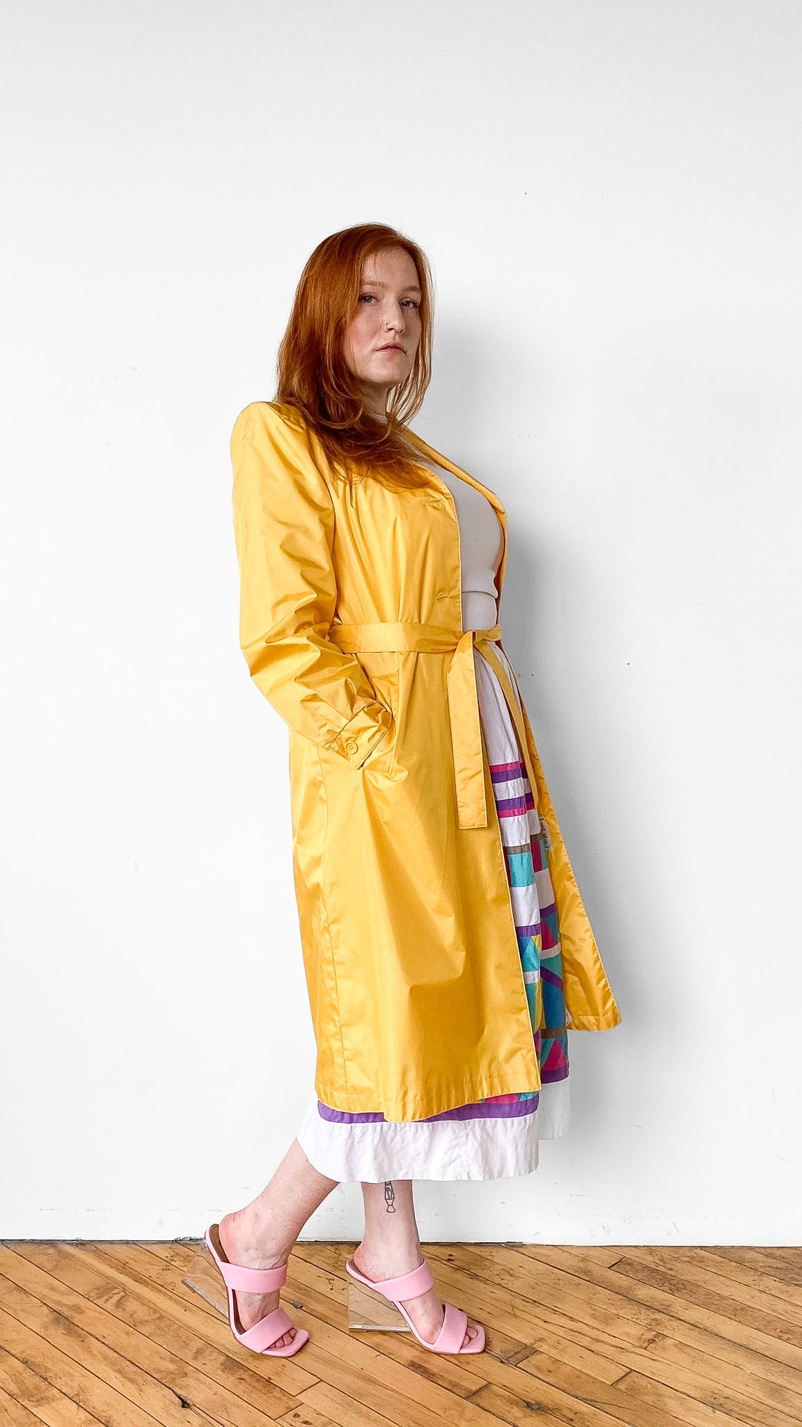 Bright yellow trench raincoat with dramatic shoulder pads, five buttons down the front, matching sash belt, two exterior welt pockets. Lined in white fabric with yellow polka dots.