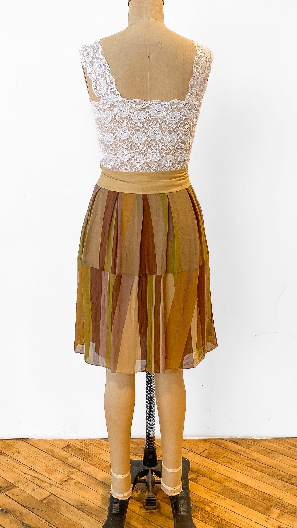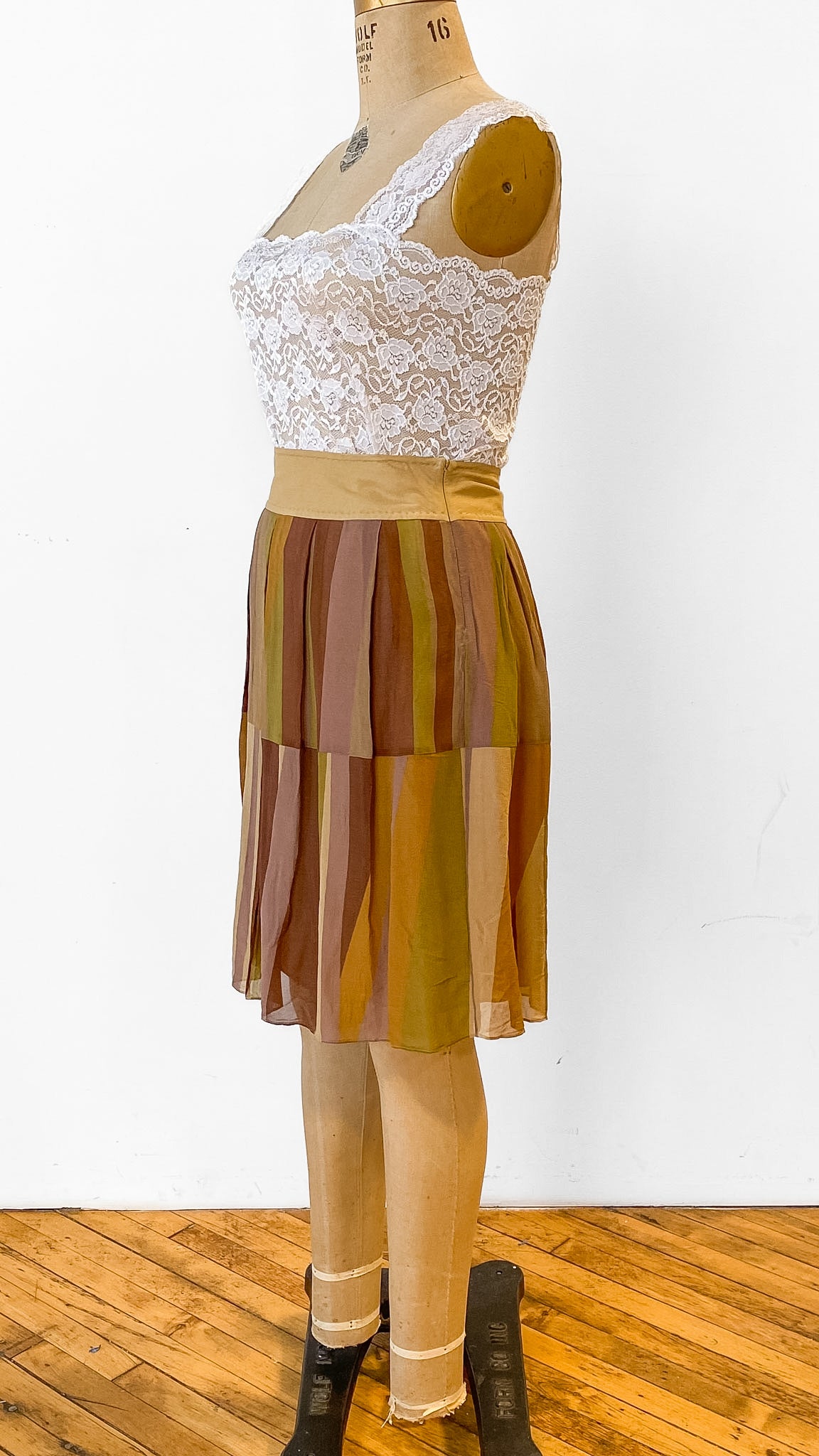 Khaki silk skirt with abstract green, brown, and taupe vertical stripes. Side seam zipper with hook and eye at top.