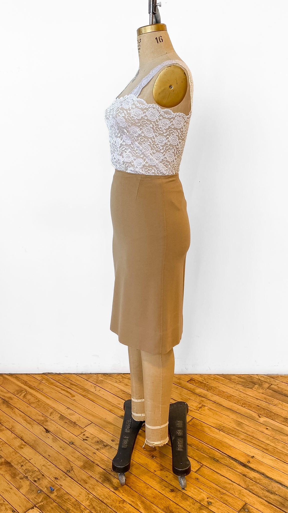 Midi length camel colored wool pencil skirt with small slit in center back seam, zipper in center back seam with a hook and eye closure. Lined in tan fabric.