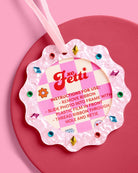 Pearlized pink picture frame ornament; 9.25 cm diameter