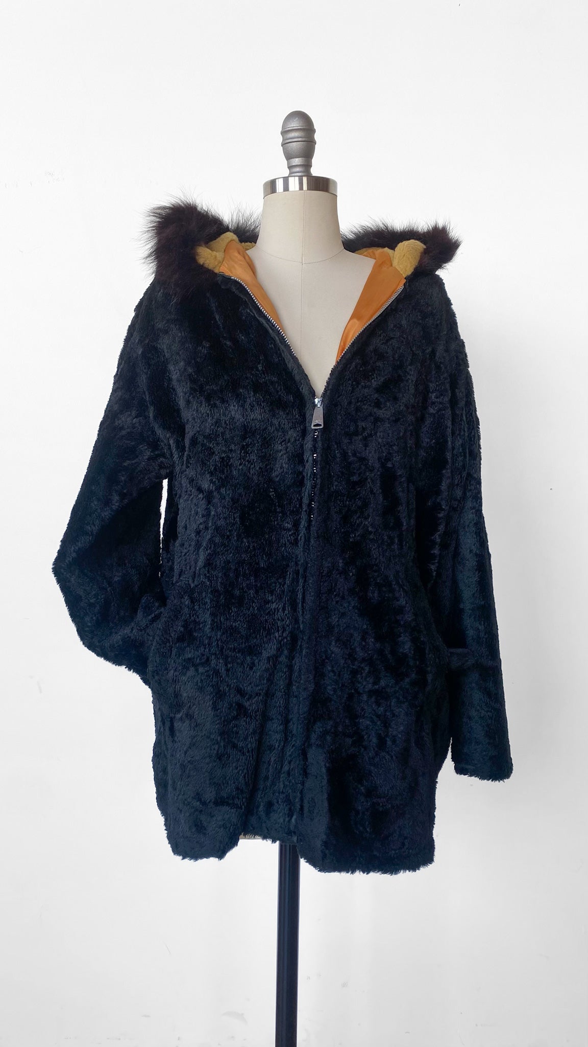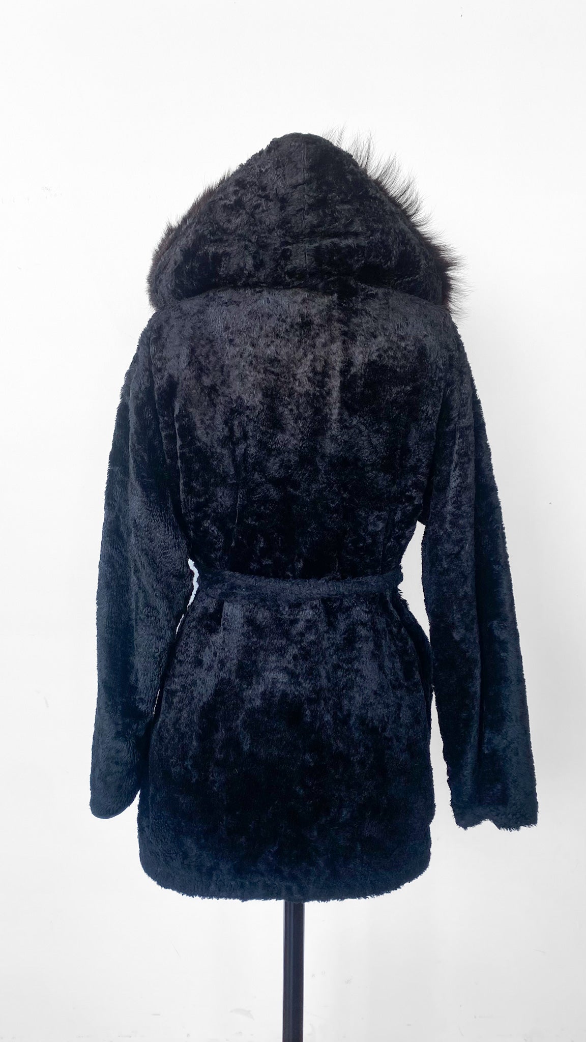 1960s Black Faux Fur Hooded Jacket, sz. L