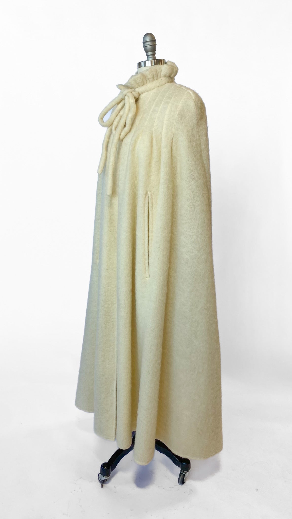 Full length ivory cape with long ties at neck that create a ruffle turtleneck effect. Two snaps, one at neck, one at chest. Two holes for arms. One interior pocket.