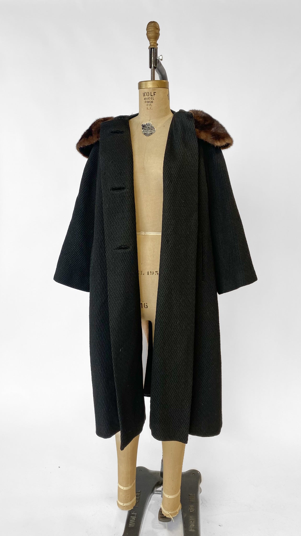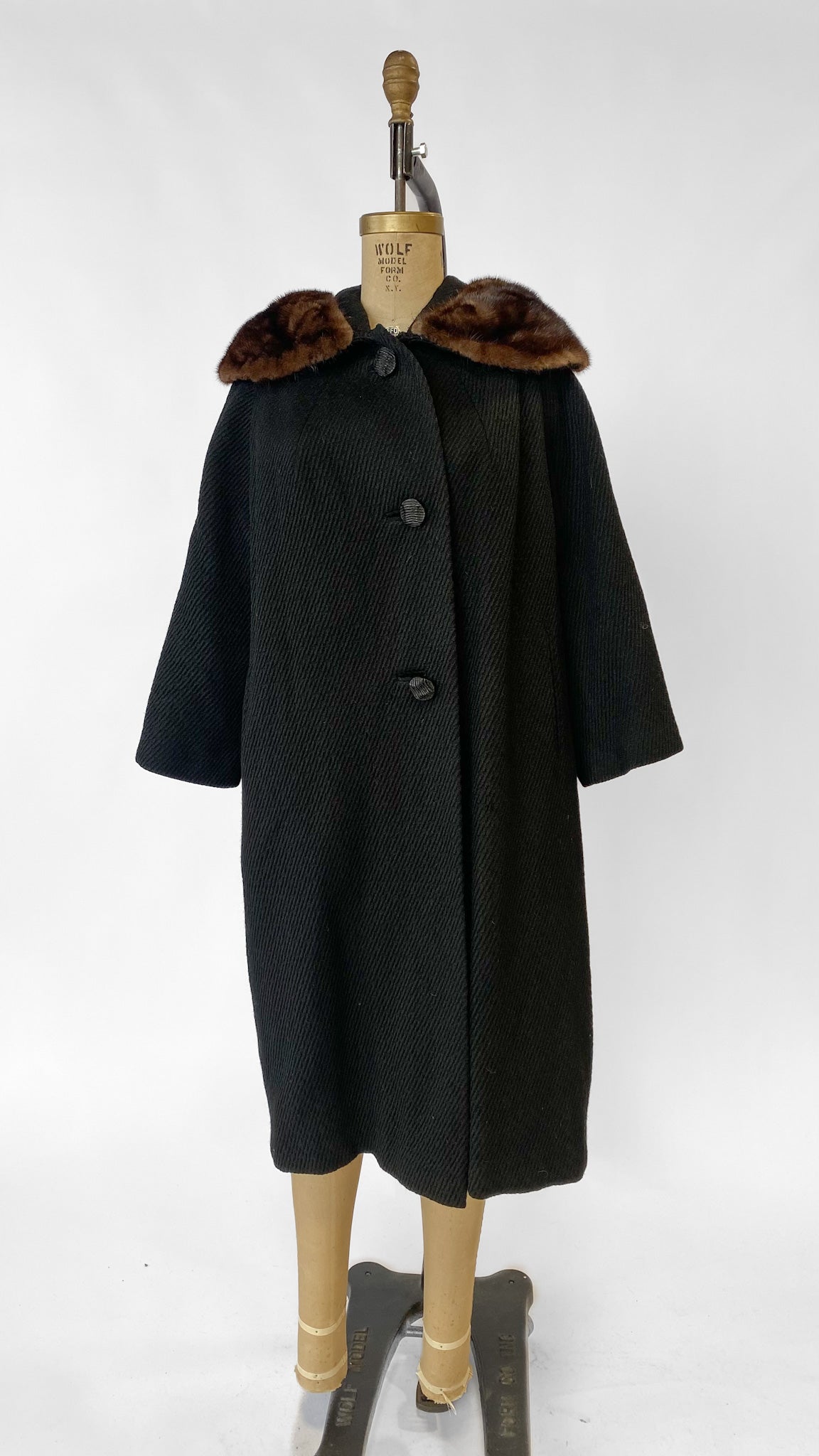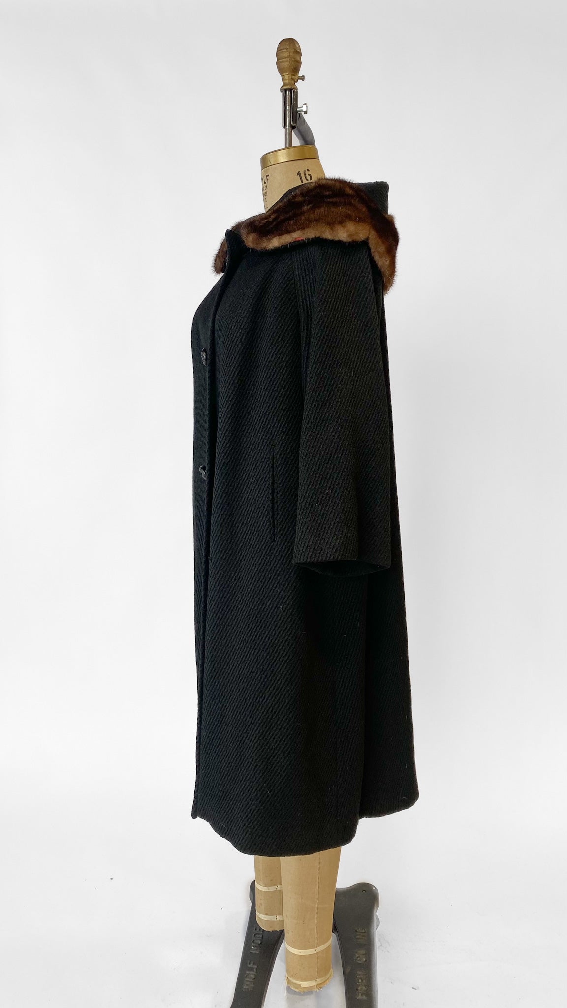 Long black A-line coat with pinned brown fur collar. Three large plastic buttons and two inset pockets.