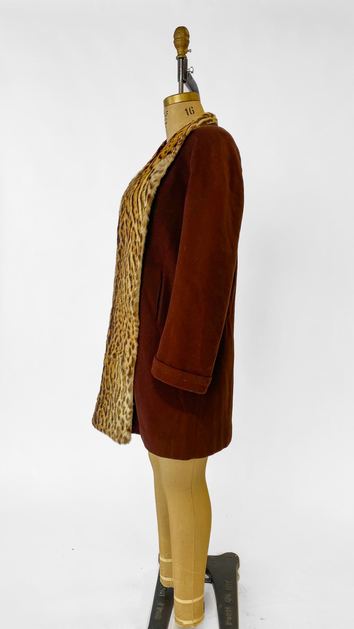 Brown jacket with large leopard fur lapel, shoulder pads, two small welt pockets, lined in a copper fabric. Metal hook and eye closures down the front.