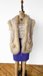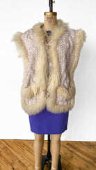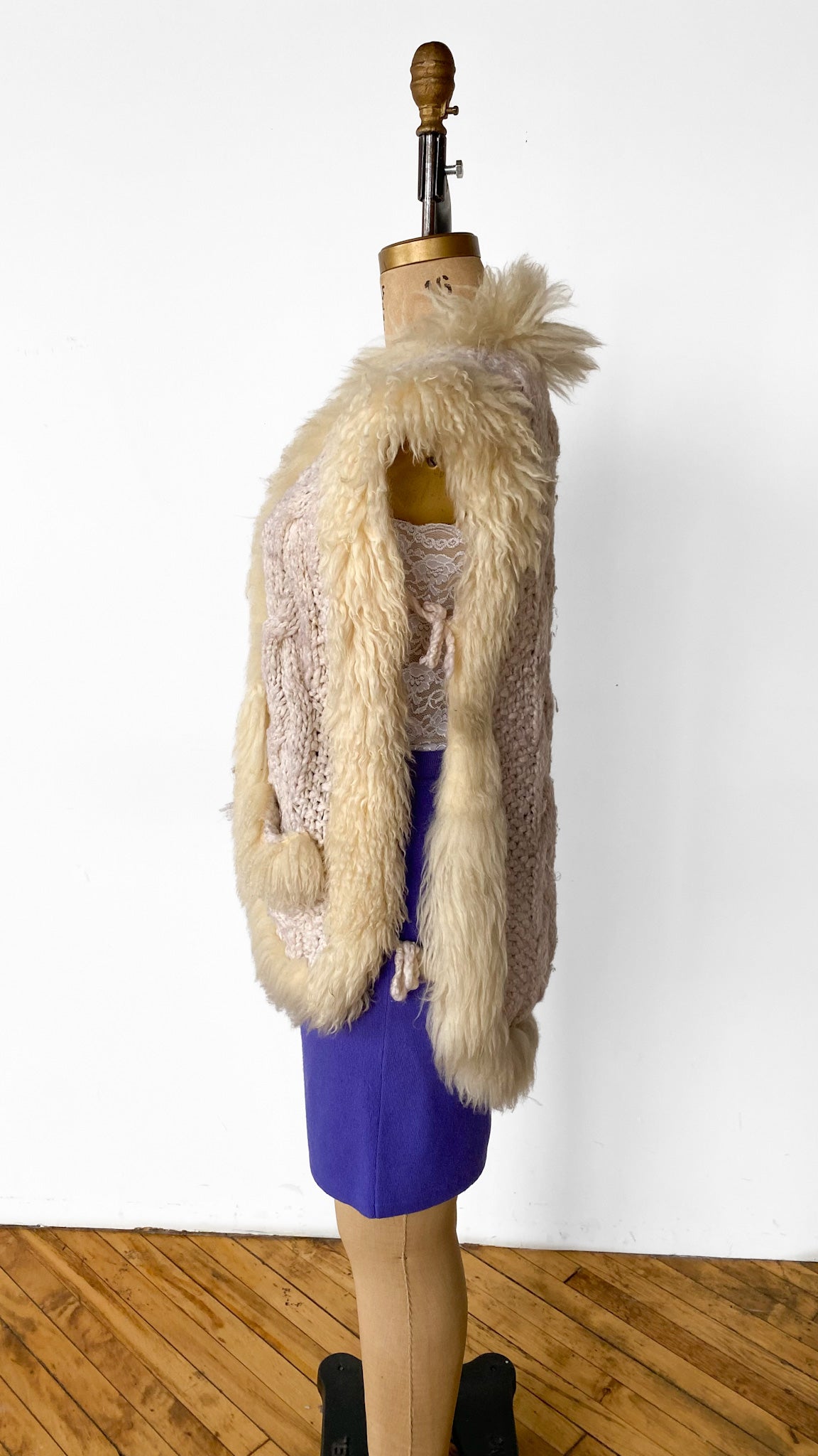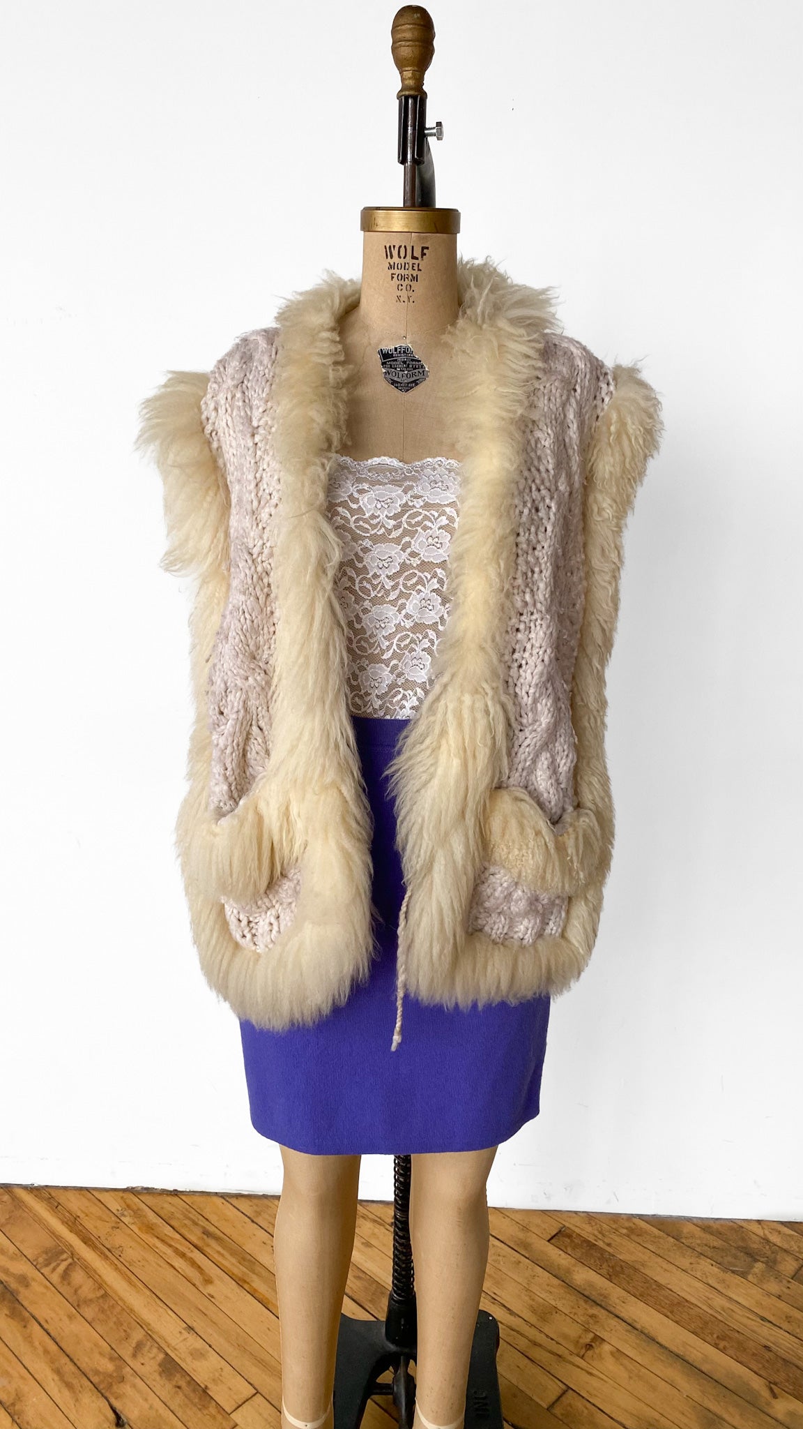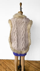 Ivory knit vest with fur along edges, small pockets on front, ties on sides and center front.