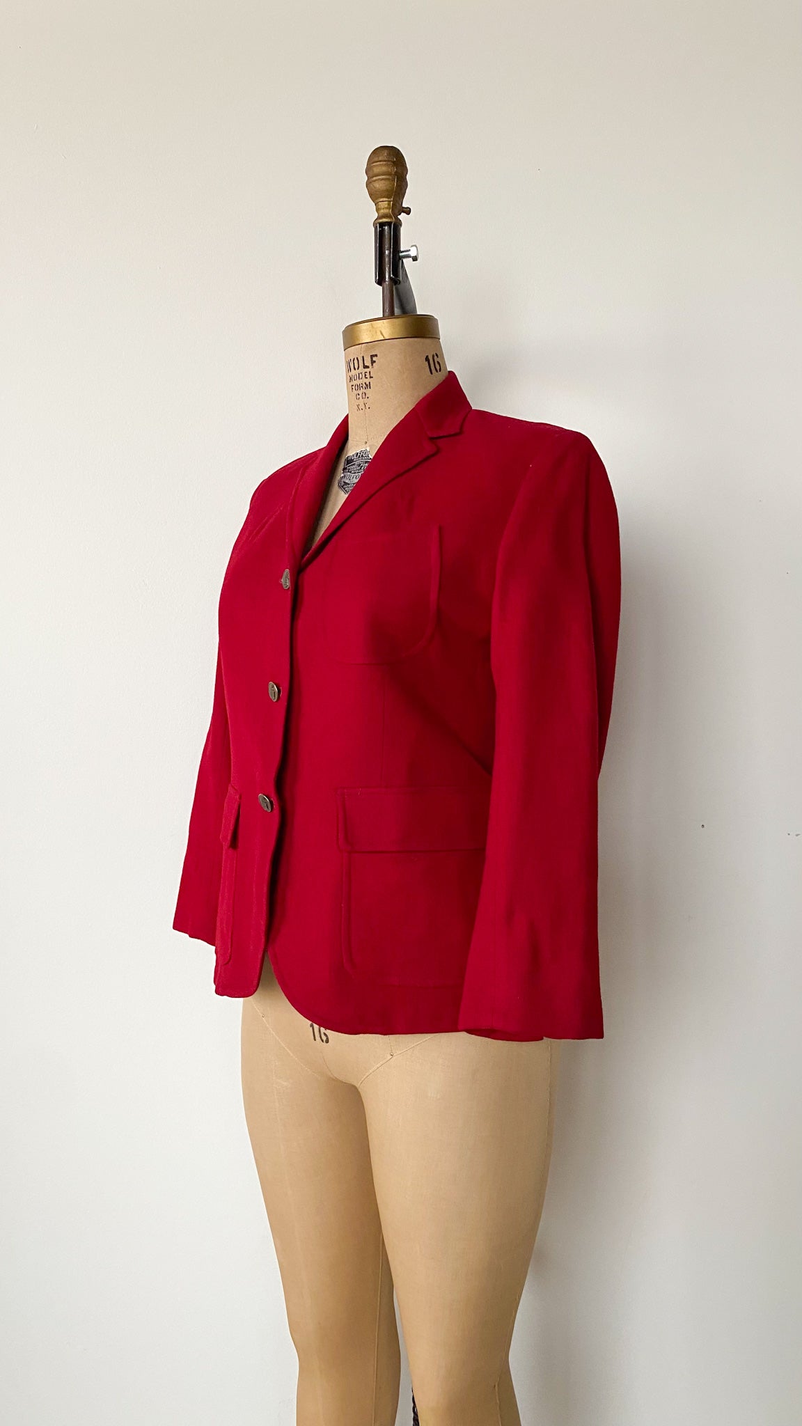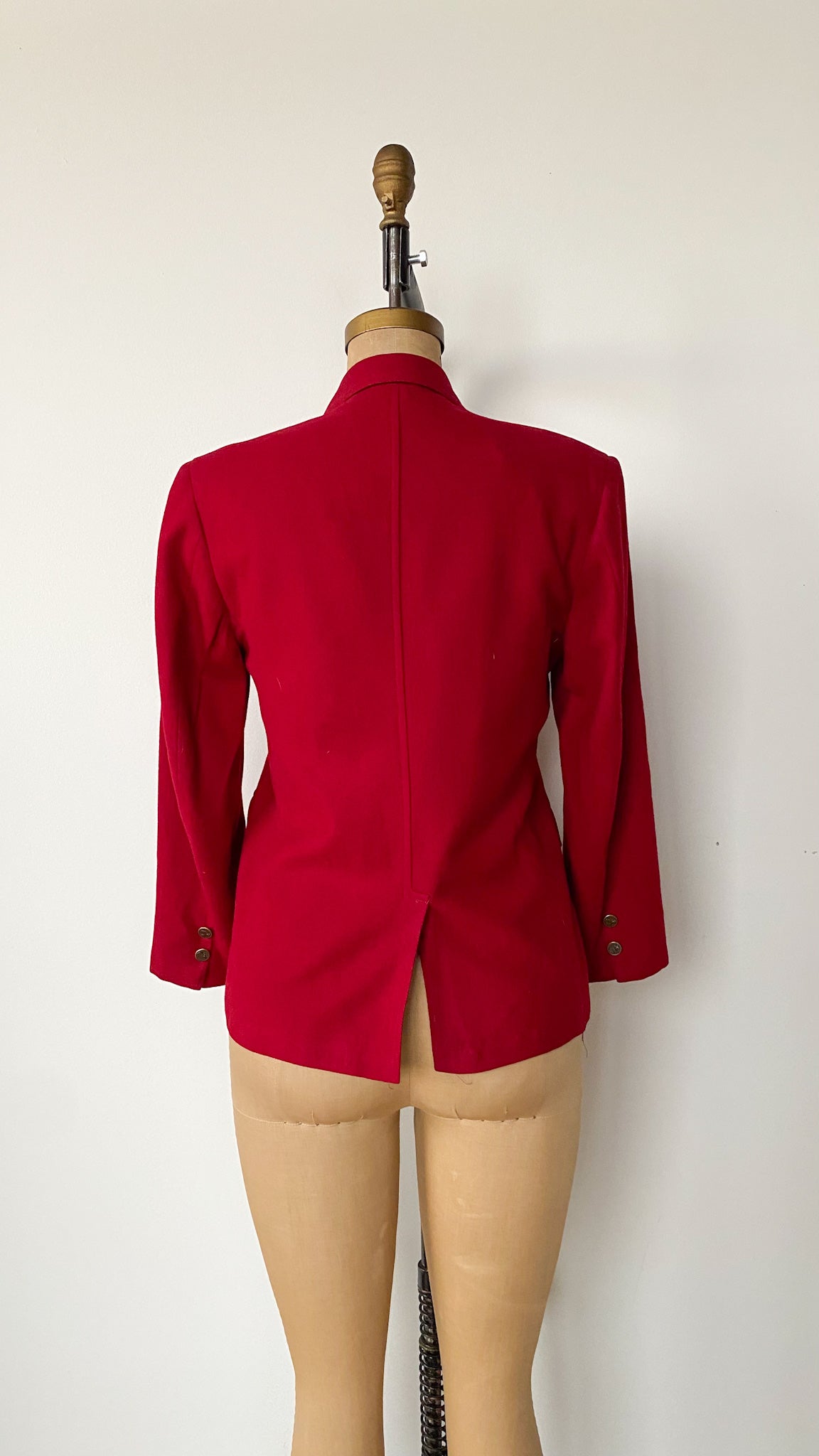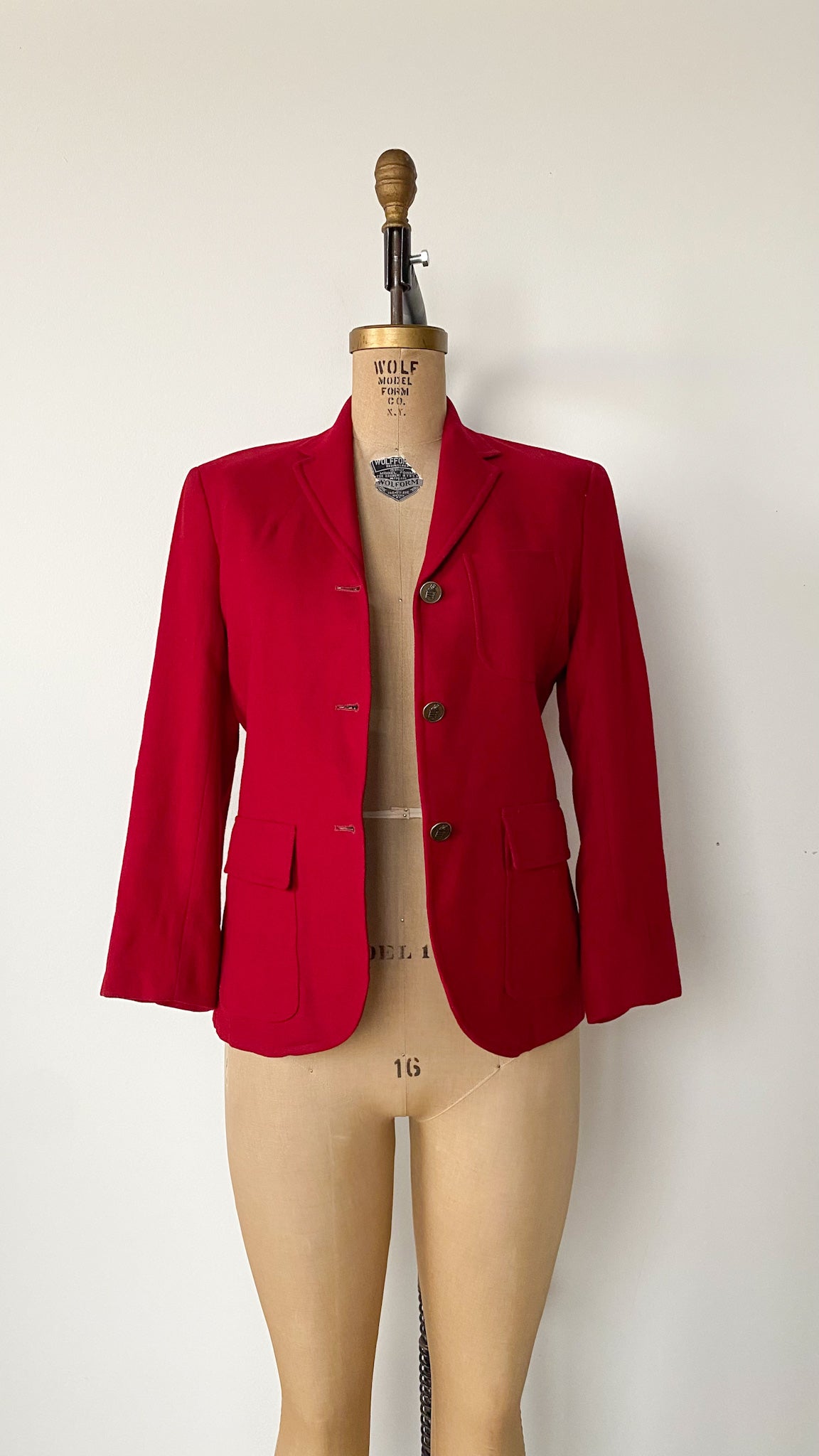 Description: Structured red bazer with bronze buttons that have a crest. There is one breast pocket and two front bottom pockets. Inner lining is a gorgeous green with illustrations of a horn and a vintage hat/whip.