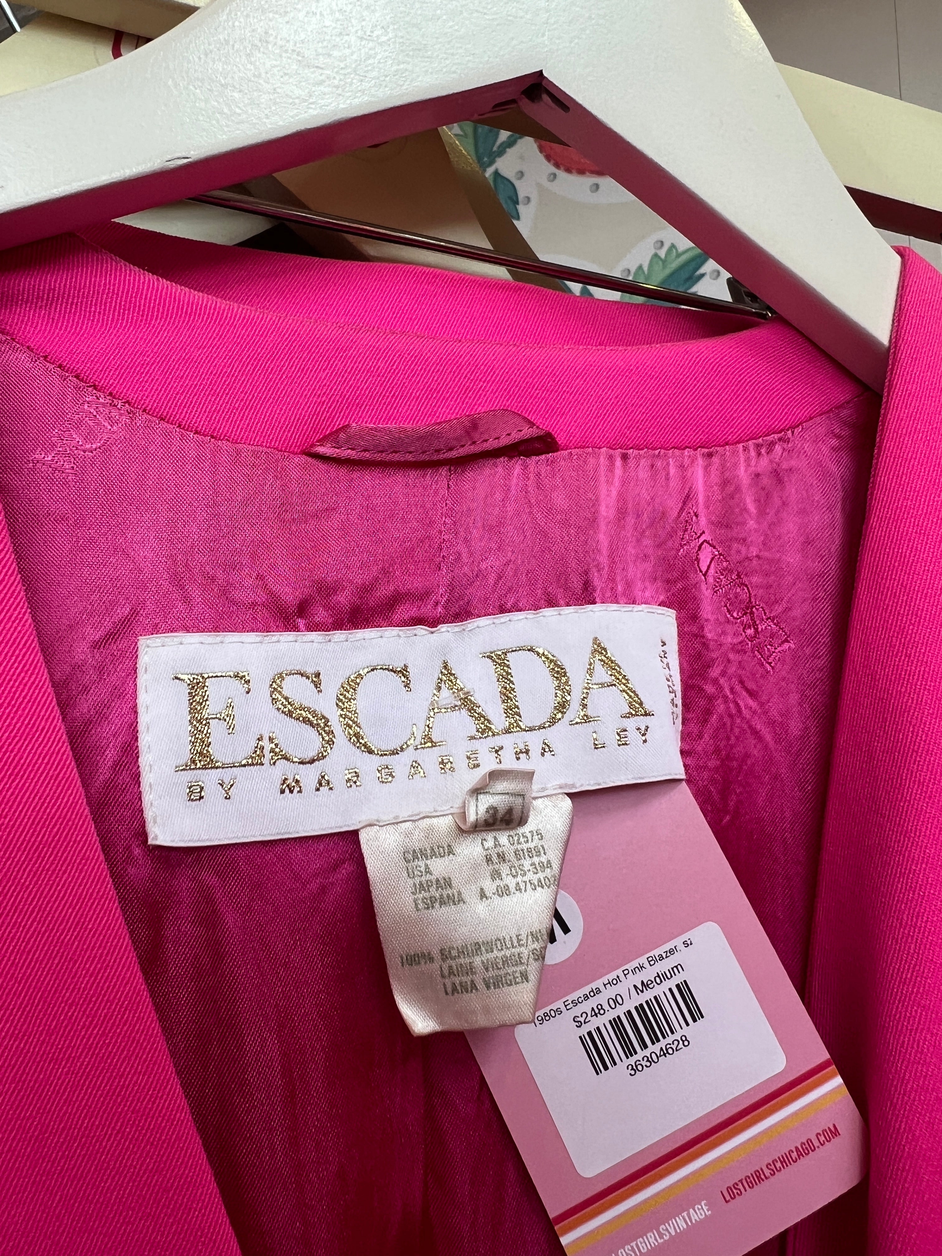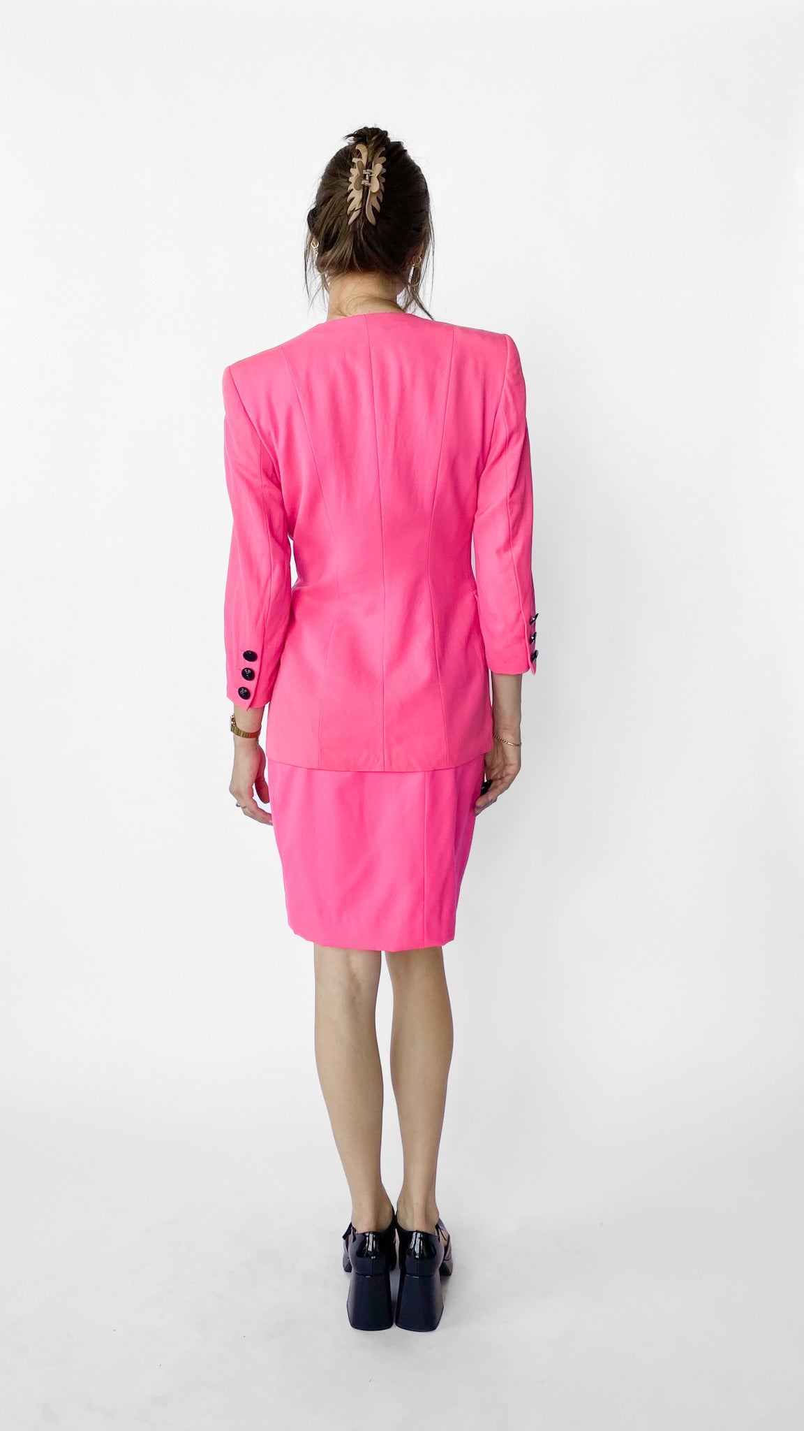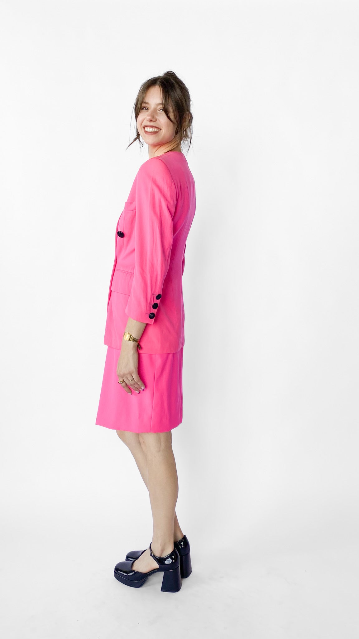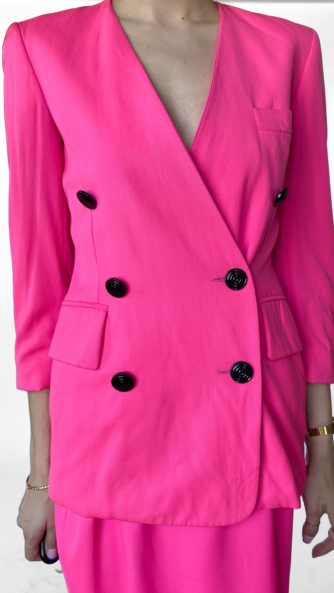 Hot pink double breasted blazer with black acrylic buttons. Fully lined, with shoulder pads.