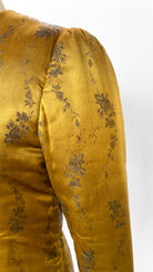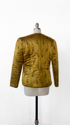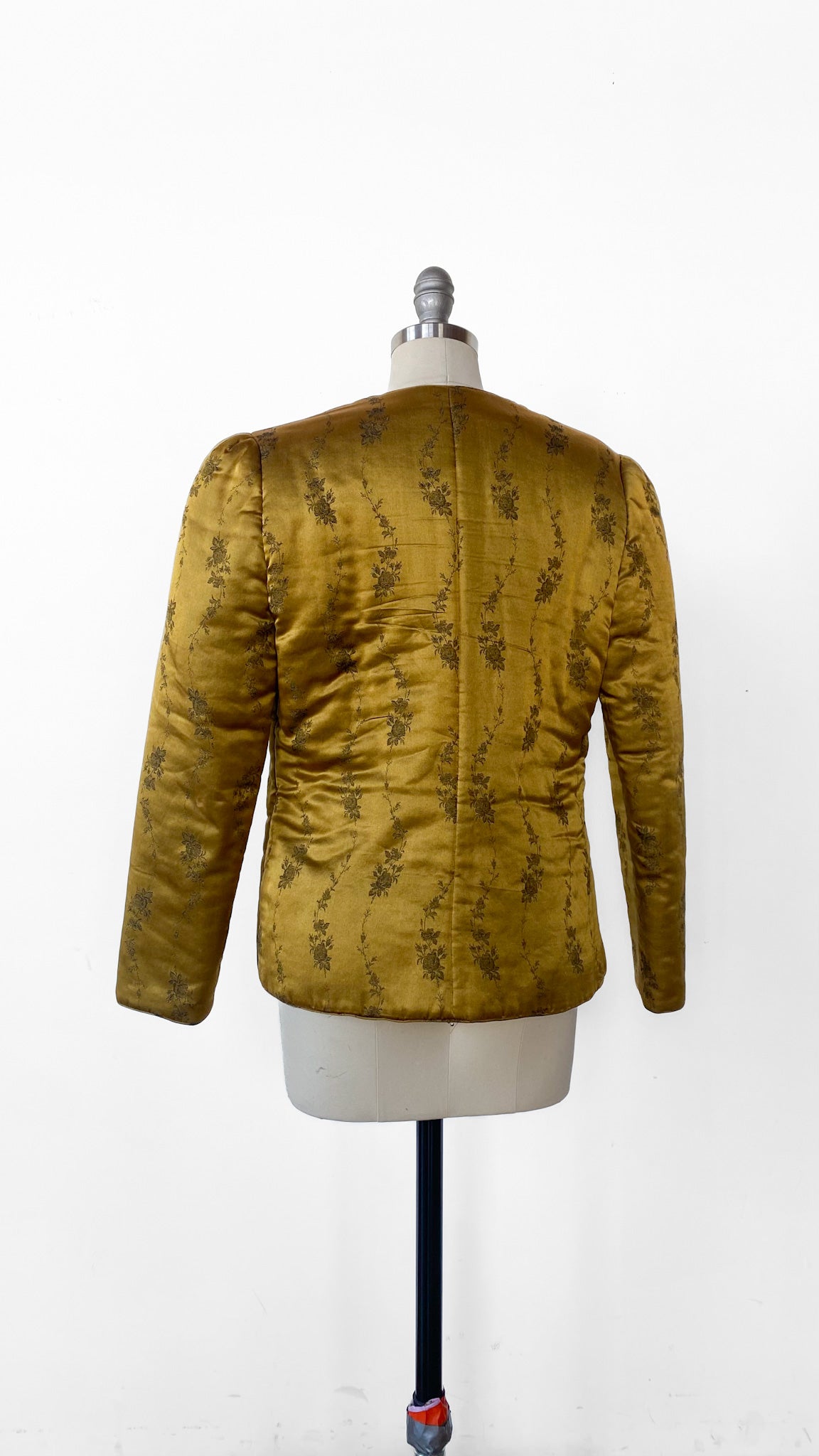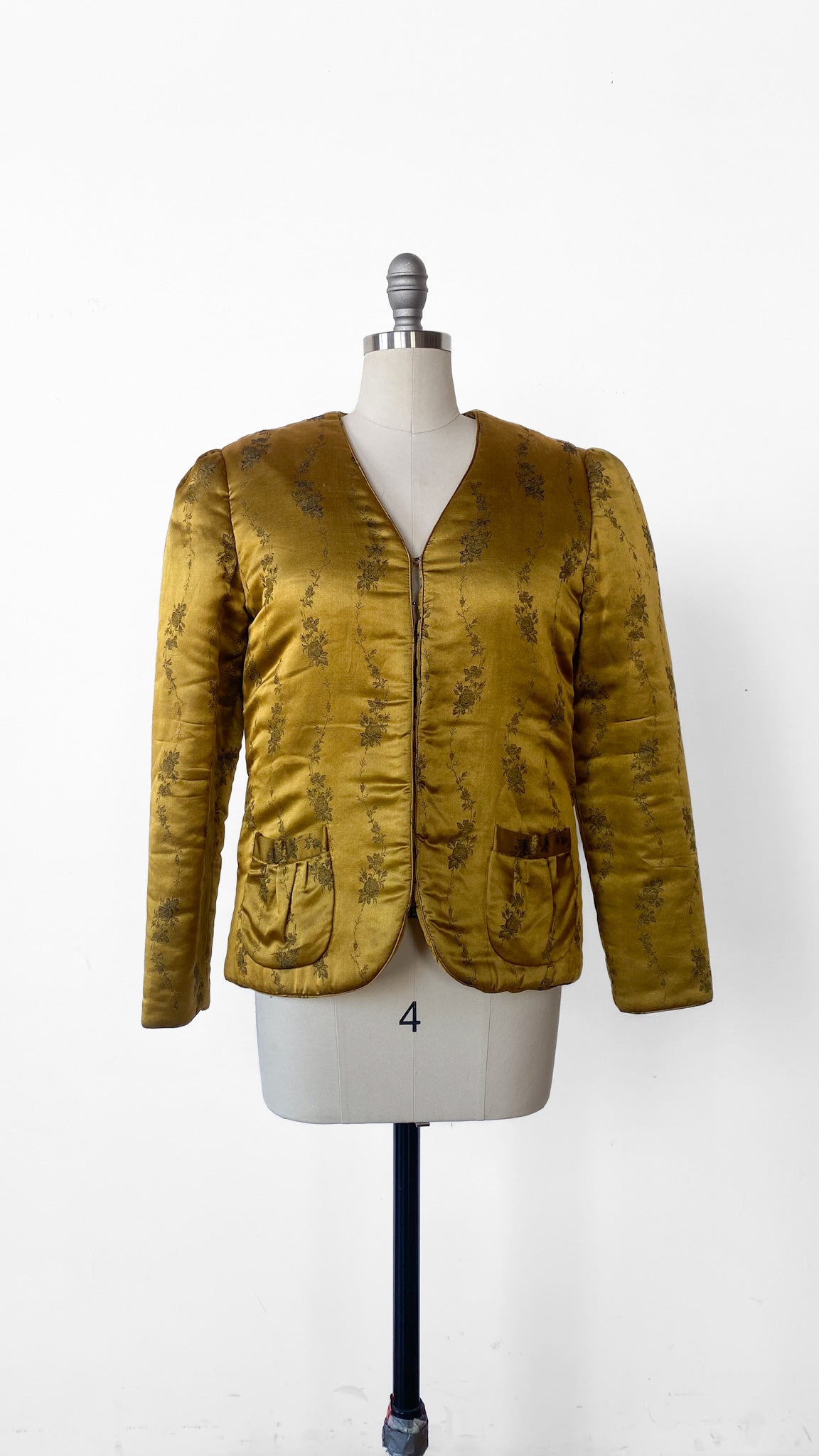 Gold satin jacket with embossed floral pattern, insulated to create a puffer style. Gathered long sleeves, 5 hook and eye closures down the center front. Two small patch pockets.