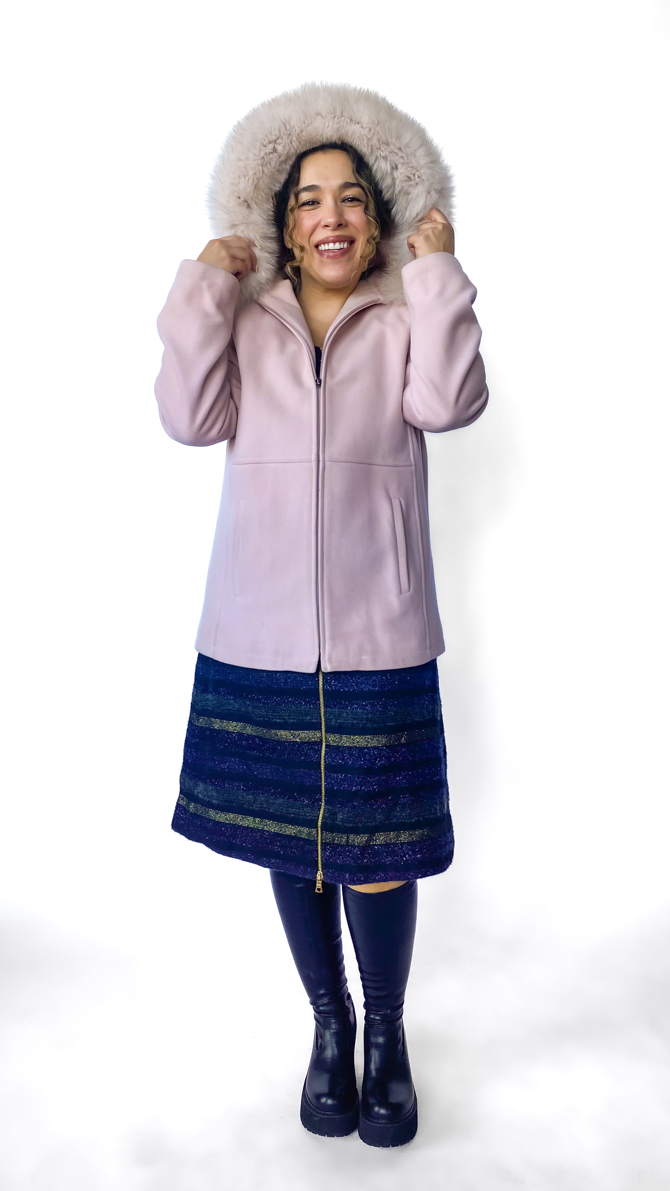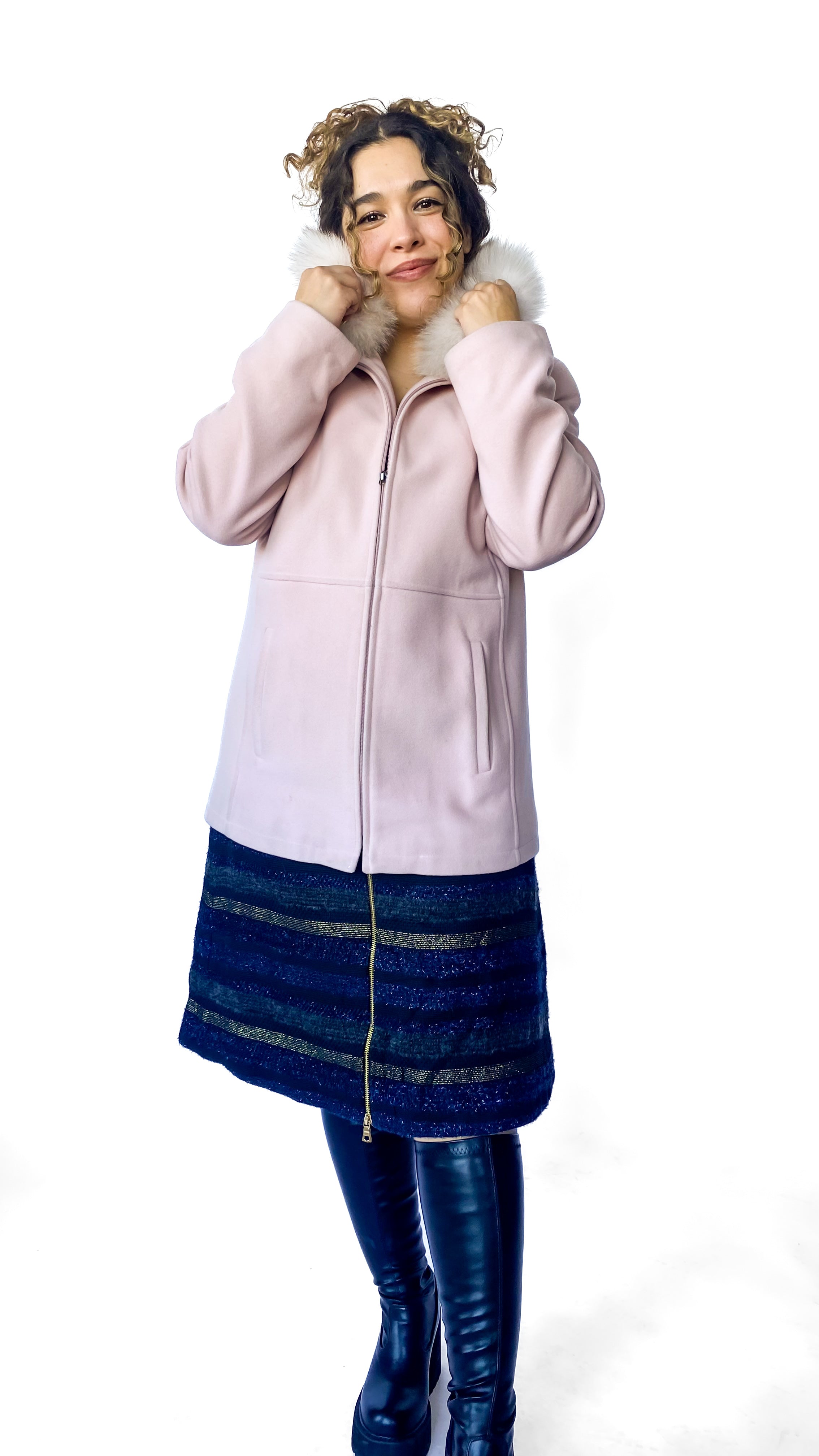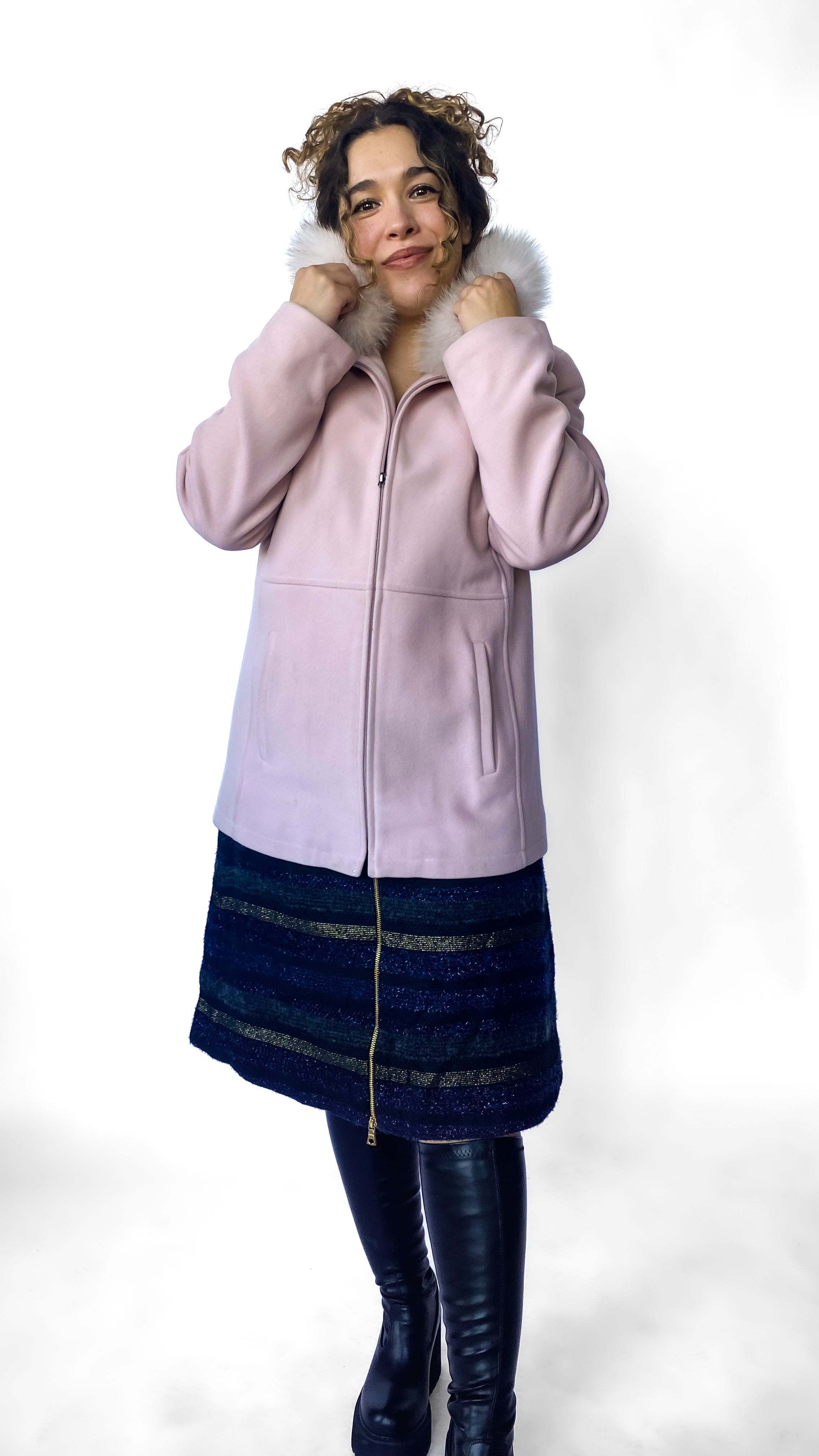 Description: Light pink wool zip up coat with a fox fur trim hood. Long sleeve with side pockets. Fully lined. Slight shoulder pads.