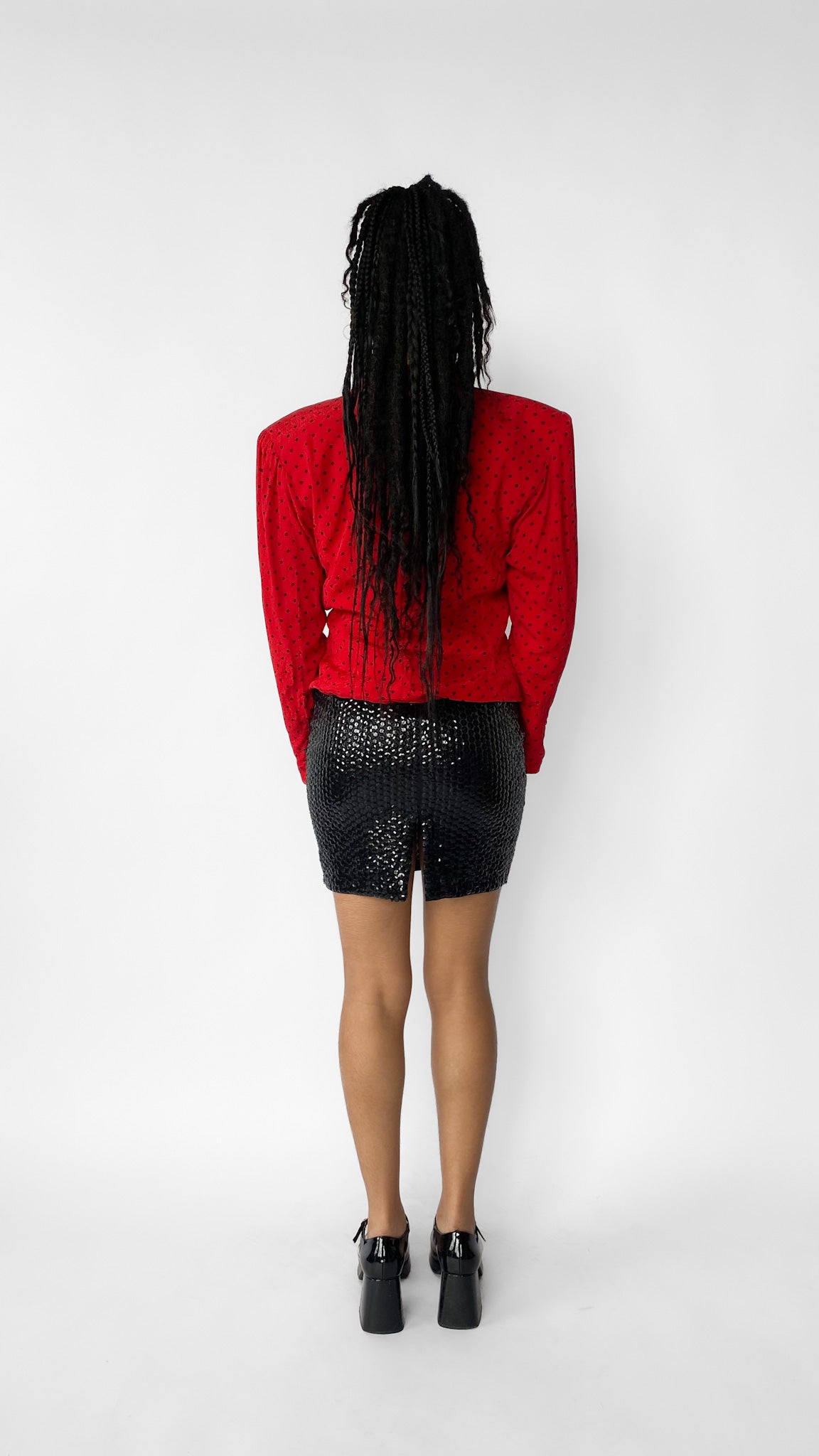 Description: Red shoulder-pad jacket with black polkadots and black button. Black button detailing on sleeves.