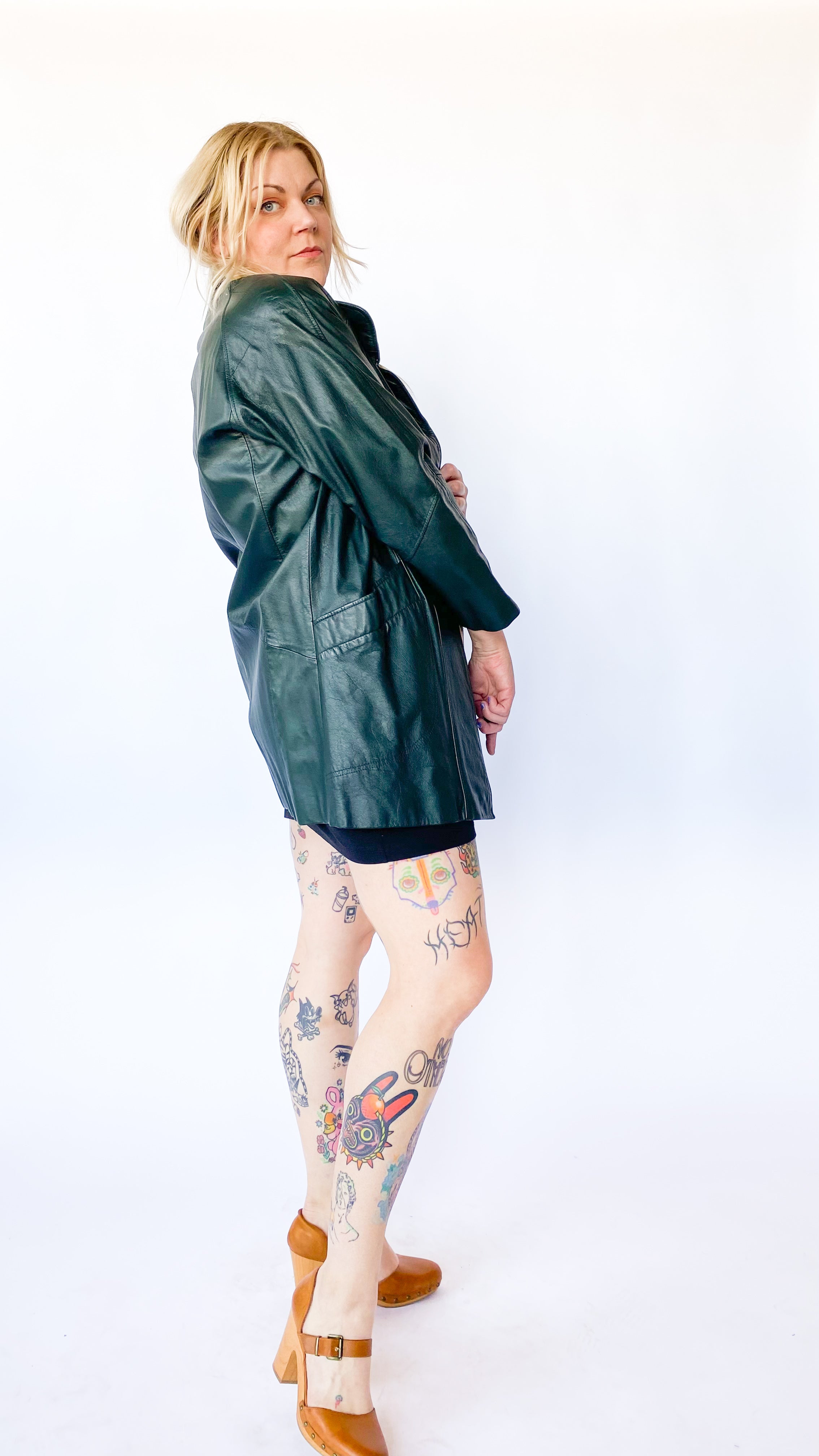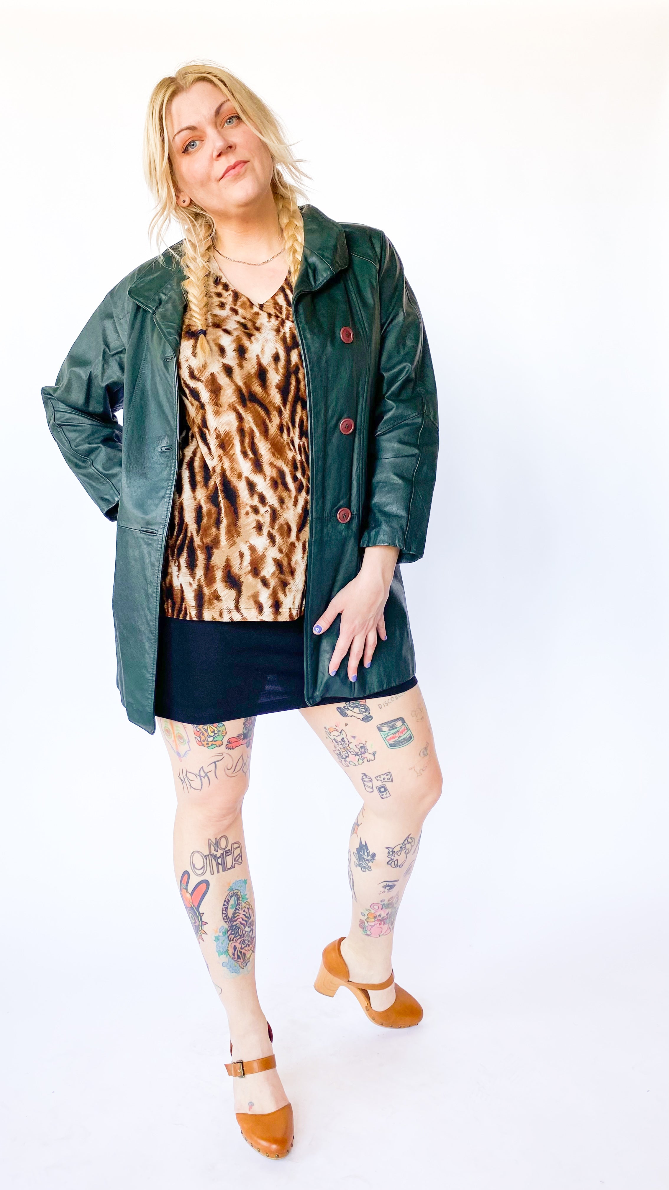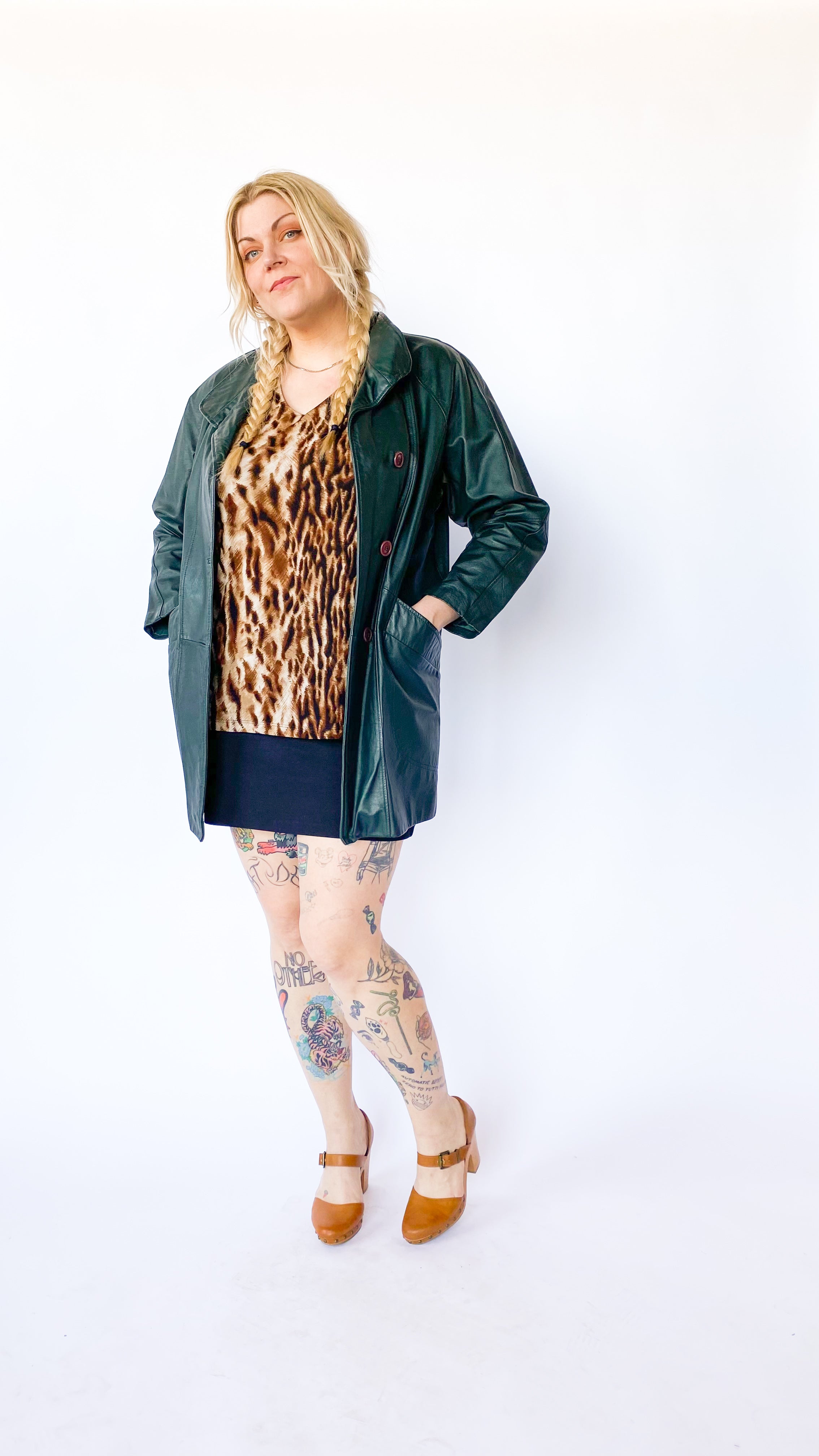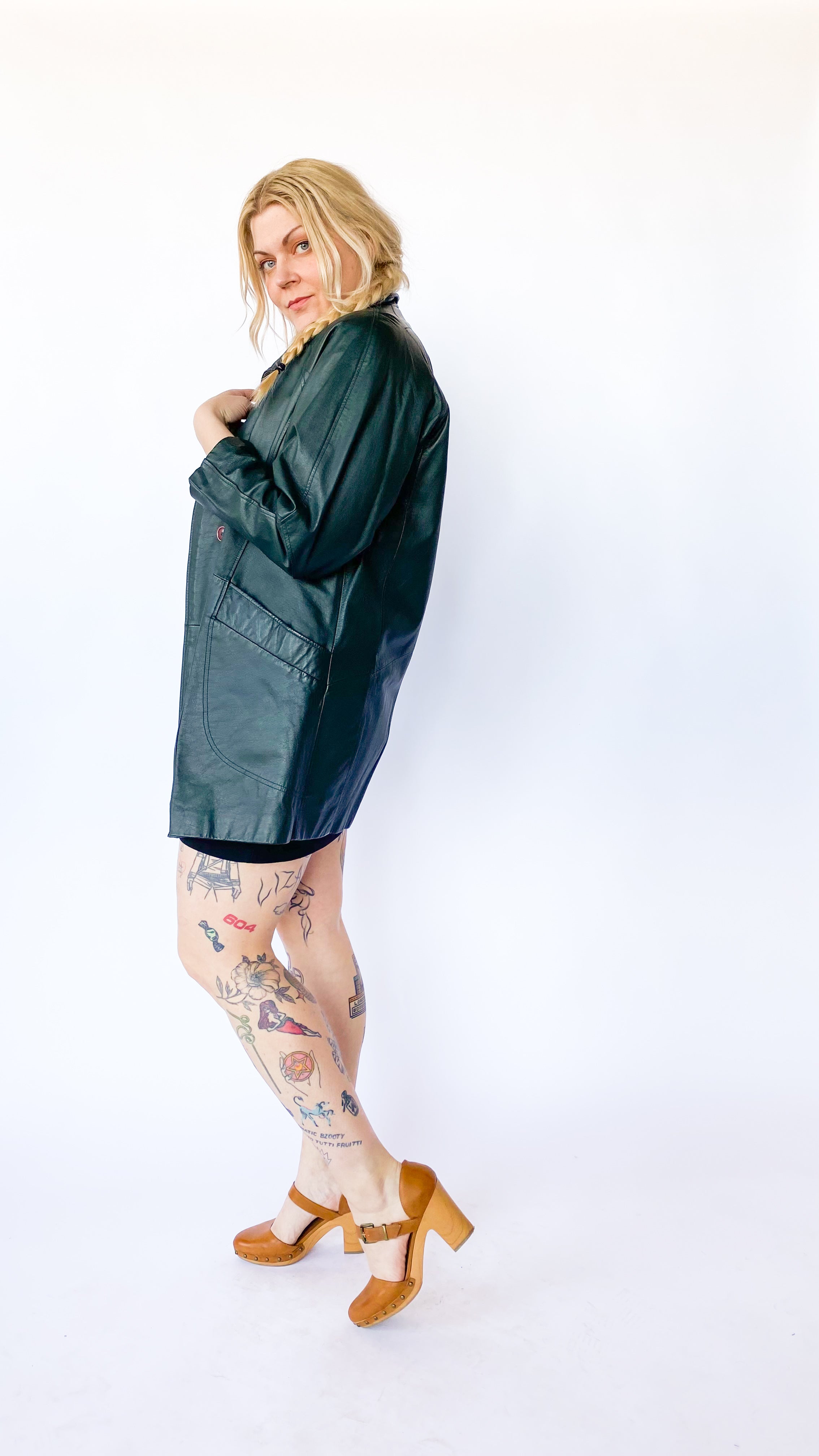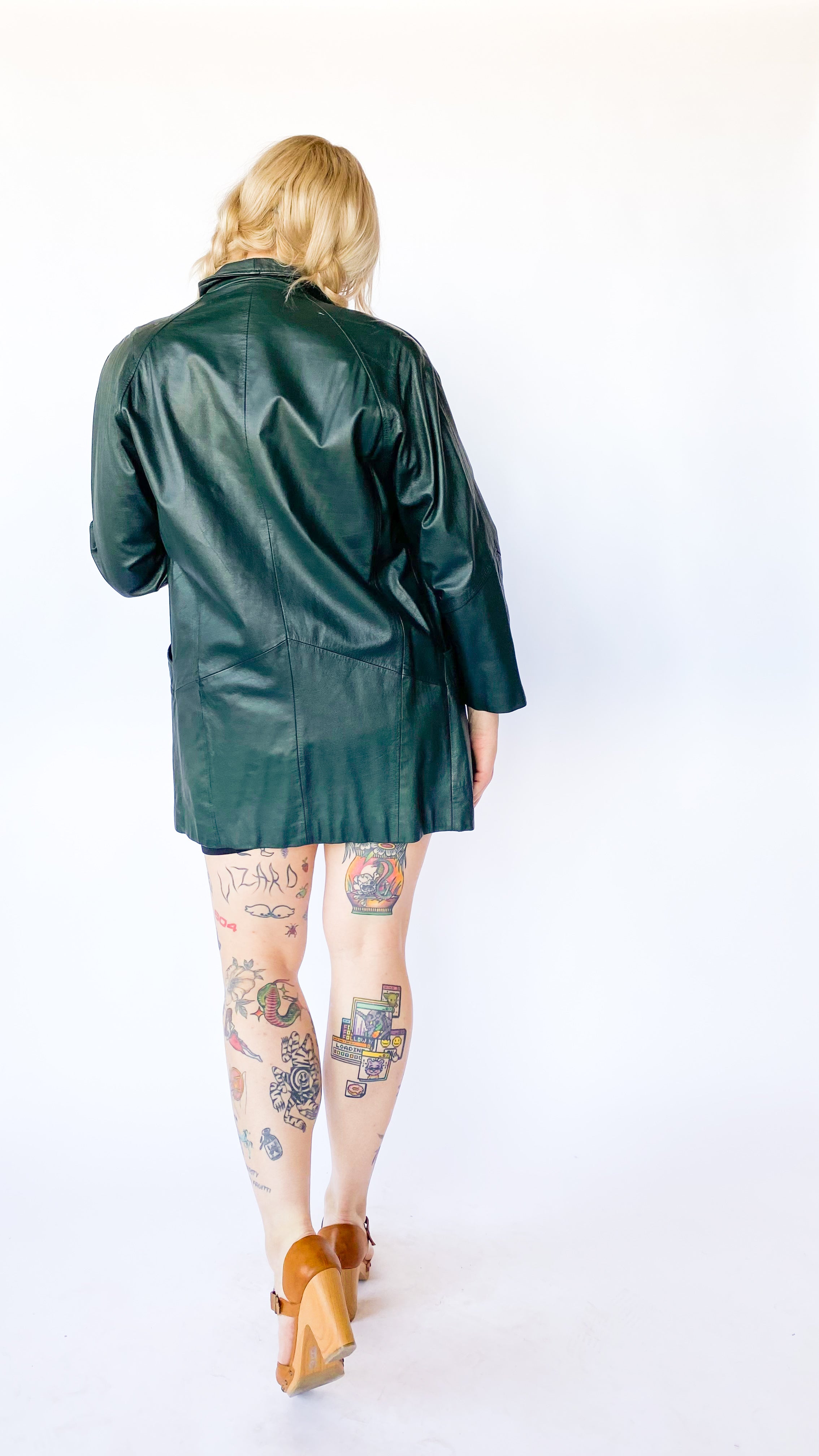 Description: Forest green collared leather trench coat with brown buttons. There are two front pockets. There is a fun zig-zag stitch on the shoulders.