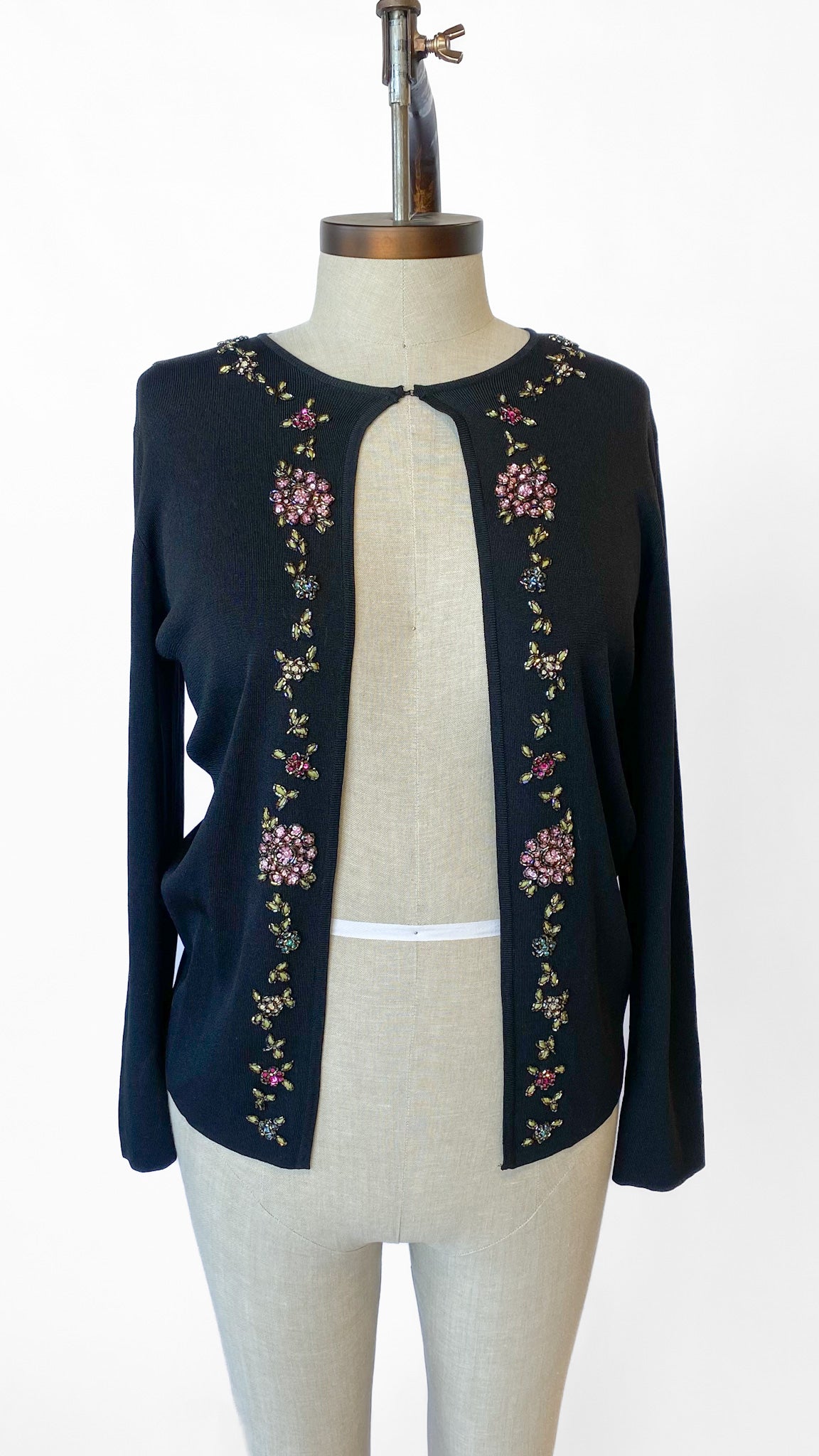 Black long sleeved cardigan with colorful floral beaded embroidery down the center front. Closure is a small hook and eye at the neckline.