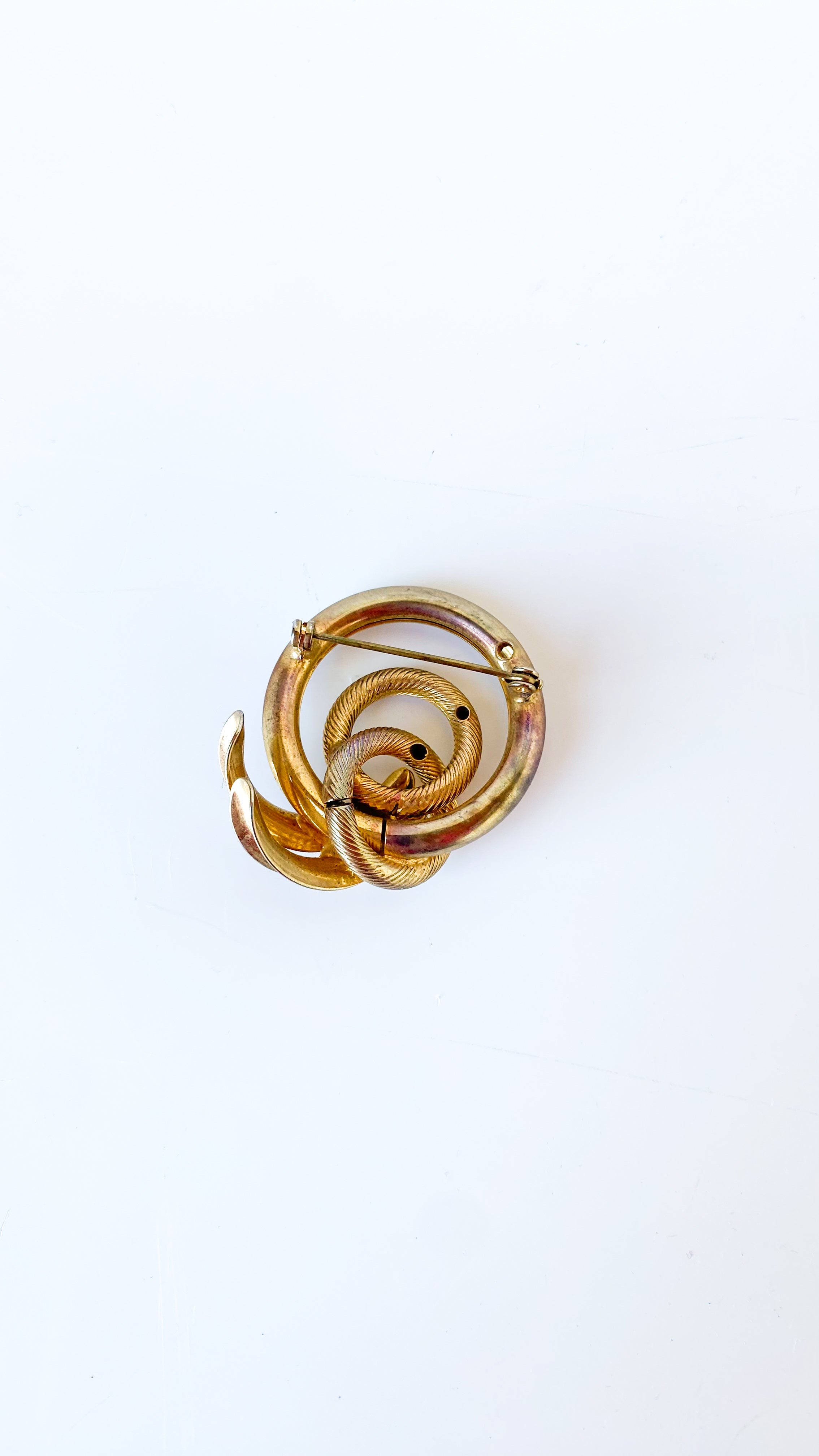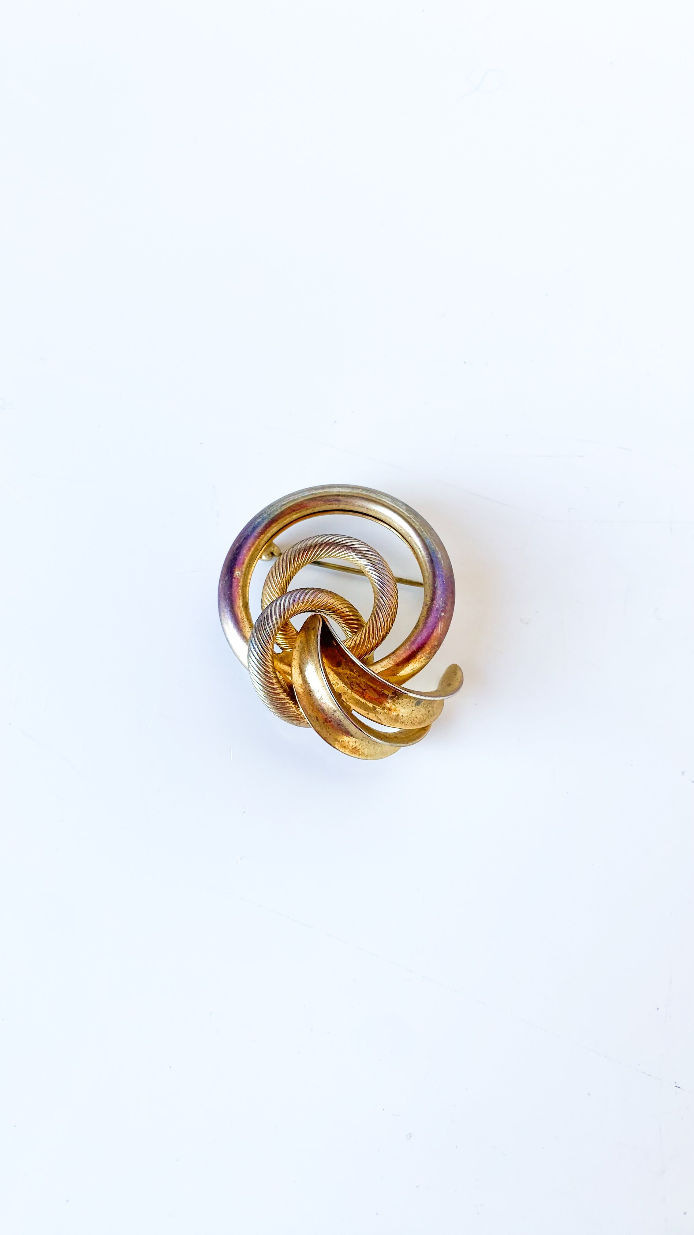 Description: Brooch with interlocking circles of different sizes and textures. Has classic pin backing.