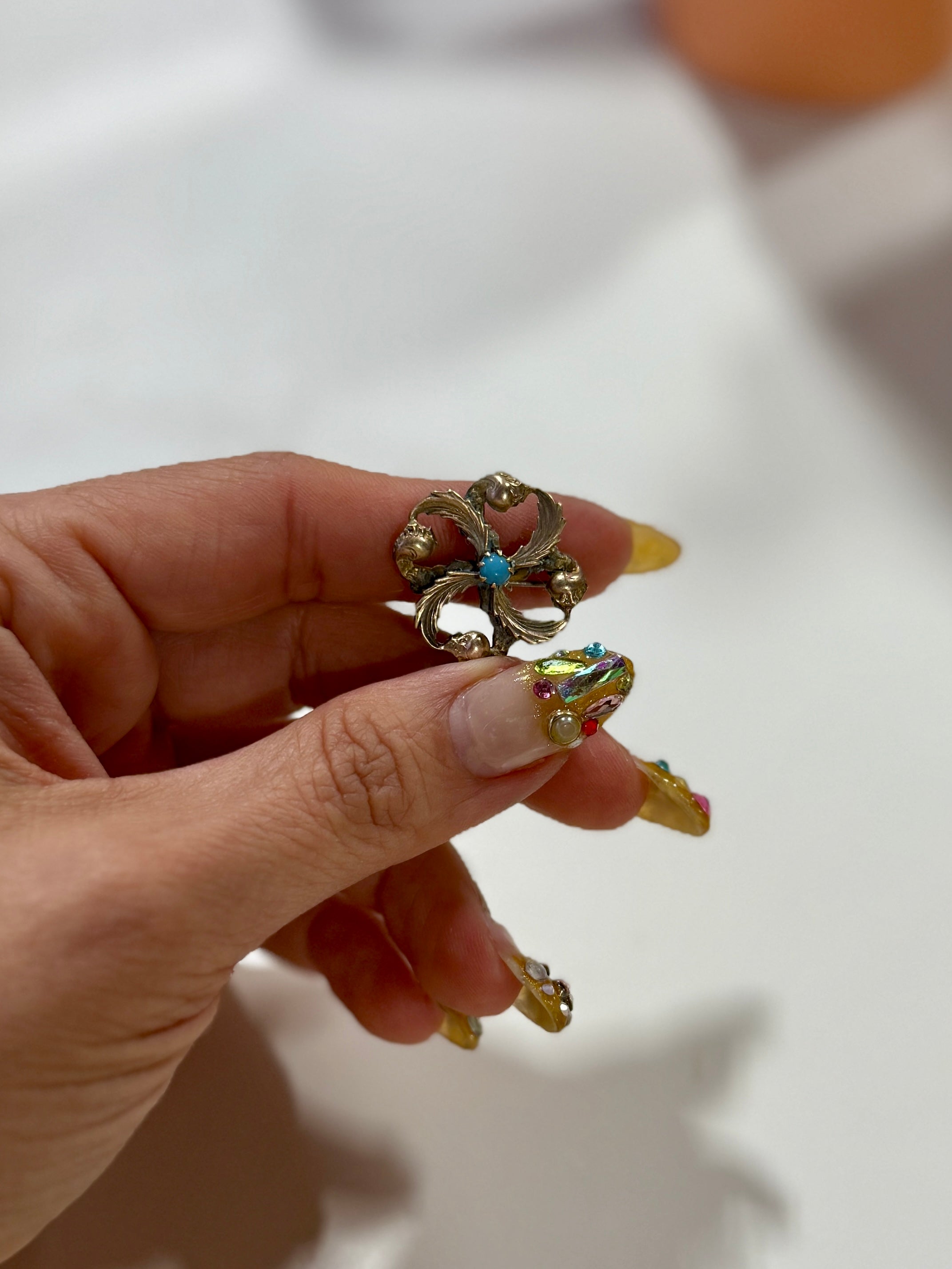 Description: Bronze brooch in ornate clover shape, with turquoise stone in center. Has classic pin backing.