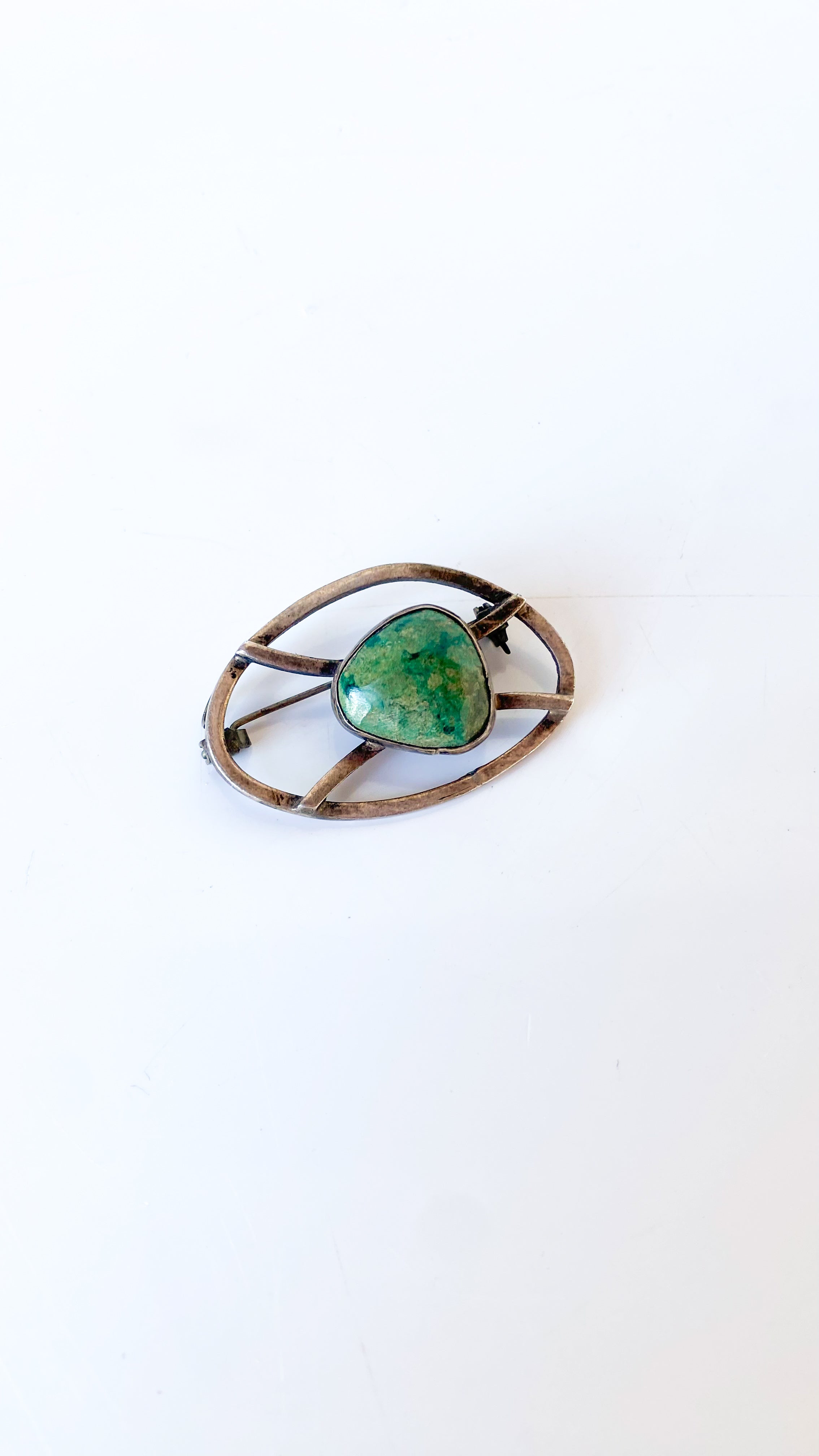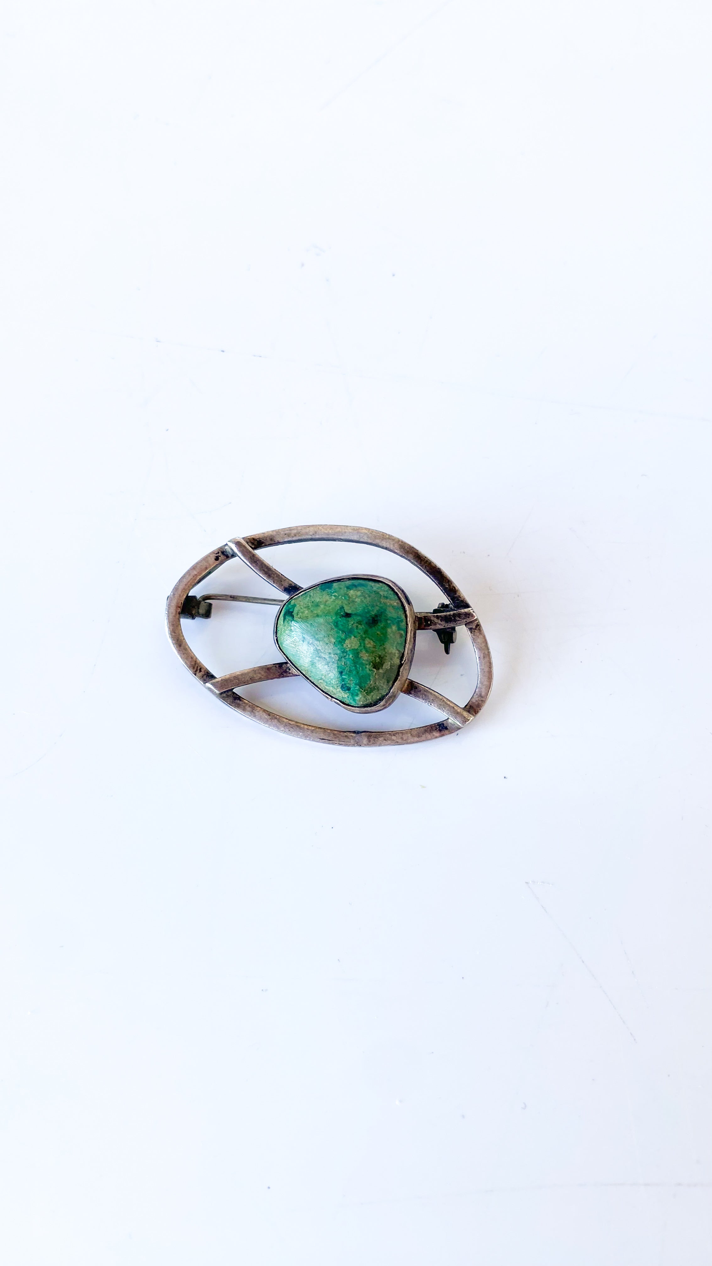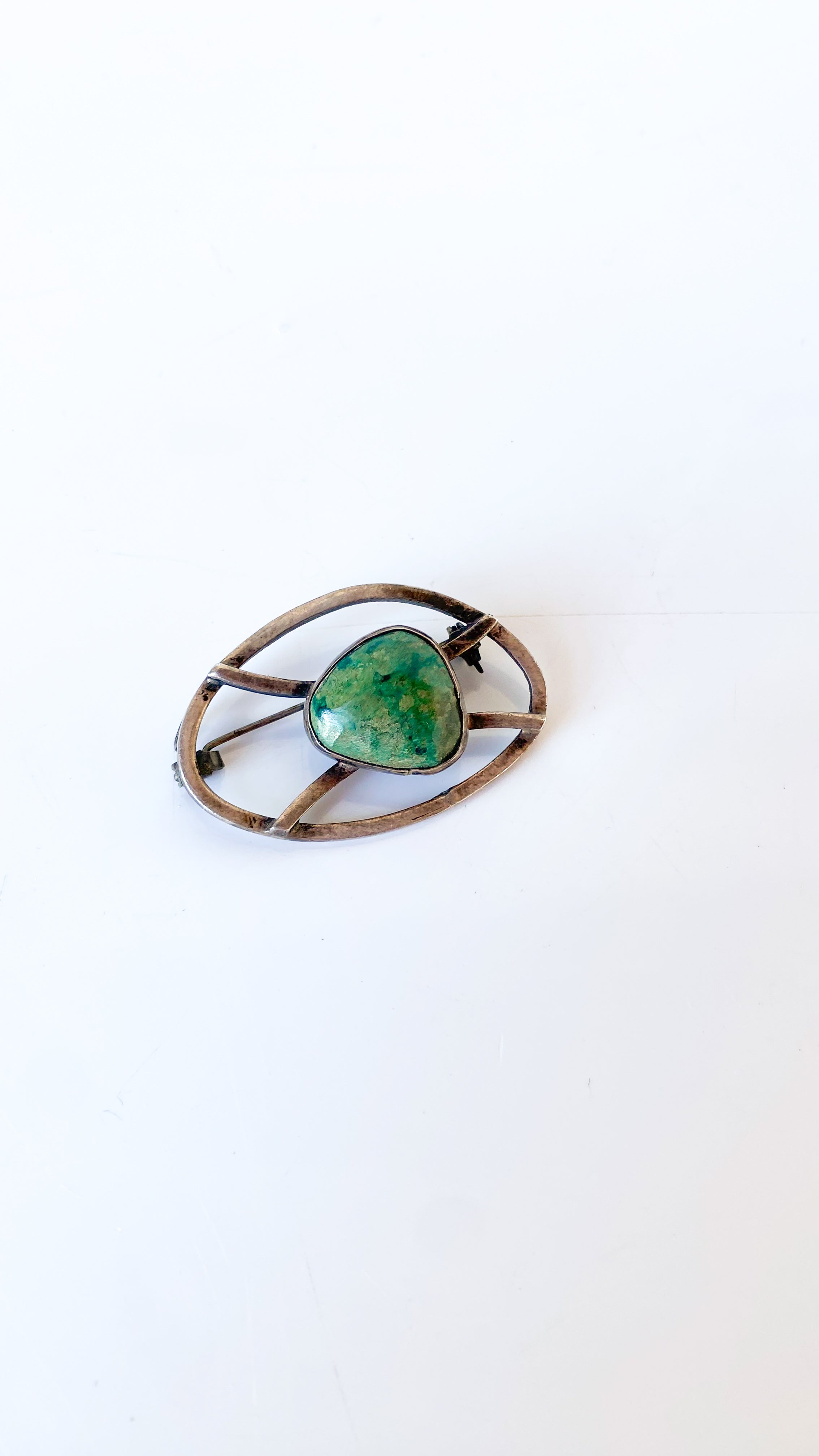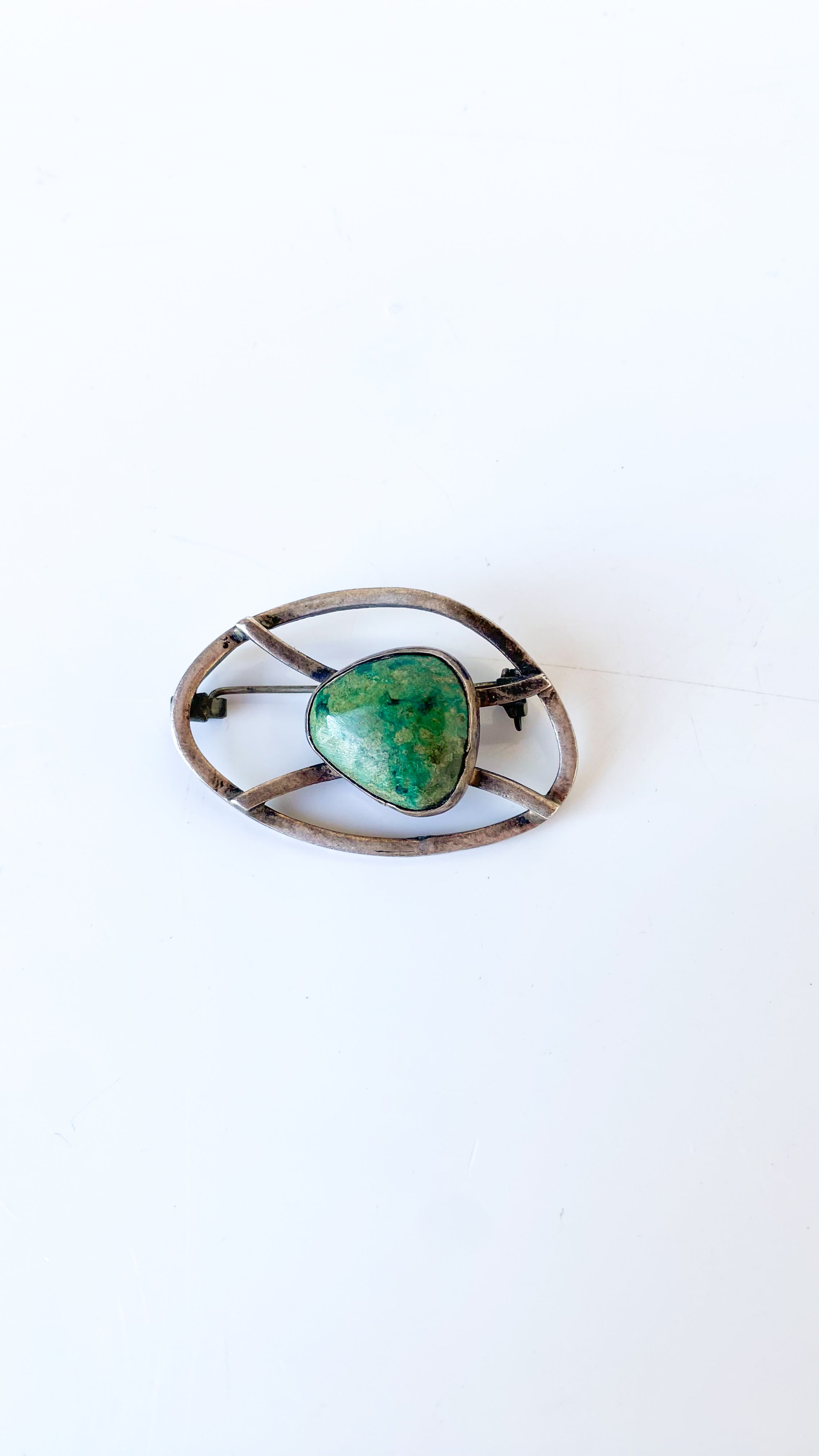 Description: Abstract oval sterling silver brooch with turquoise stone in center. Has classic pin backing.