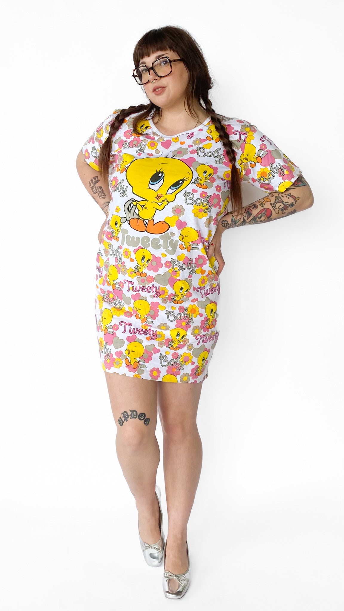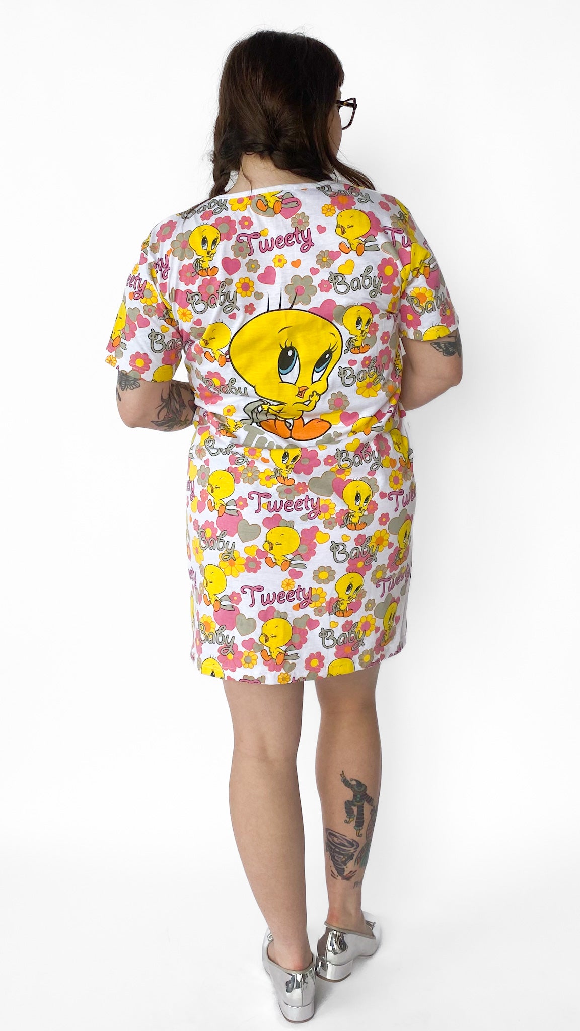White short sleeved t-shirt dress with Tweety Bird pattern featuring hearts, flowers, and text "Baby", "Tweety".