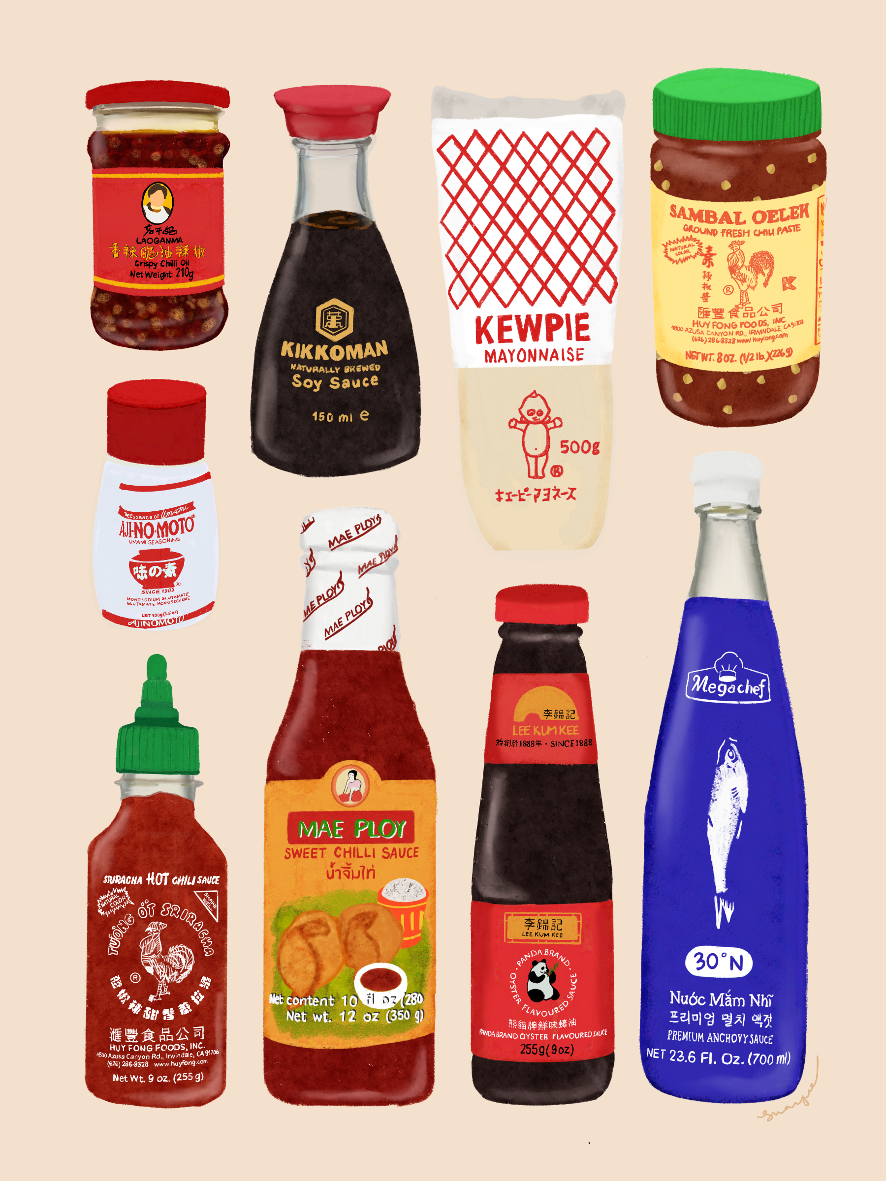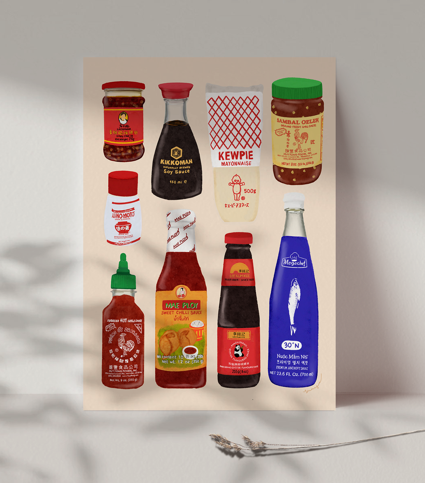 A high-quality print of some tried-and-true Asian condiments and pantry staples, the perfect thing for your kitchen or office space. Printed on elegance velvet fine art paper. 8x10"