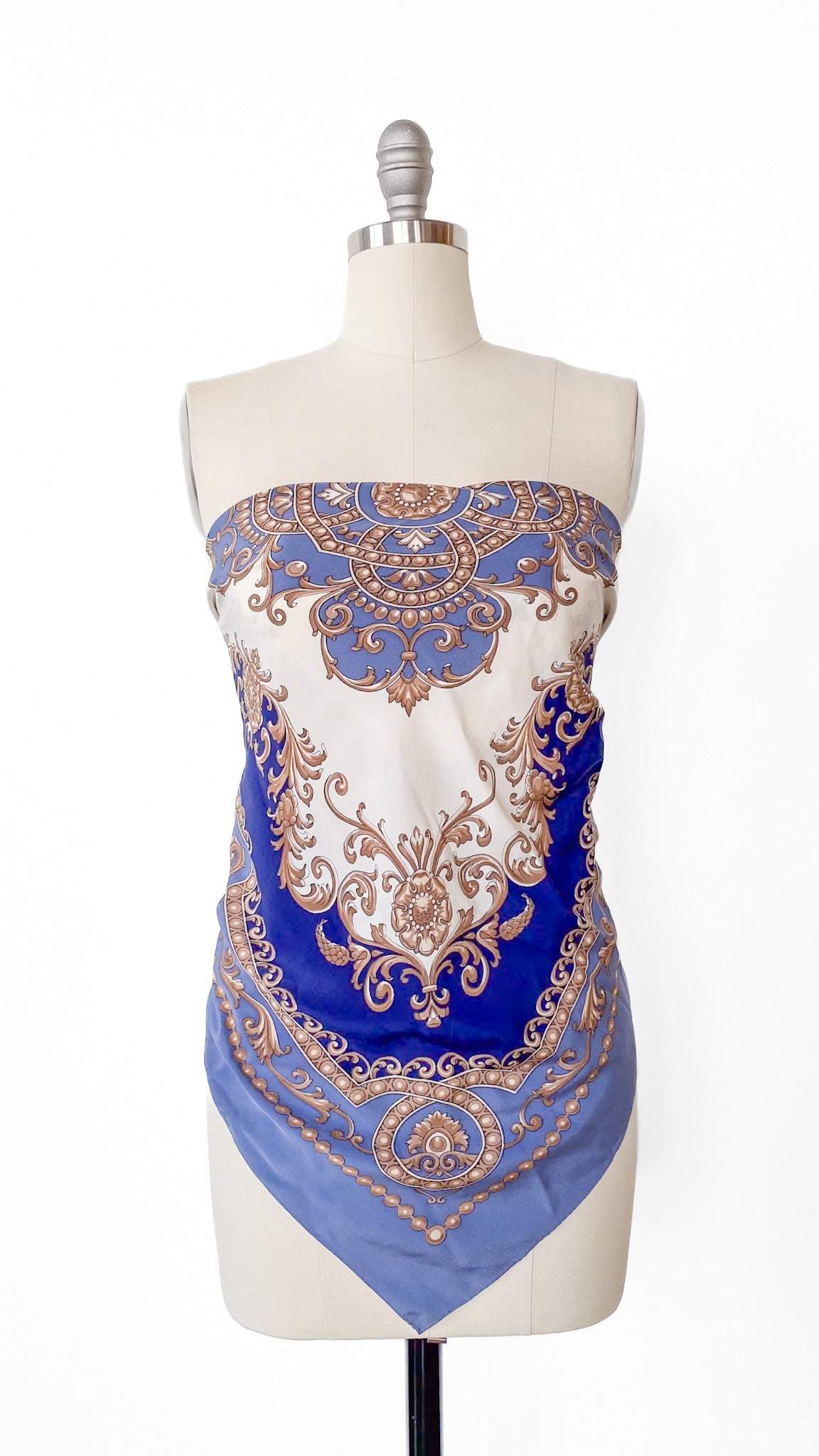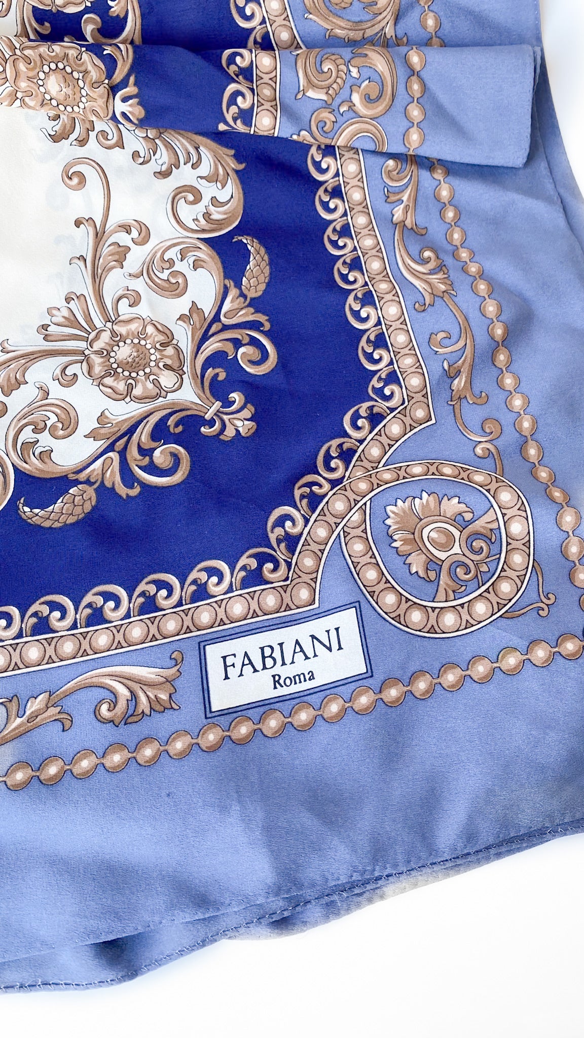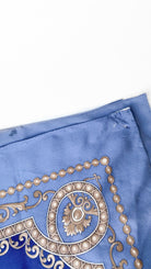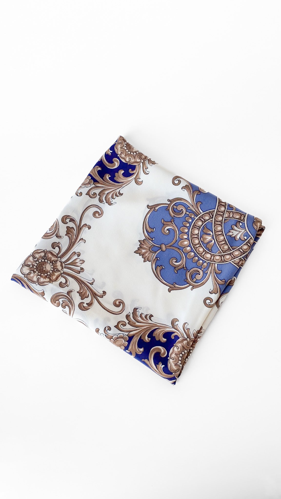 Navy blue scarf with light blue abstract paisley pattern throughout.