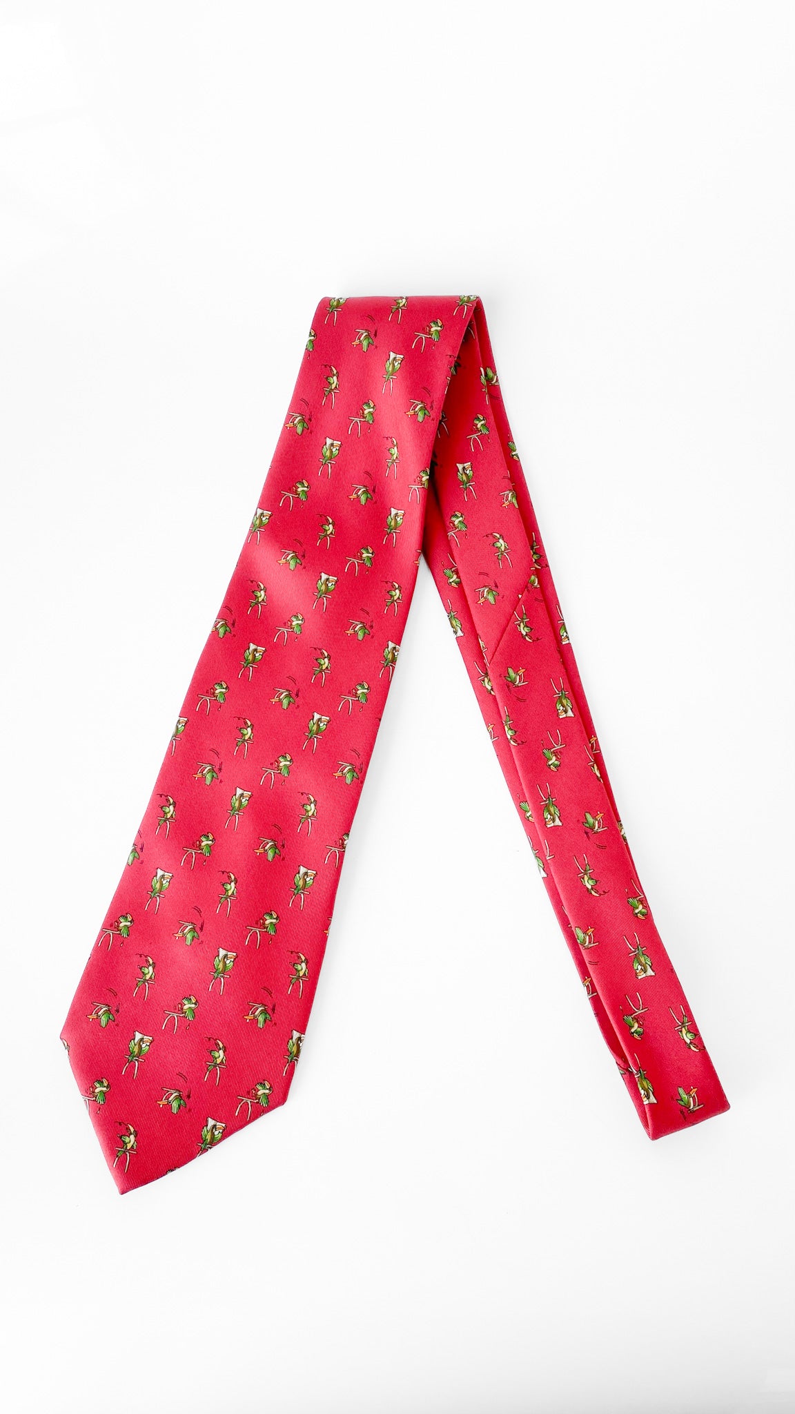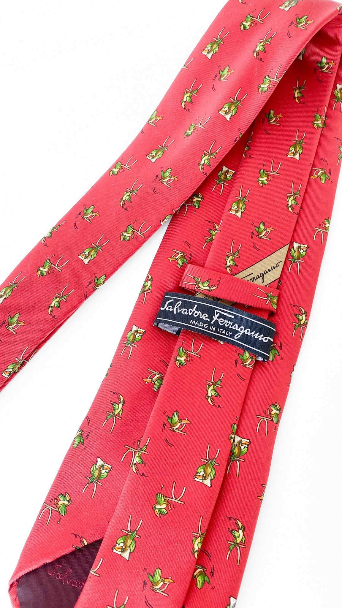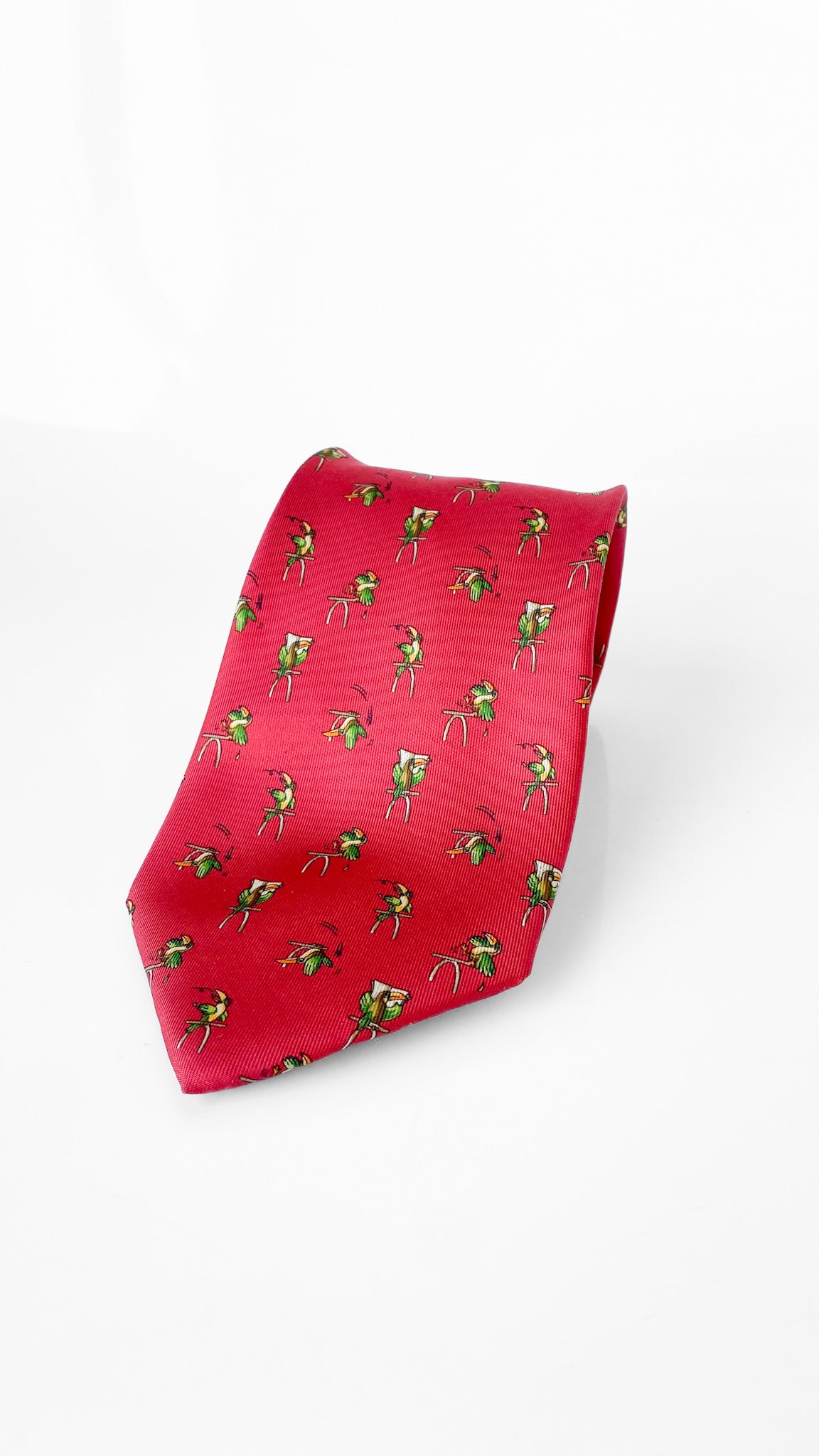 Red tie with pattern of parrot perched on ledge doing various activities such as reading, falling, and singing.