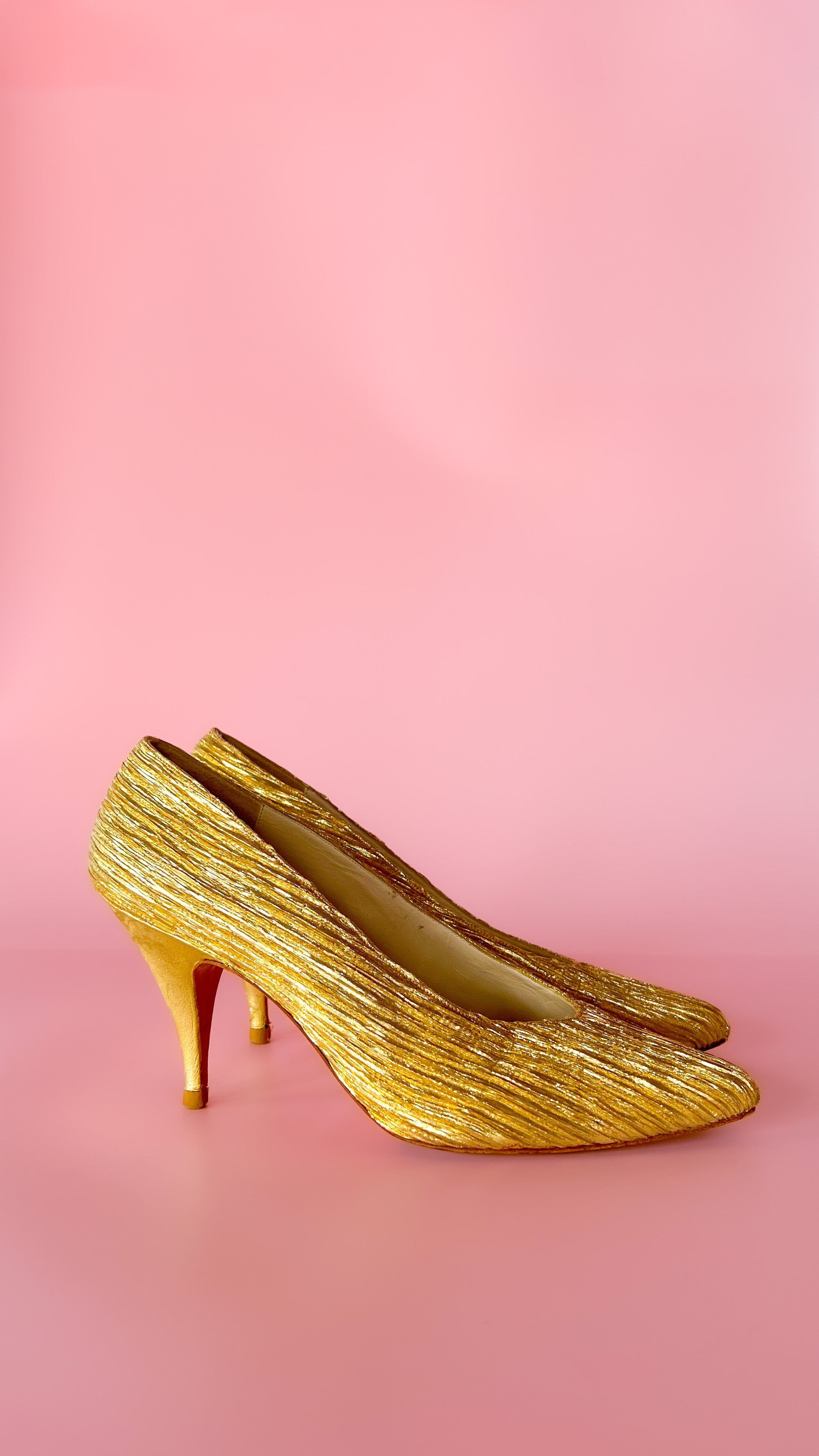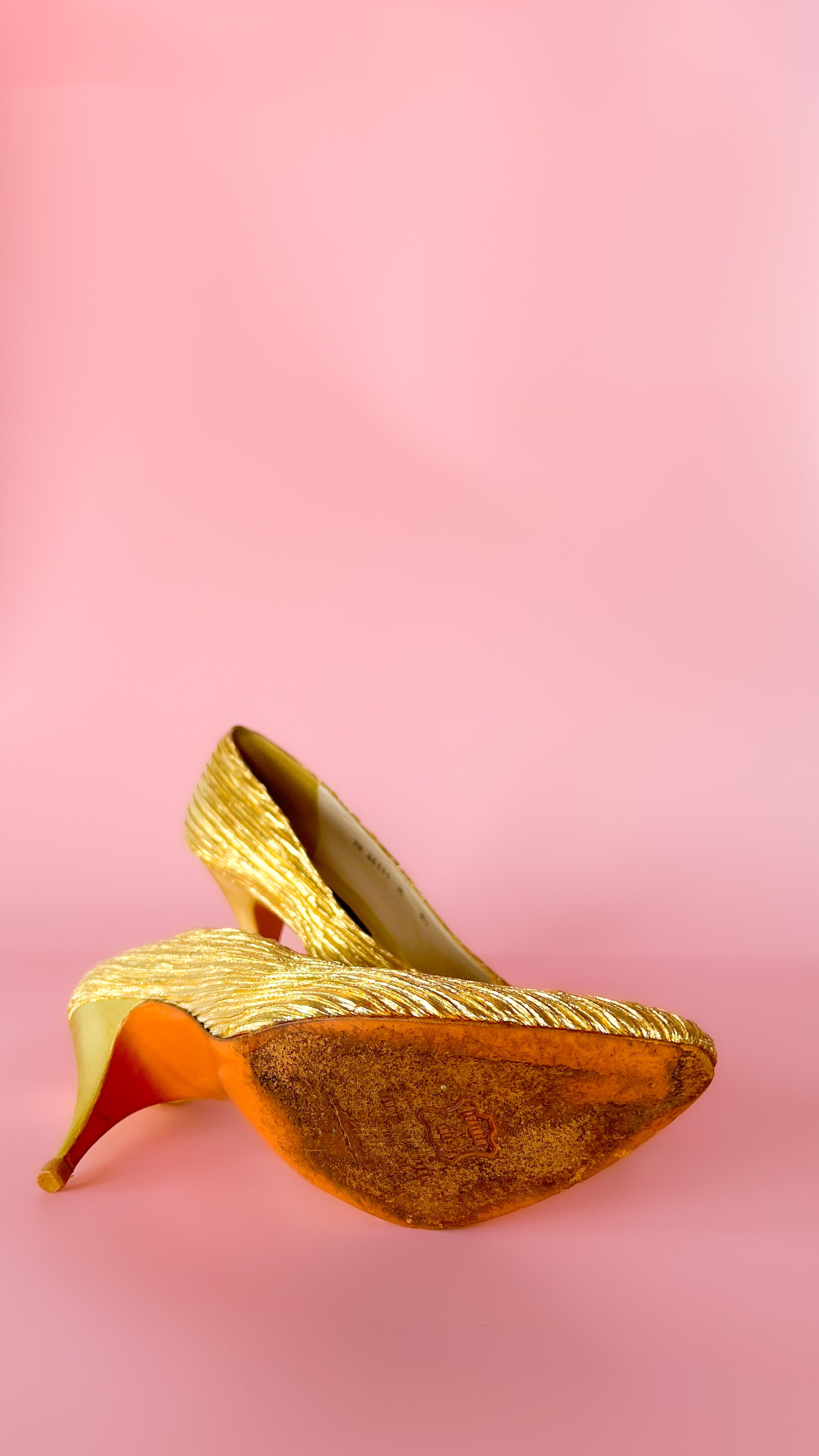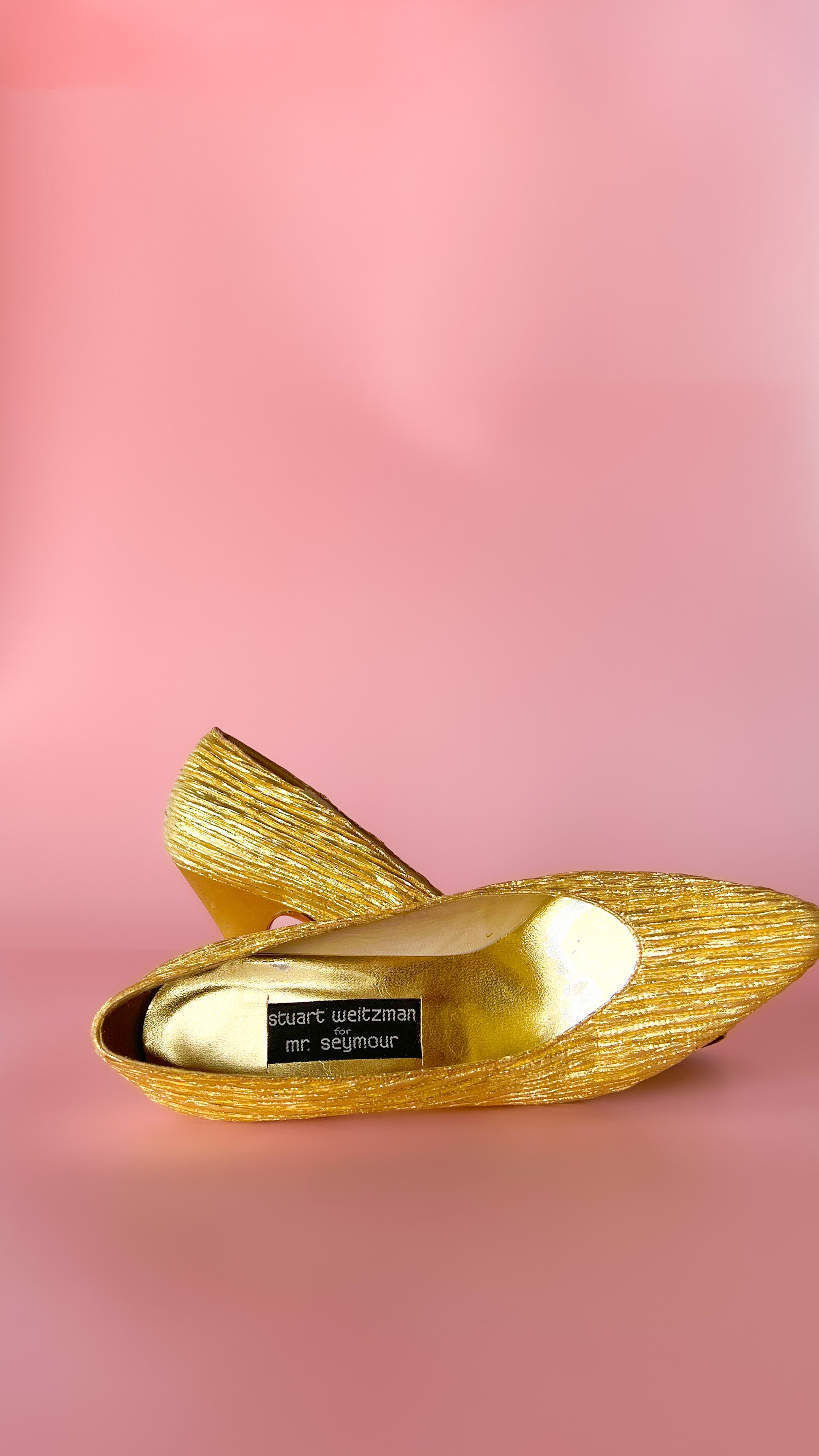 Stuart Weitzman gold textured heeled shoes. Perfect for the holidays and New Years! Good vintage condition - some scuffing and denting on the heels.