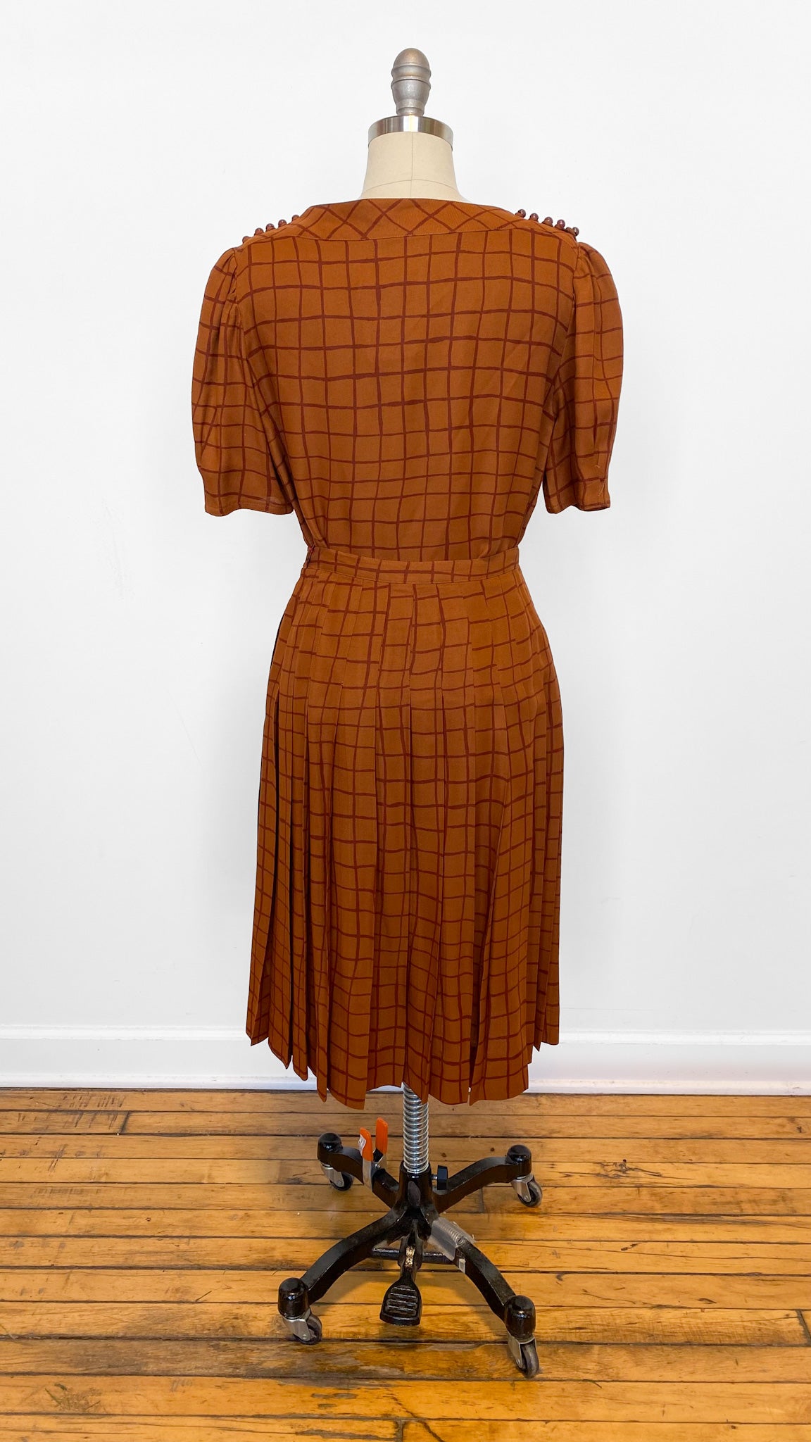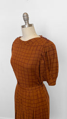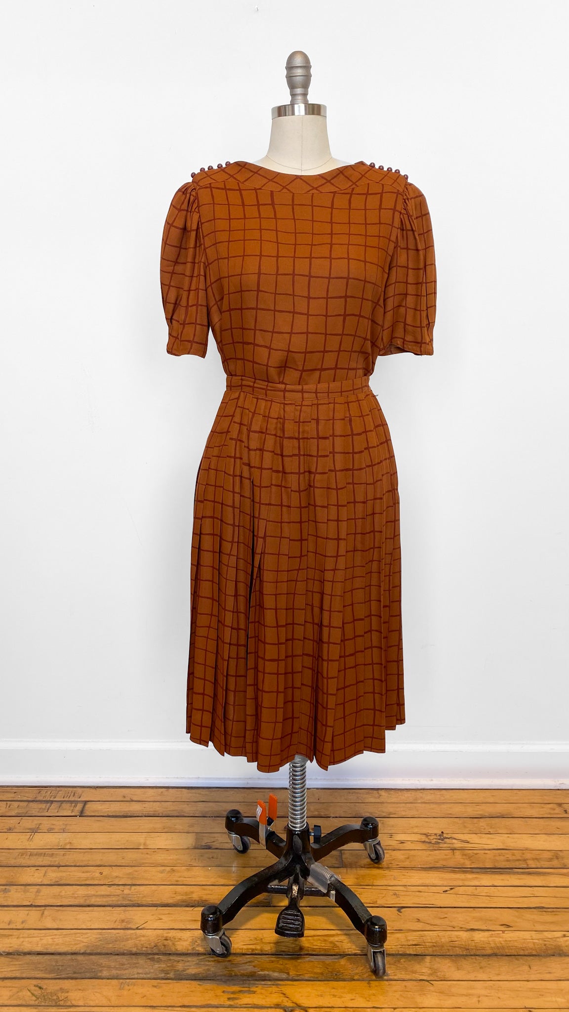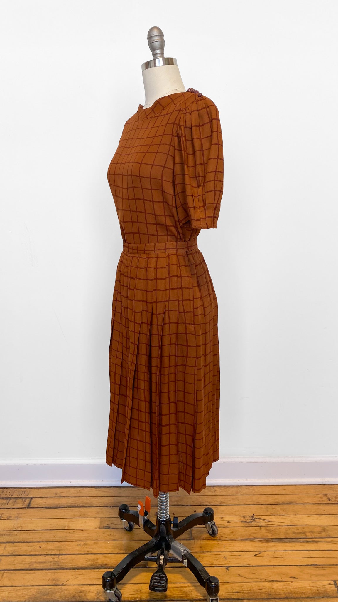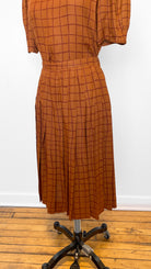 Copper brown shirt and skirt set with darker brown windowpane pattern. Shirt has gathered short sleeves and buttons along the shoulder seams. Skirt is pleated.