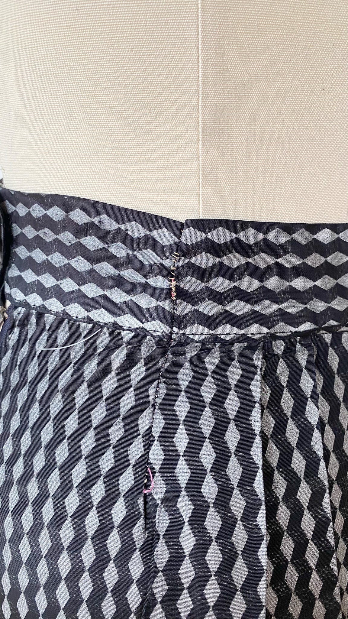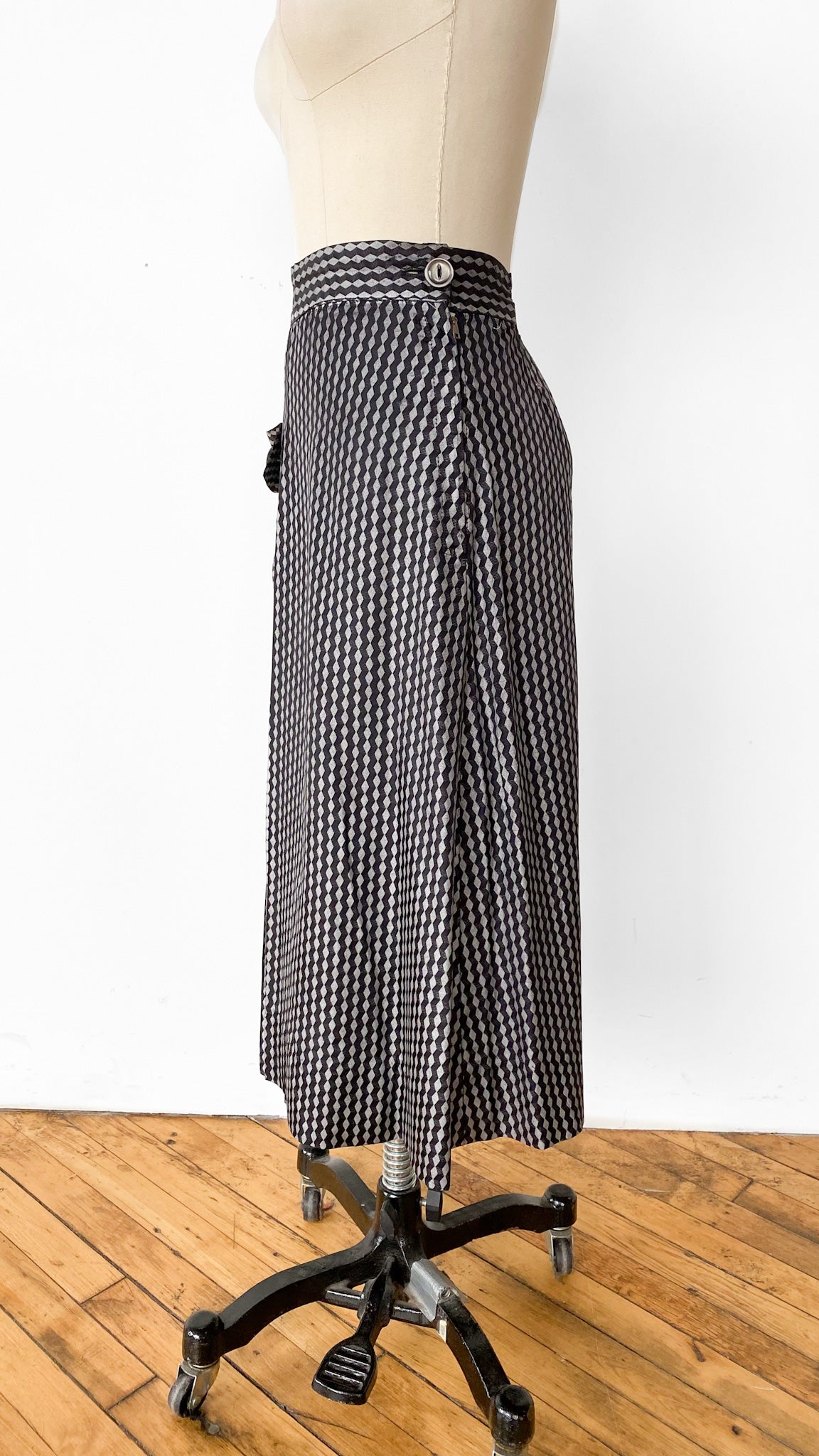 Black and gray diamond patterned long A-line skirt with box pleat in center front and a series of pleats in the center back. One patch pocket on center right with large decorative velvet button. Side zipper. Priced as-is.