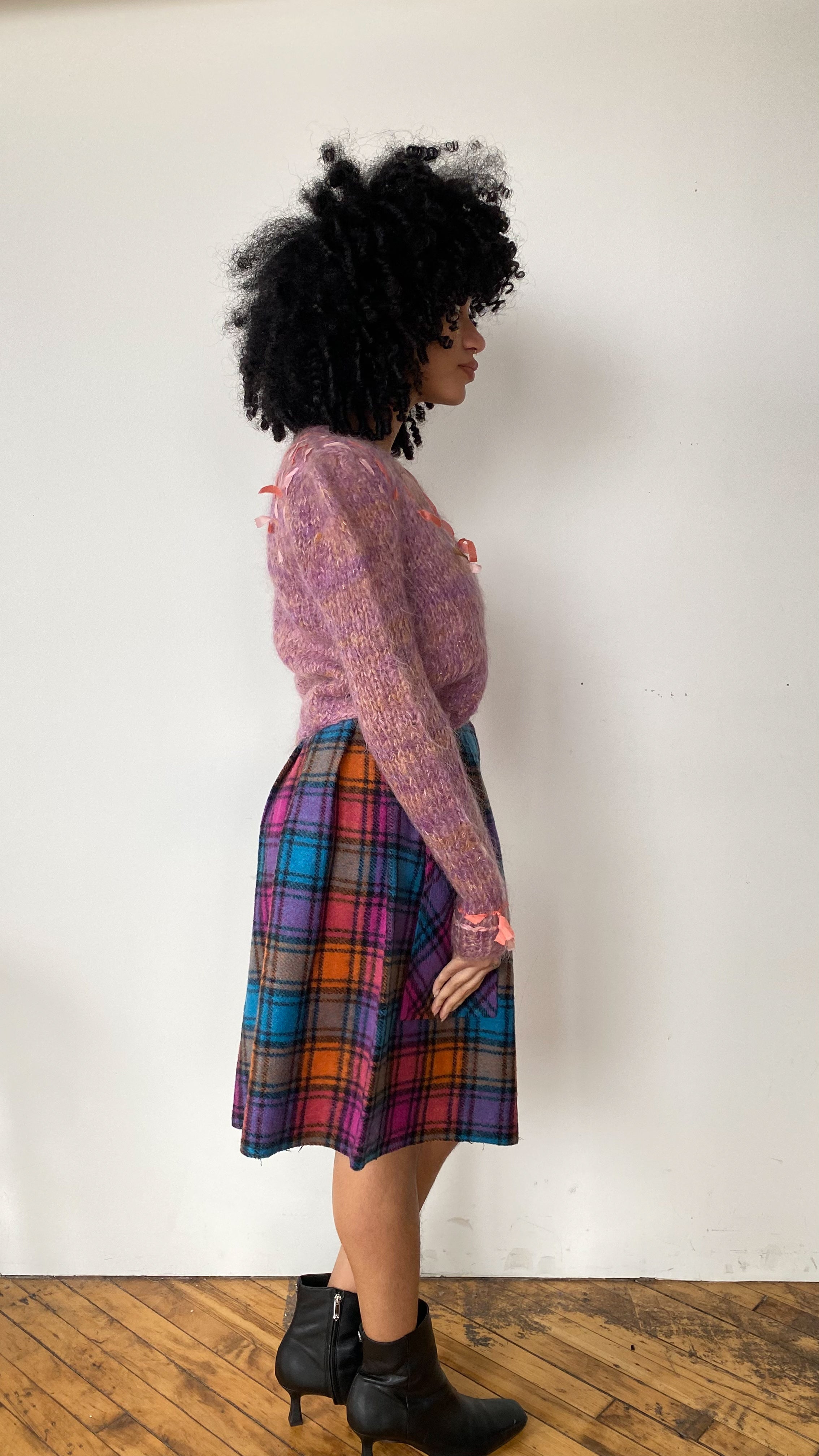 Multi-color wool pleated plaid skirt with button closures down the front. There are two large front pockets.