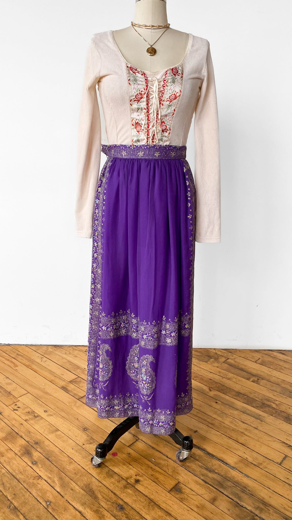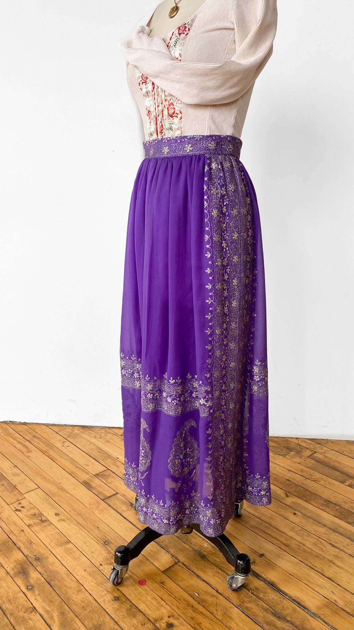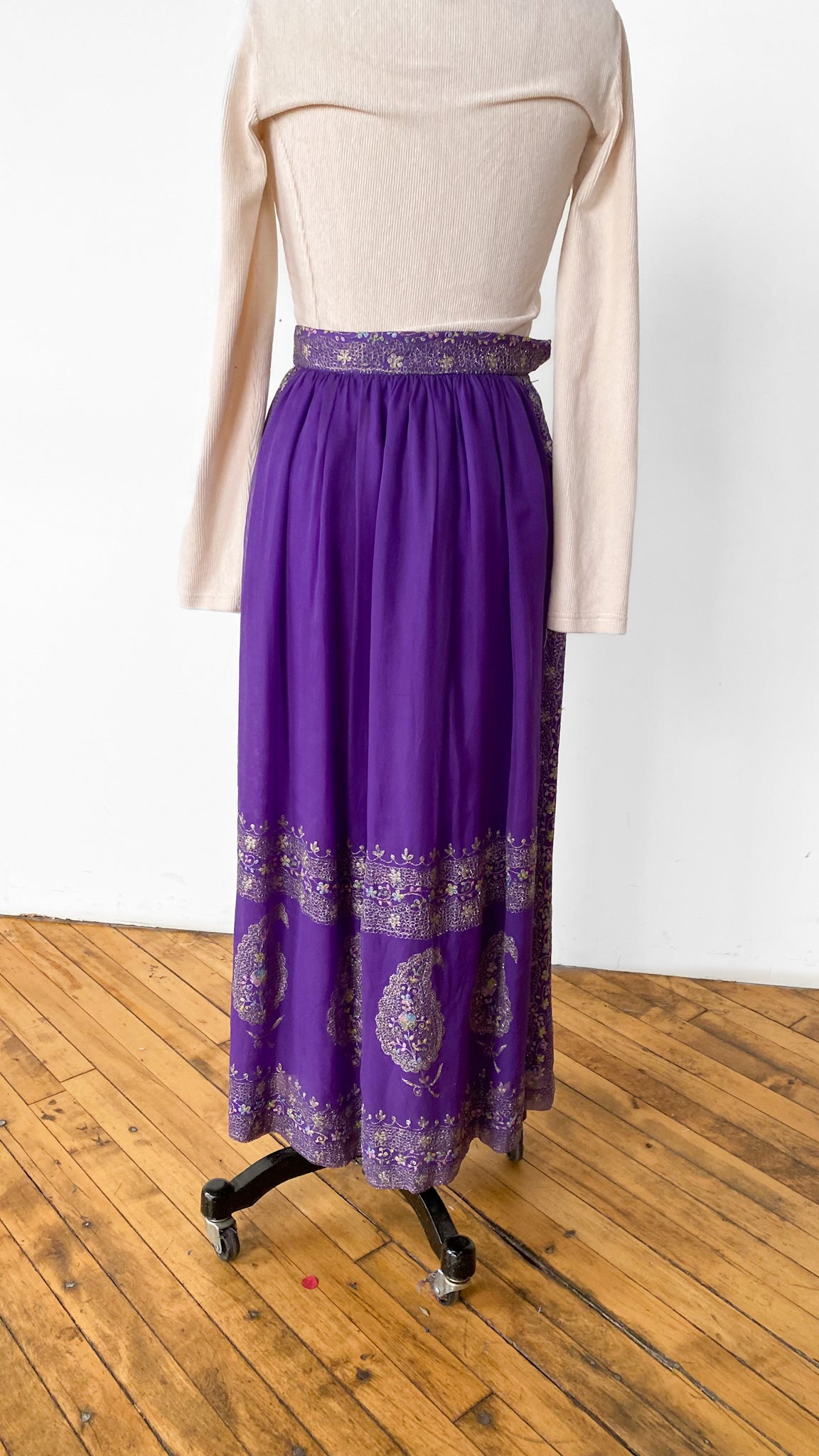 Full length purple skirt with ornate metallic embroidered decorations including large paisley shapes.