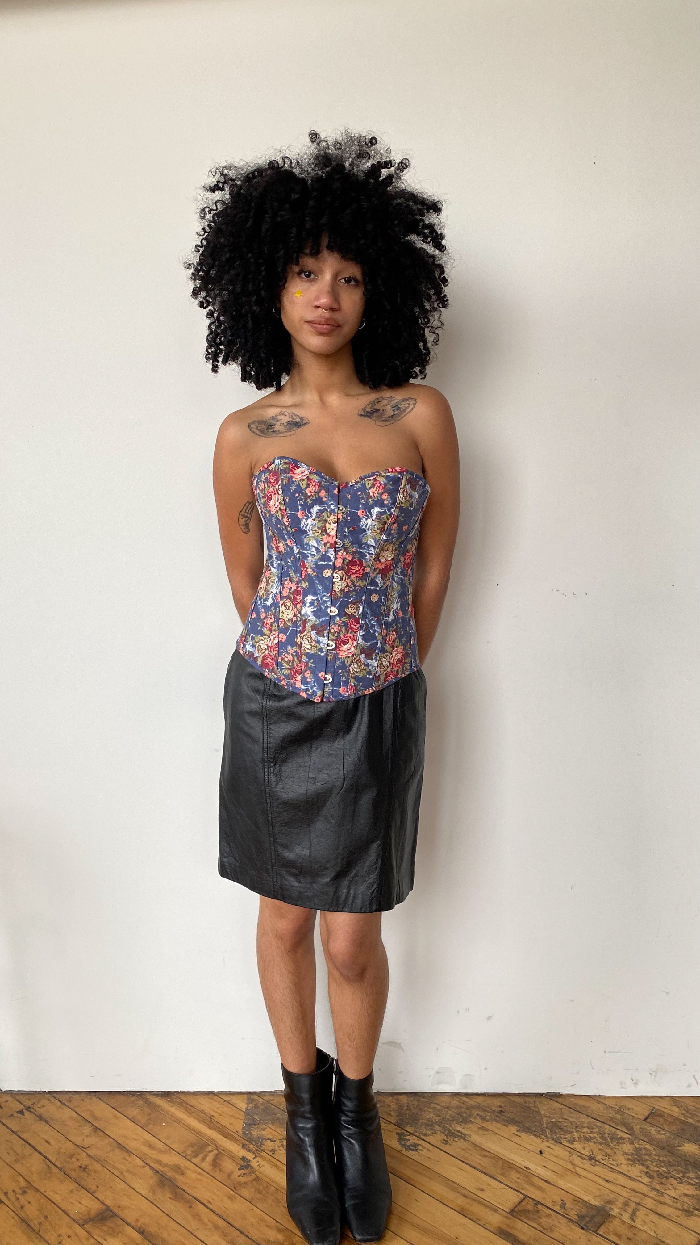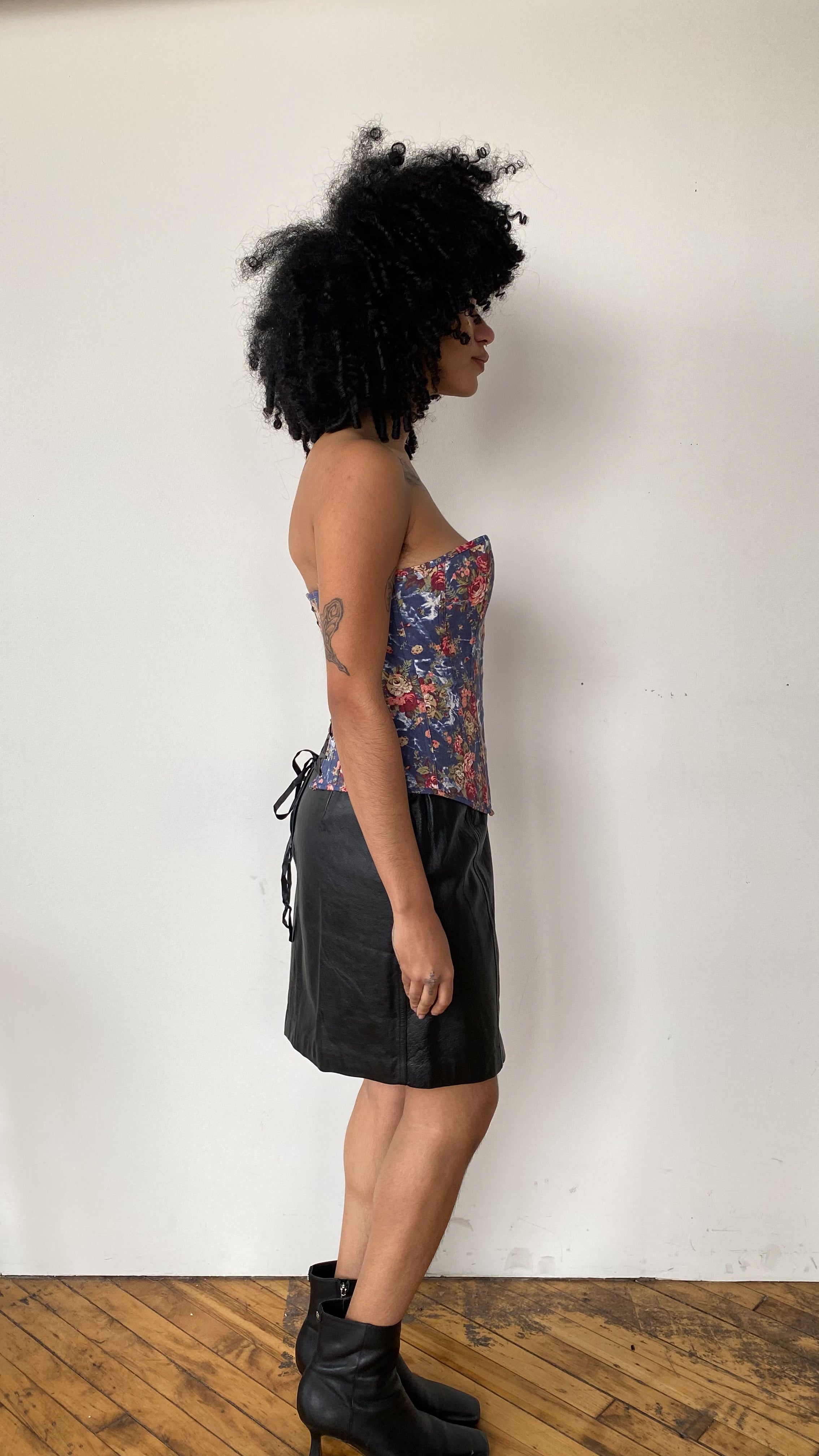 Black leather skirt. Two small panels of elastic on the sides of the waist giving a slight ease in fit. Snap button and zipper down the back.