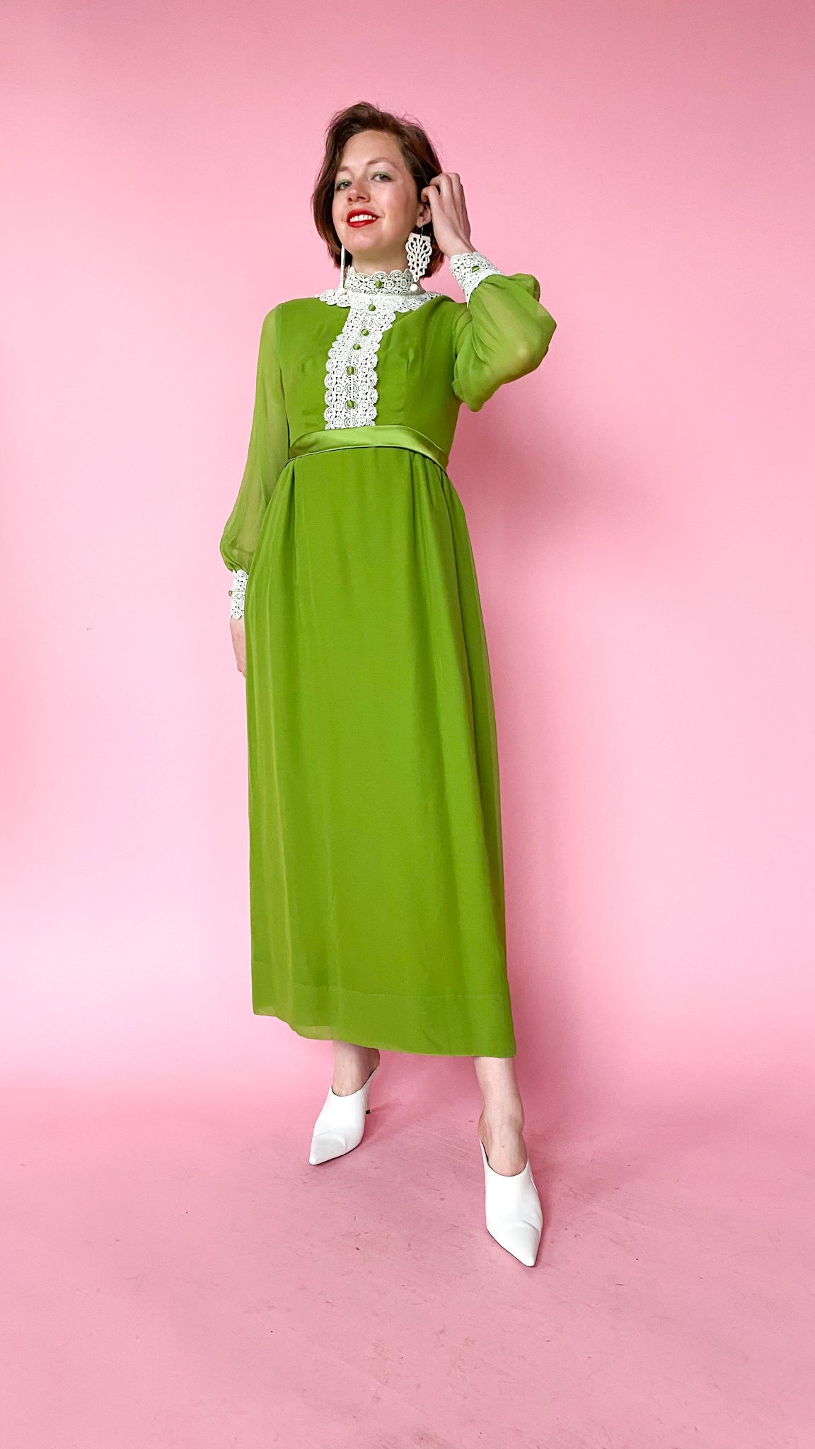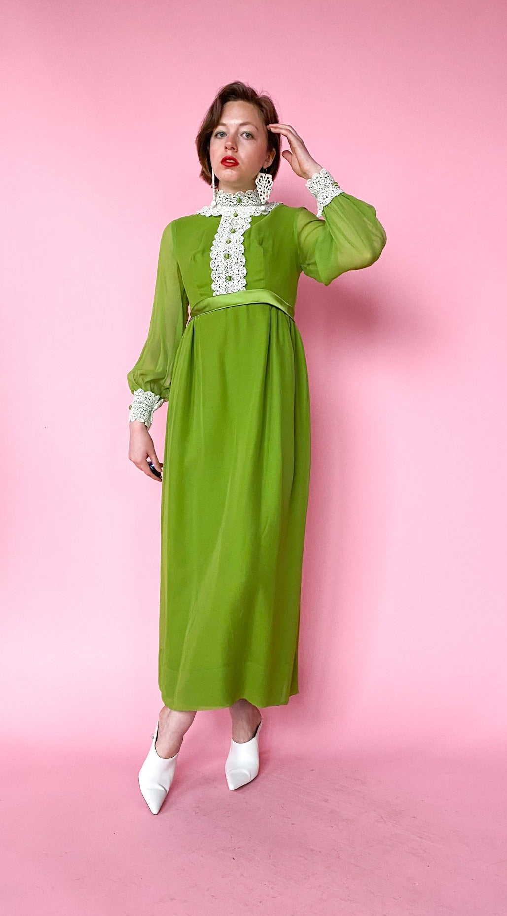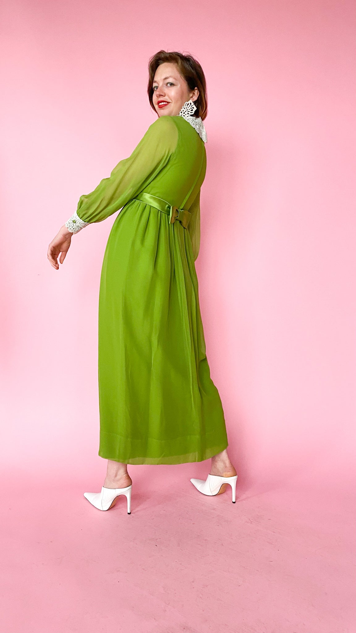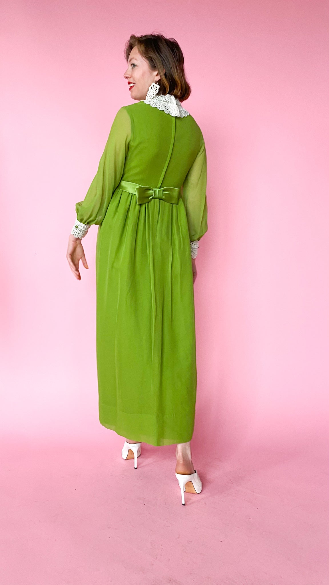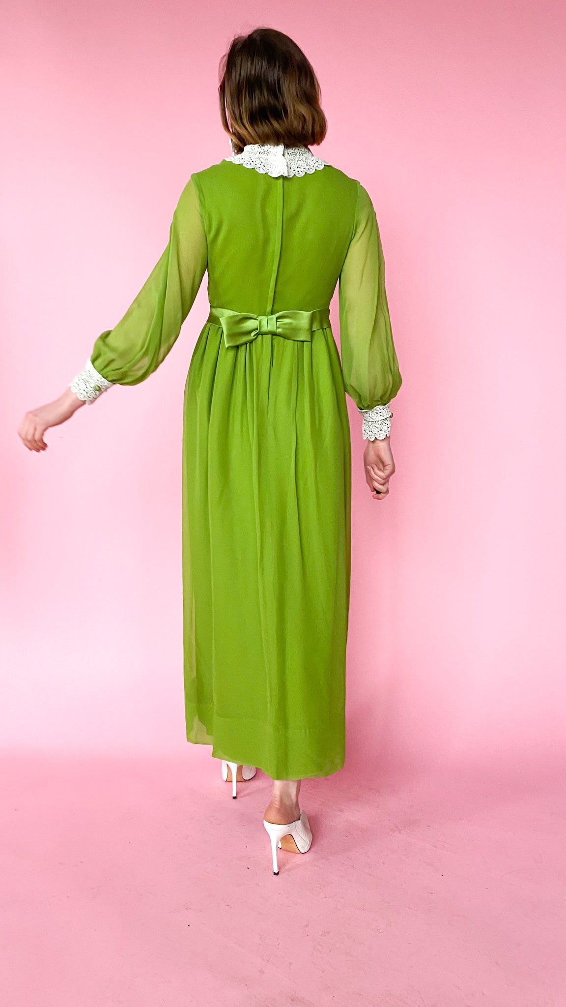 Green dress with eyelet lace at the bust, neck, and cuffs. Bow in the back. Center back zipper. Long sleeves. Lined.