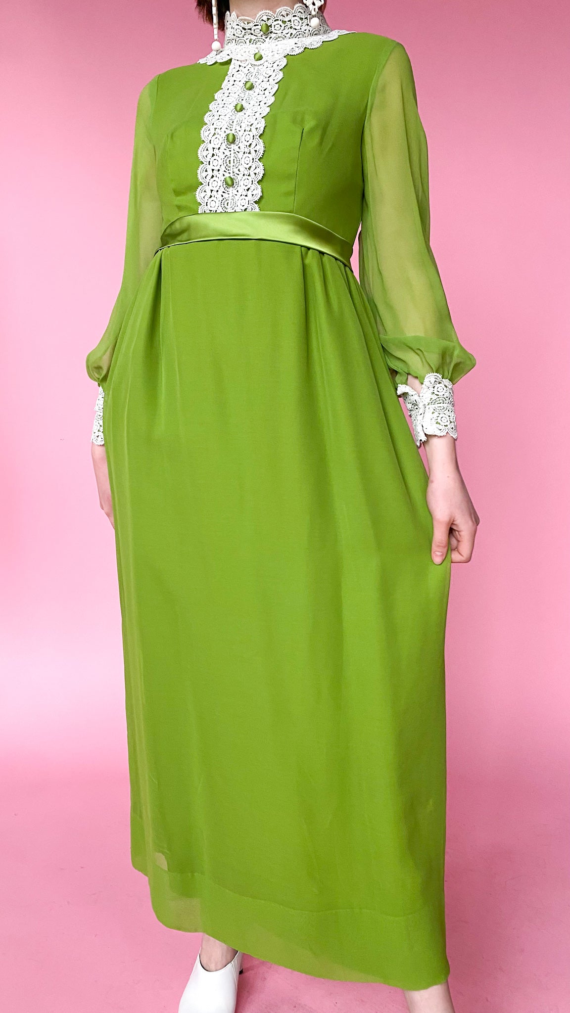 1970s Green Lace Trim Maxi Dress, sz. S