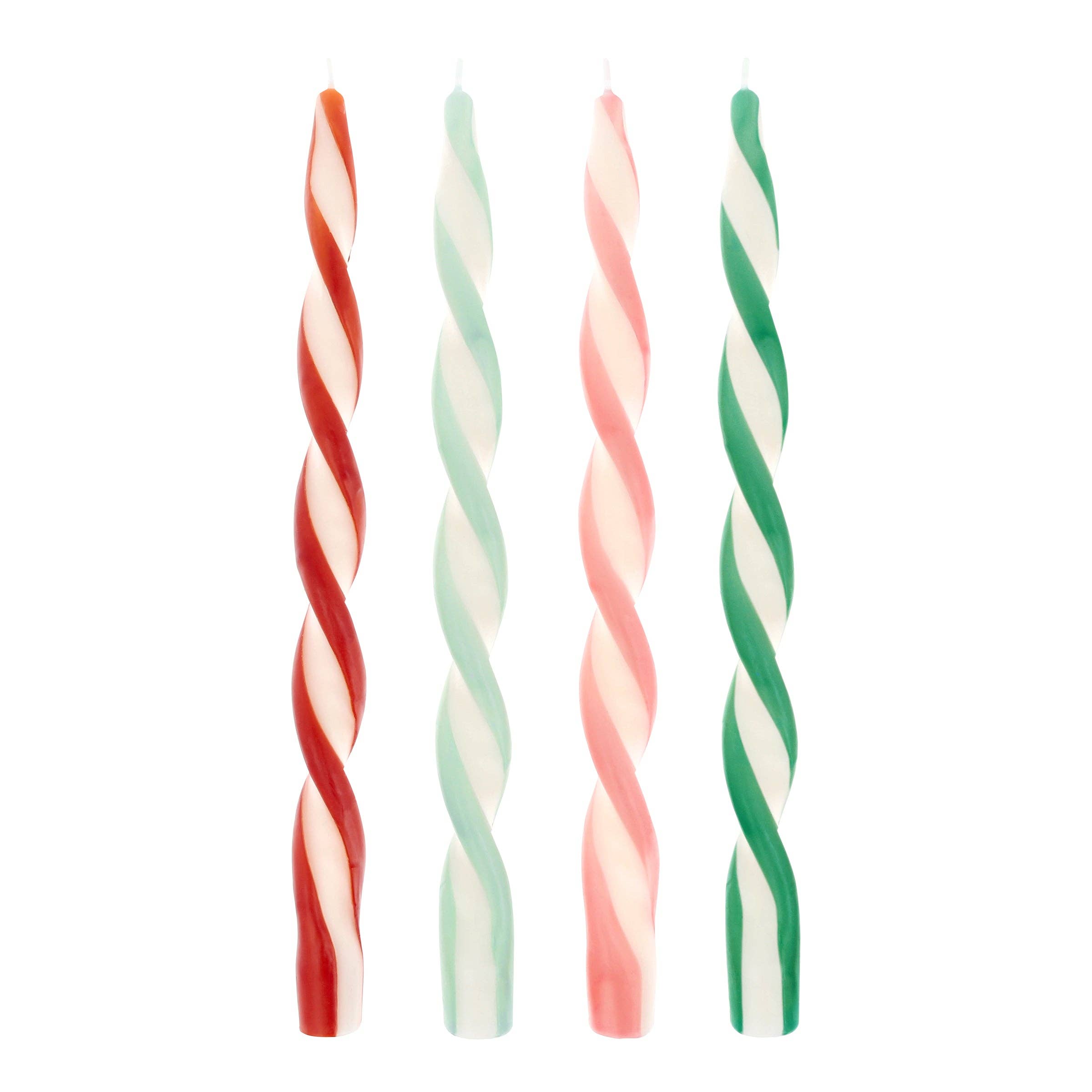 Pack of 4 wax twisted candles in 4 different colorways - ivory and mint, ivory and red, ivory and pink and ivory and green; Burn time is approximately 5 hours; Unscented