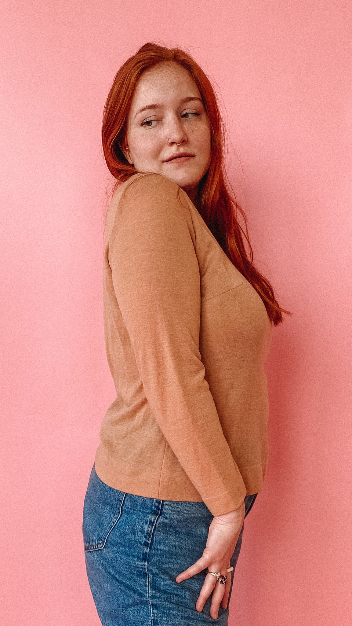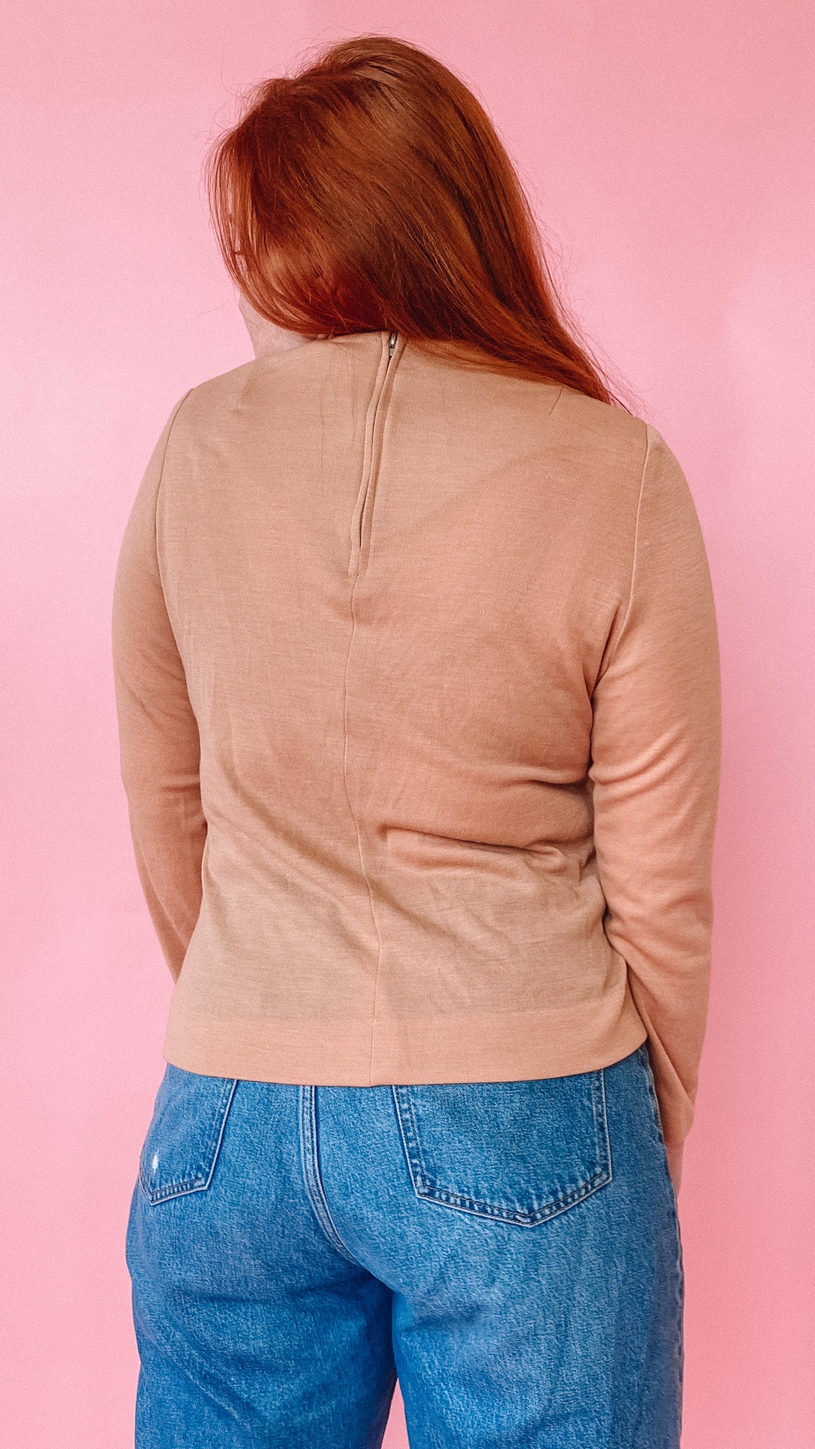 Long sleeve knit top in a peachy camel color. There is a short zipper up the back.