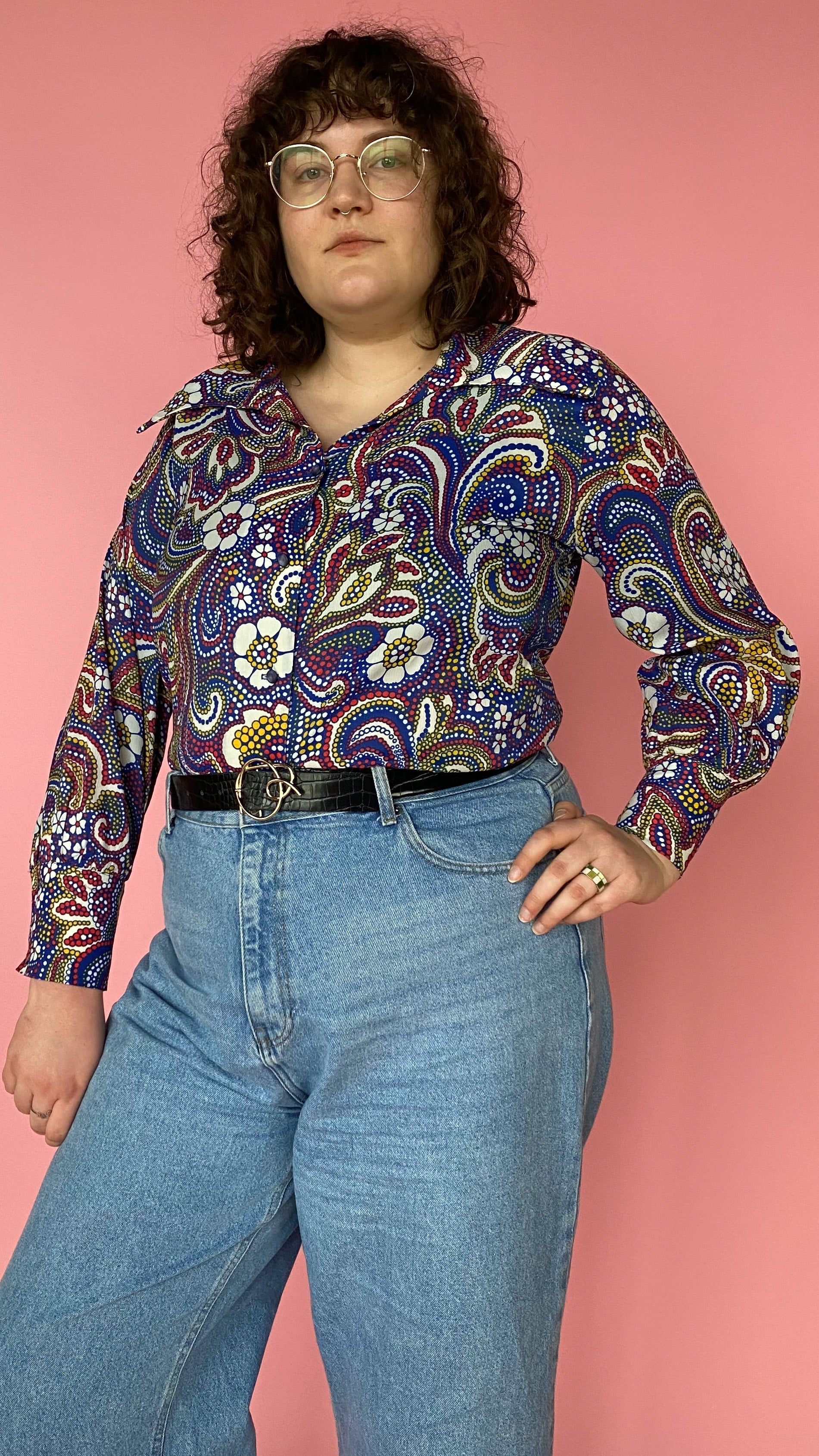 Floral pattern made up of a series of dots in primary colors. Classic 70s dagger collar. Buttons up front. Slight balloon sleeve.