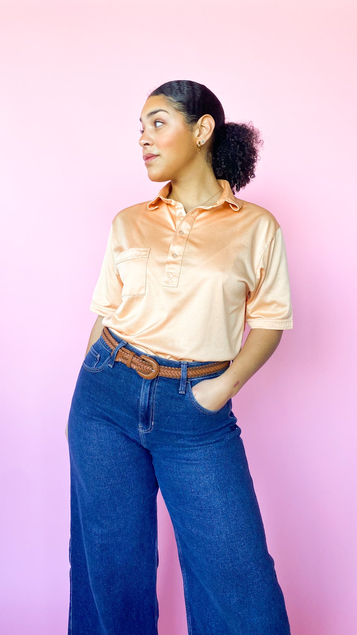 Creamsicle orange short-sleeved top with buttons to the bust. Pointy collar.