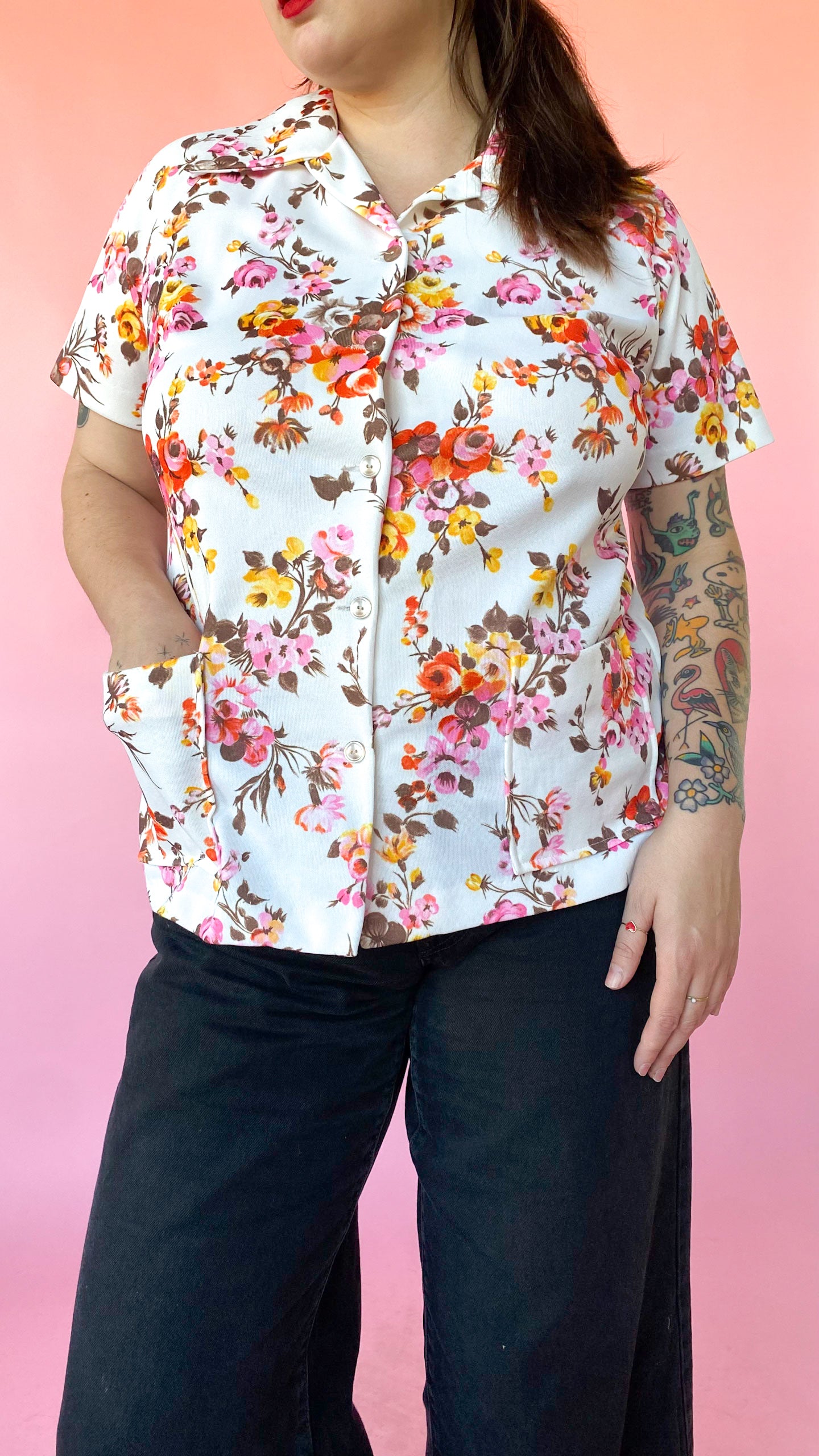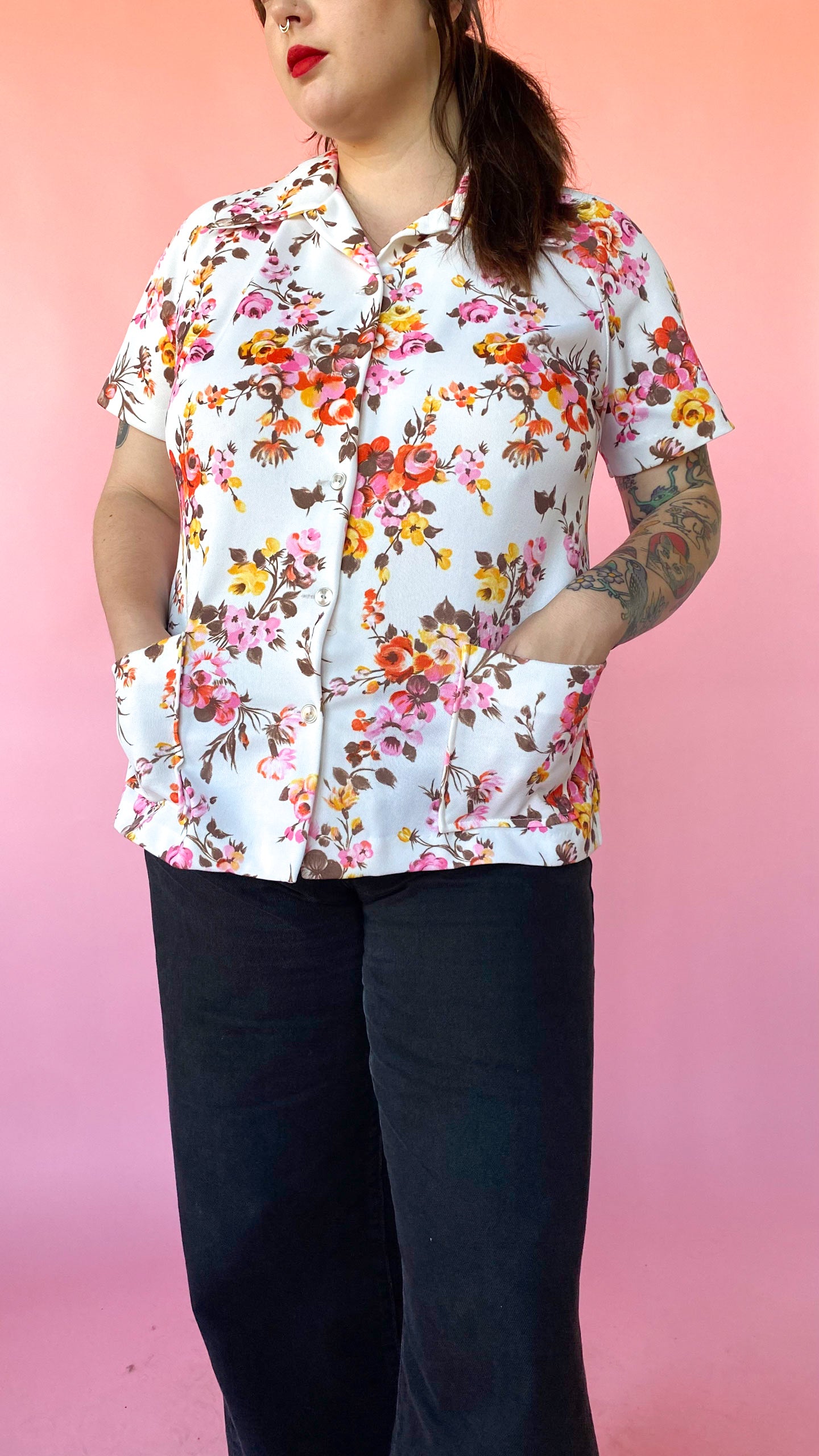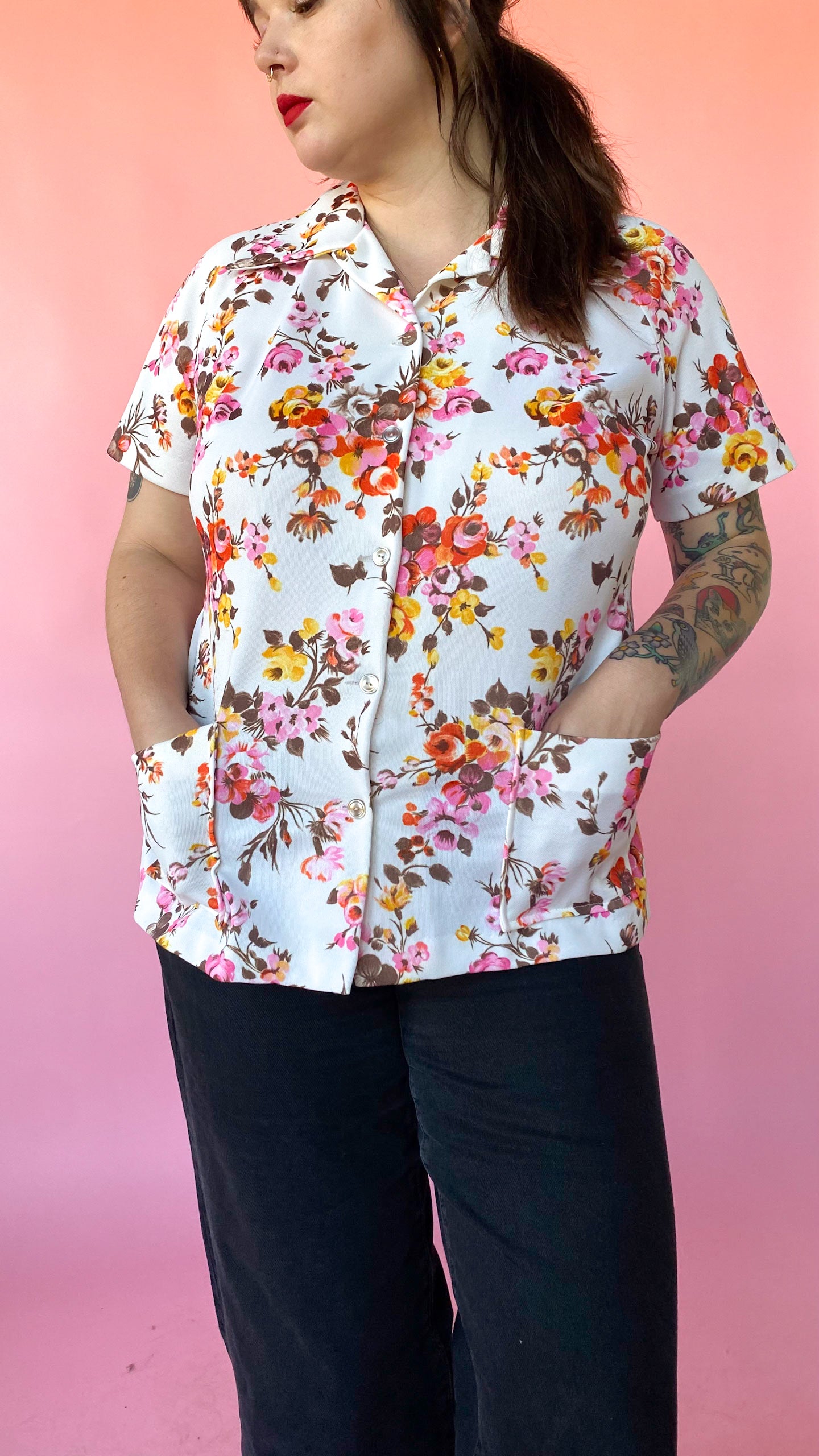 White, short-sleeved, button up top patterned with pink, orange, yellow, and brown flowers. Pointed collar. Two pockets on the front.